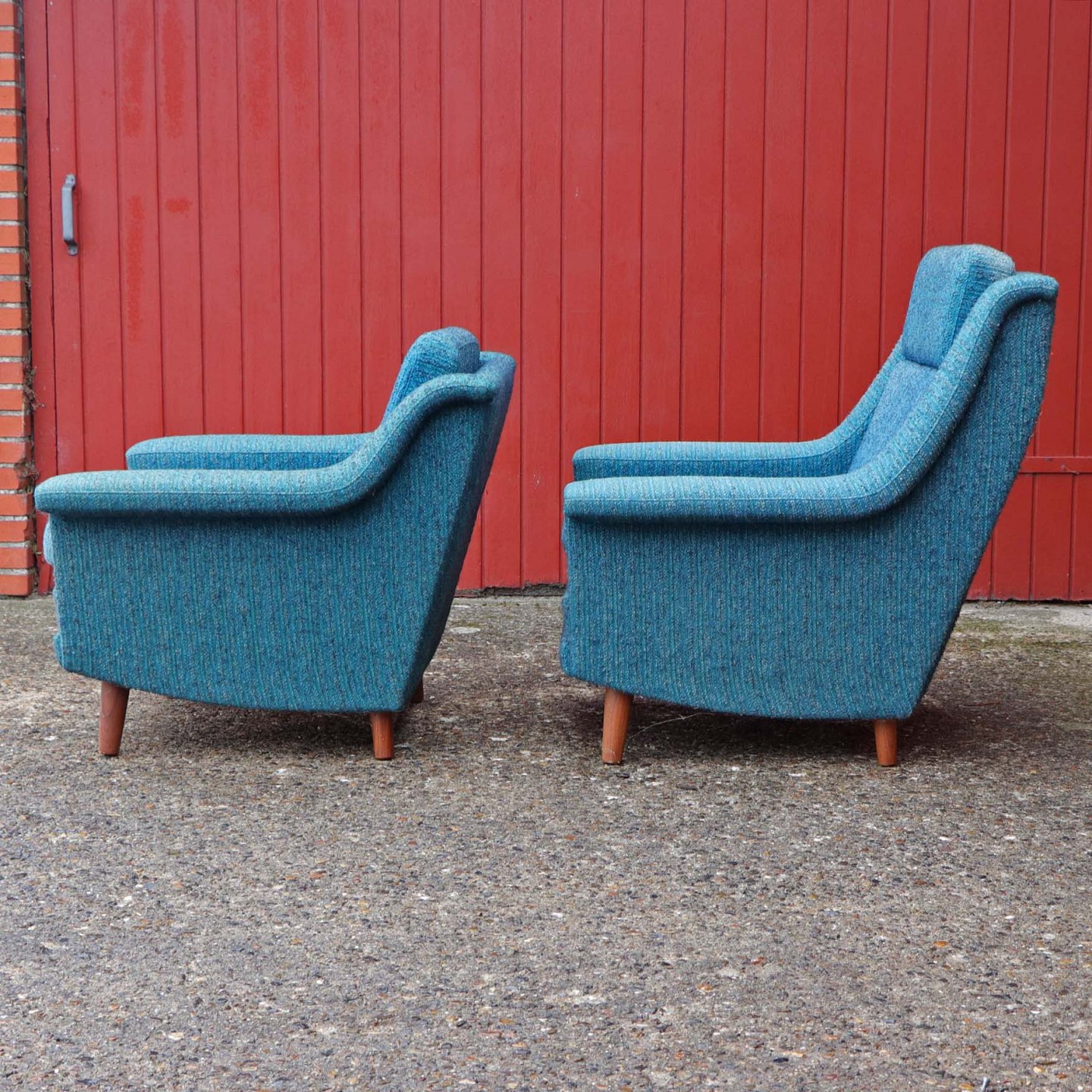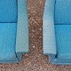 Et sæt med en lav lænestol og en højrygget lænestol. Stolene er betrukket med meleret turkis uldstof og har ben af matlakeret teaktræ