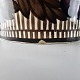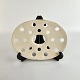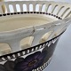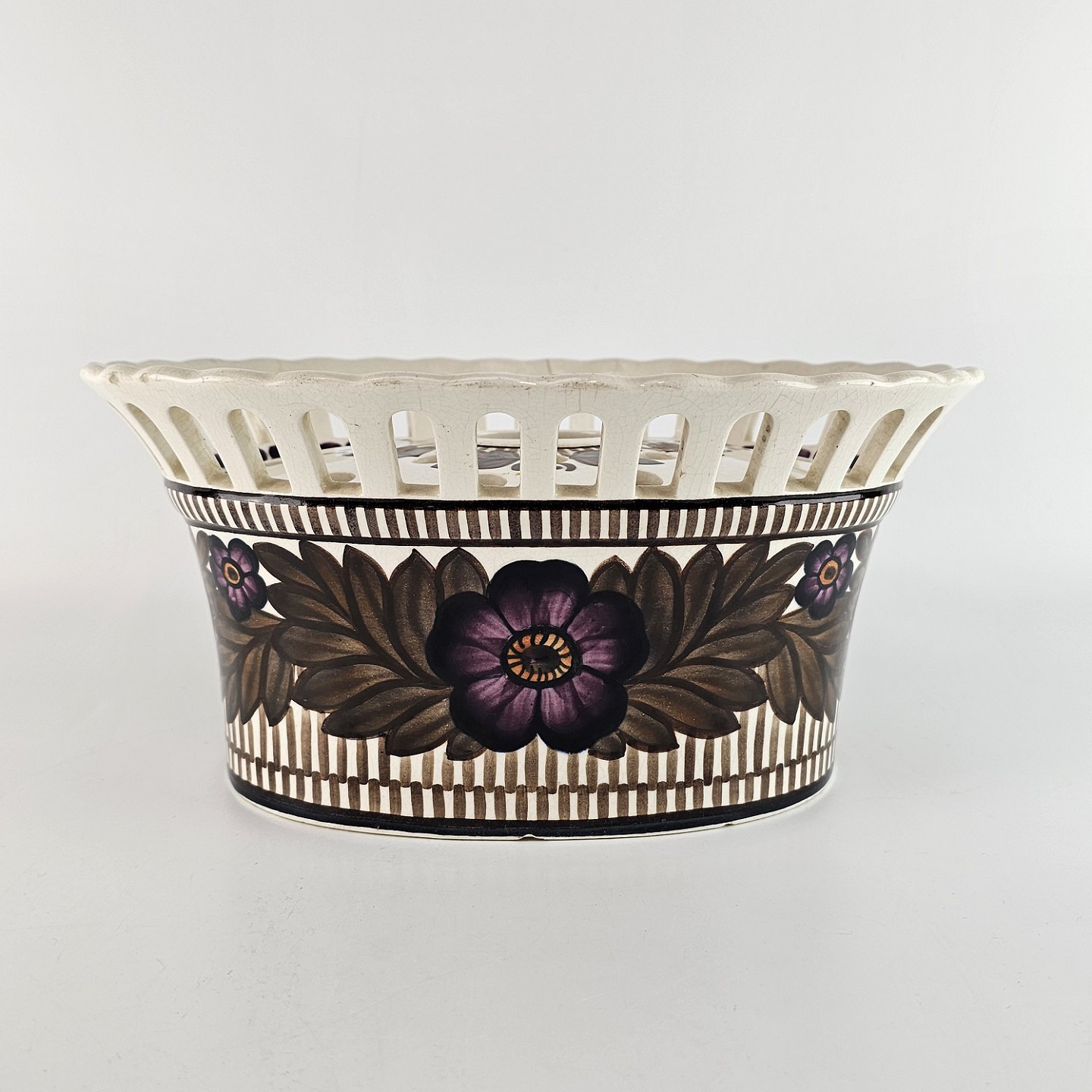 Oval jardiniere med låg i fajance. Blomsterskålen er med brun og lilla dekoration på en lys baggrund. Nr. 863/720