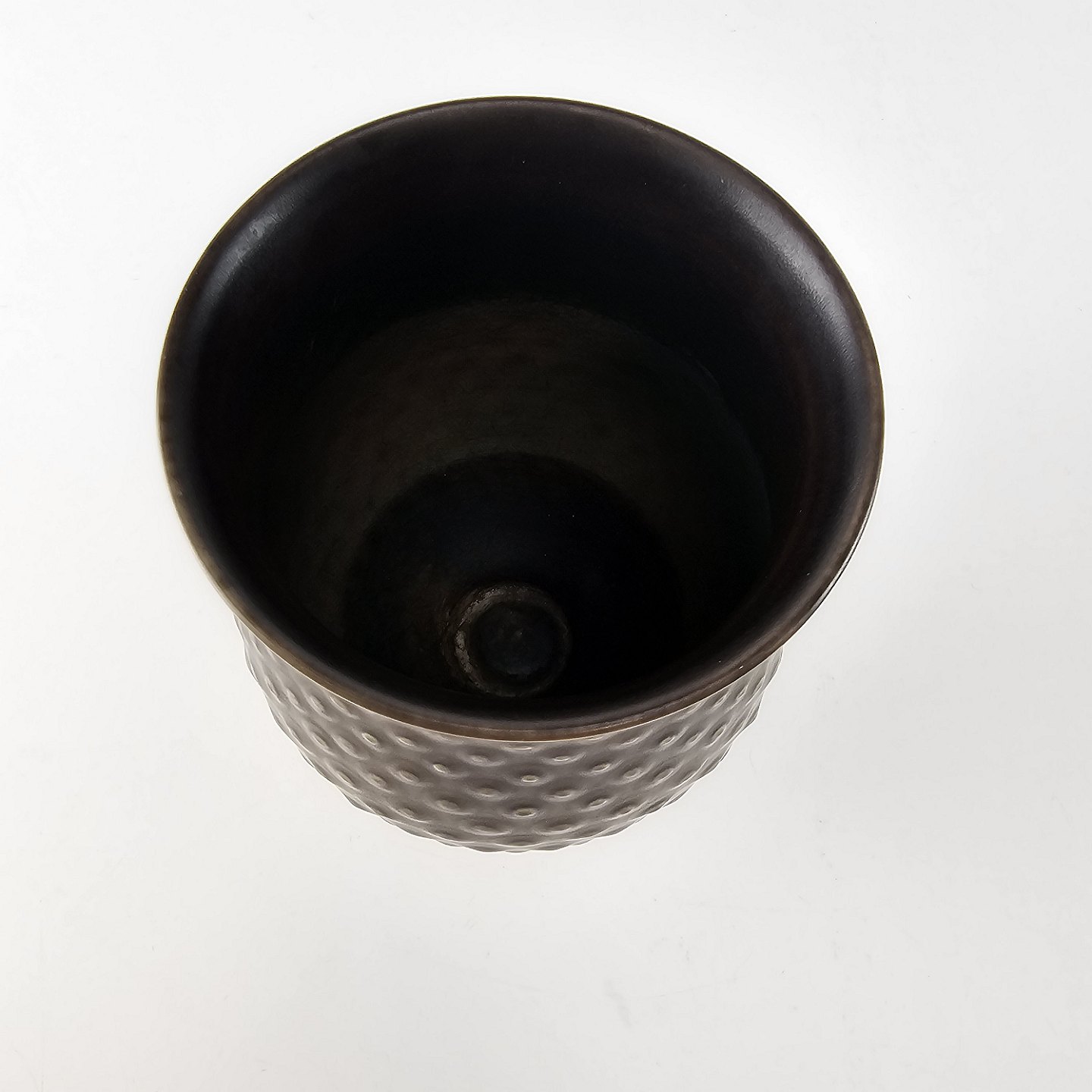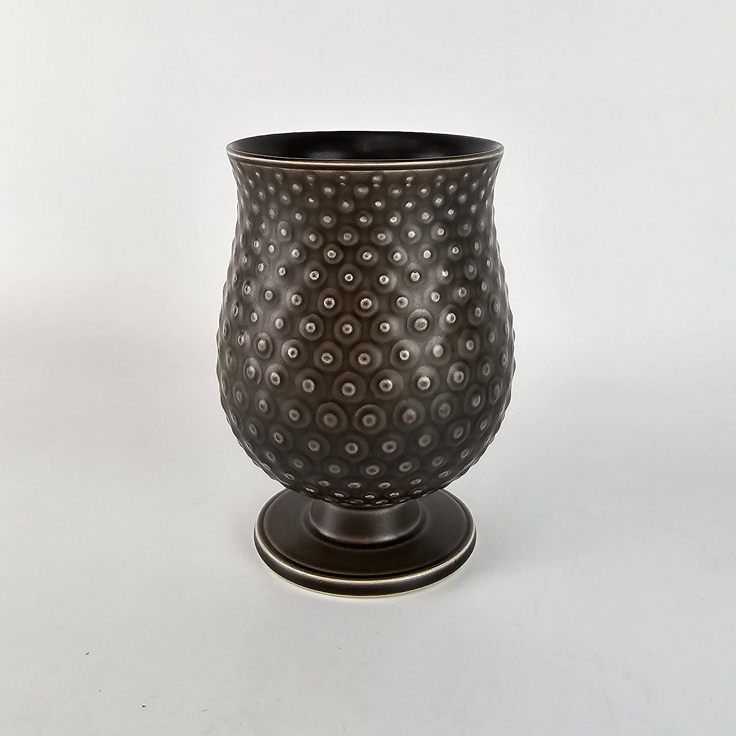 Brun pæreformet vase på lav fod i kunstfajance. Model Solbjerg nr. 1689