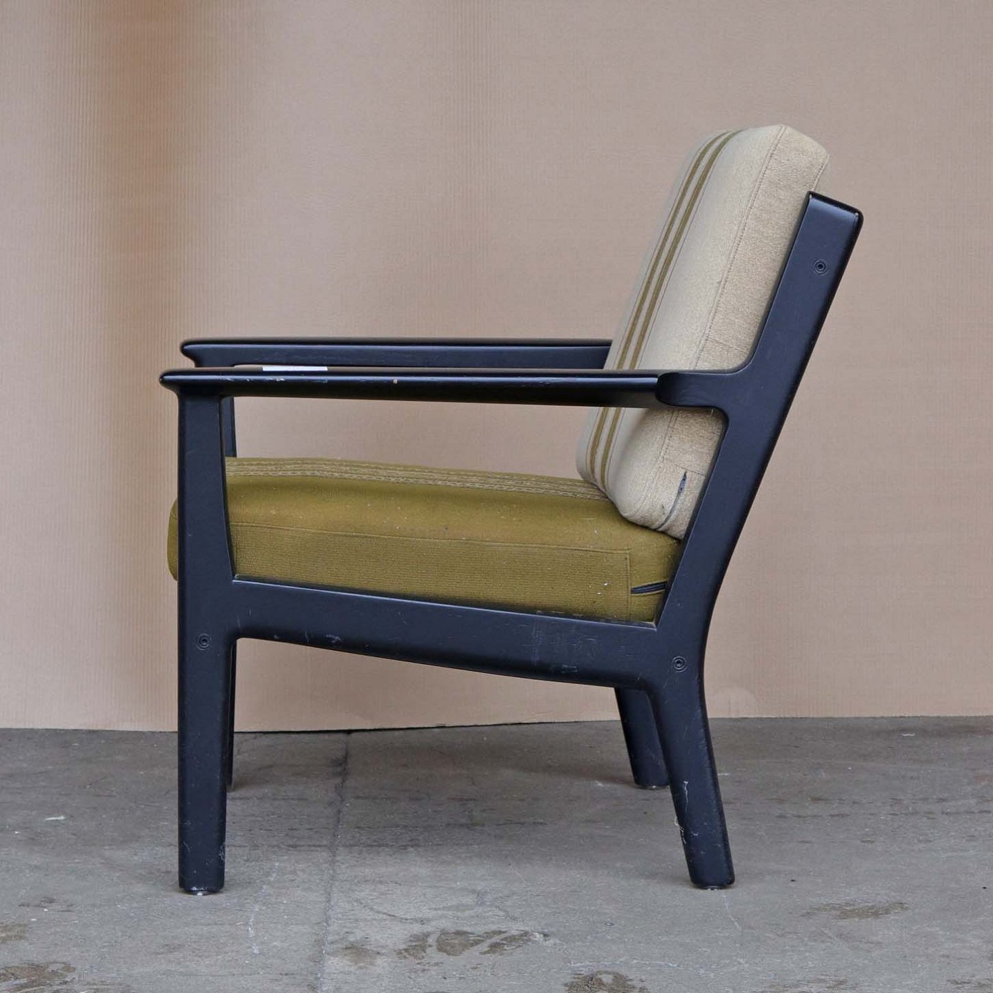 Lænestol med i sortlakeret træ og hynder med sprinfjeder betrukket med grønt mønstret uldstof.