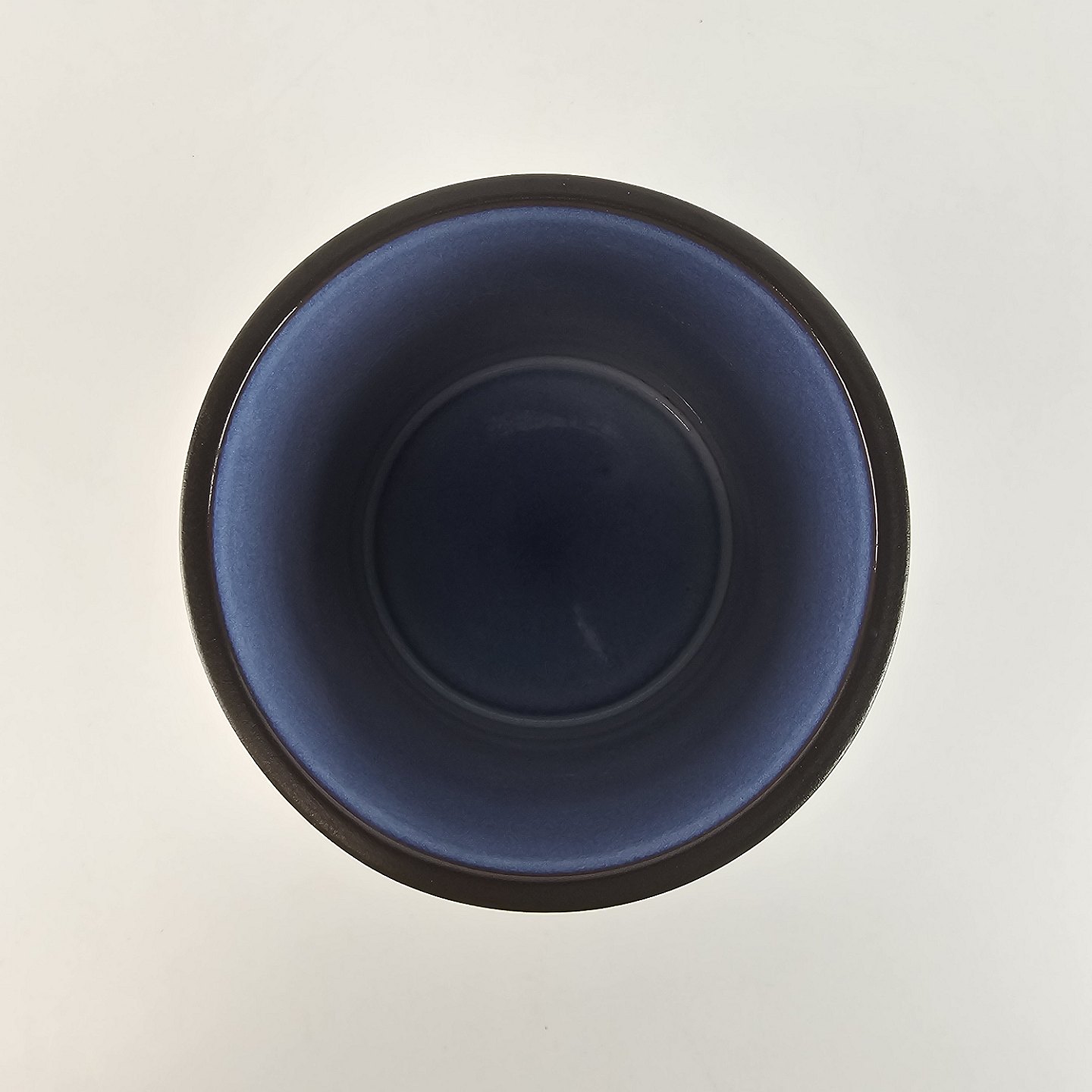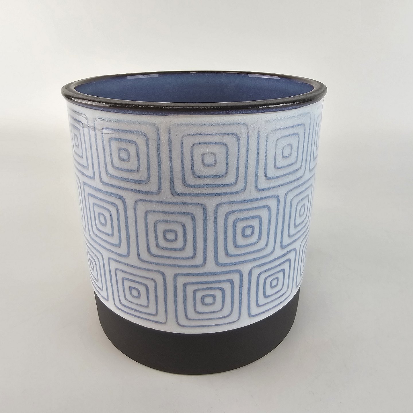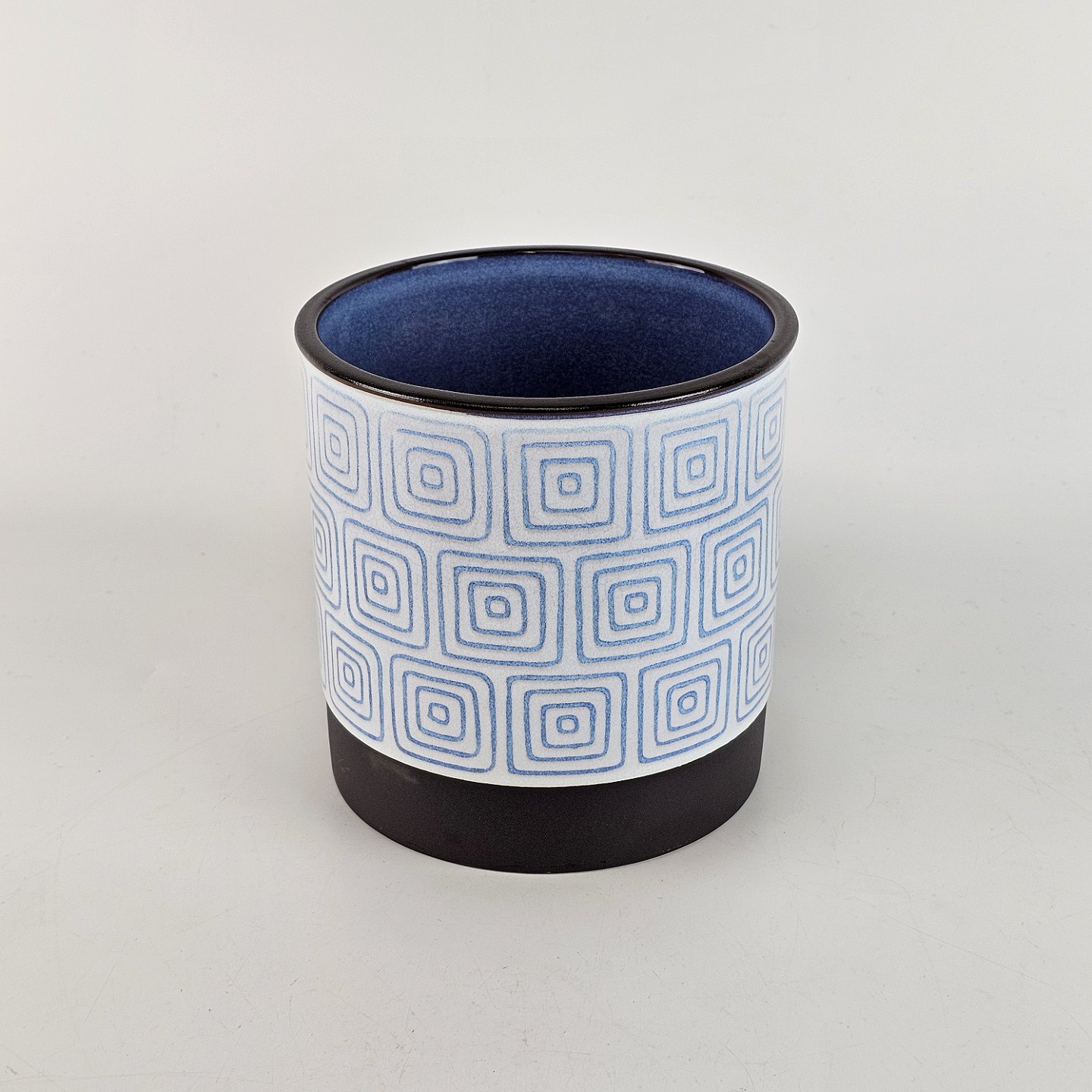 Aluminia Urtepotte af kunstfajance, med blåt mønster på hvid baggrund og sorte ringe om kant og bund.