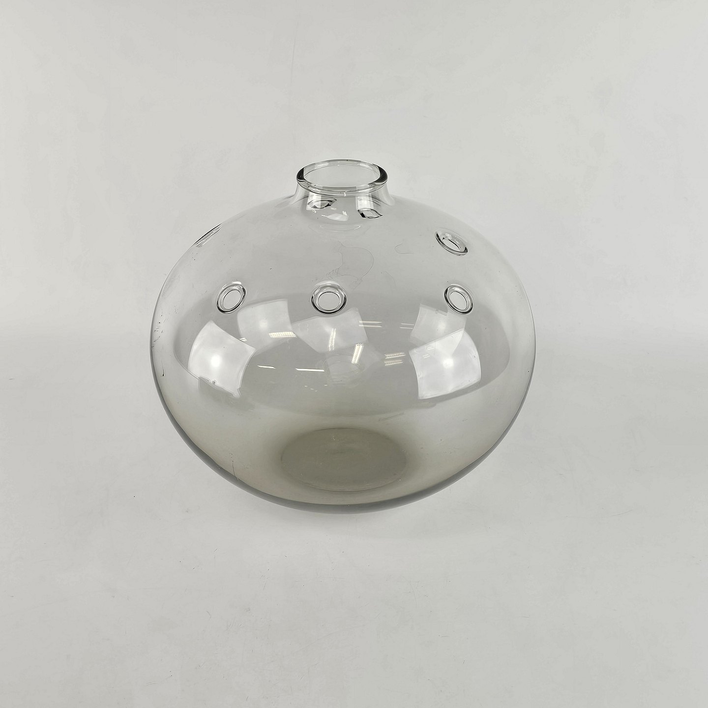 Kugleformet vase med lille åbning og syv huller.
