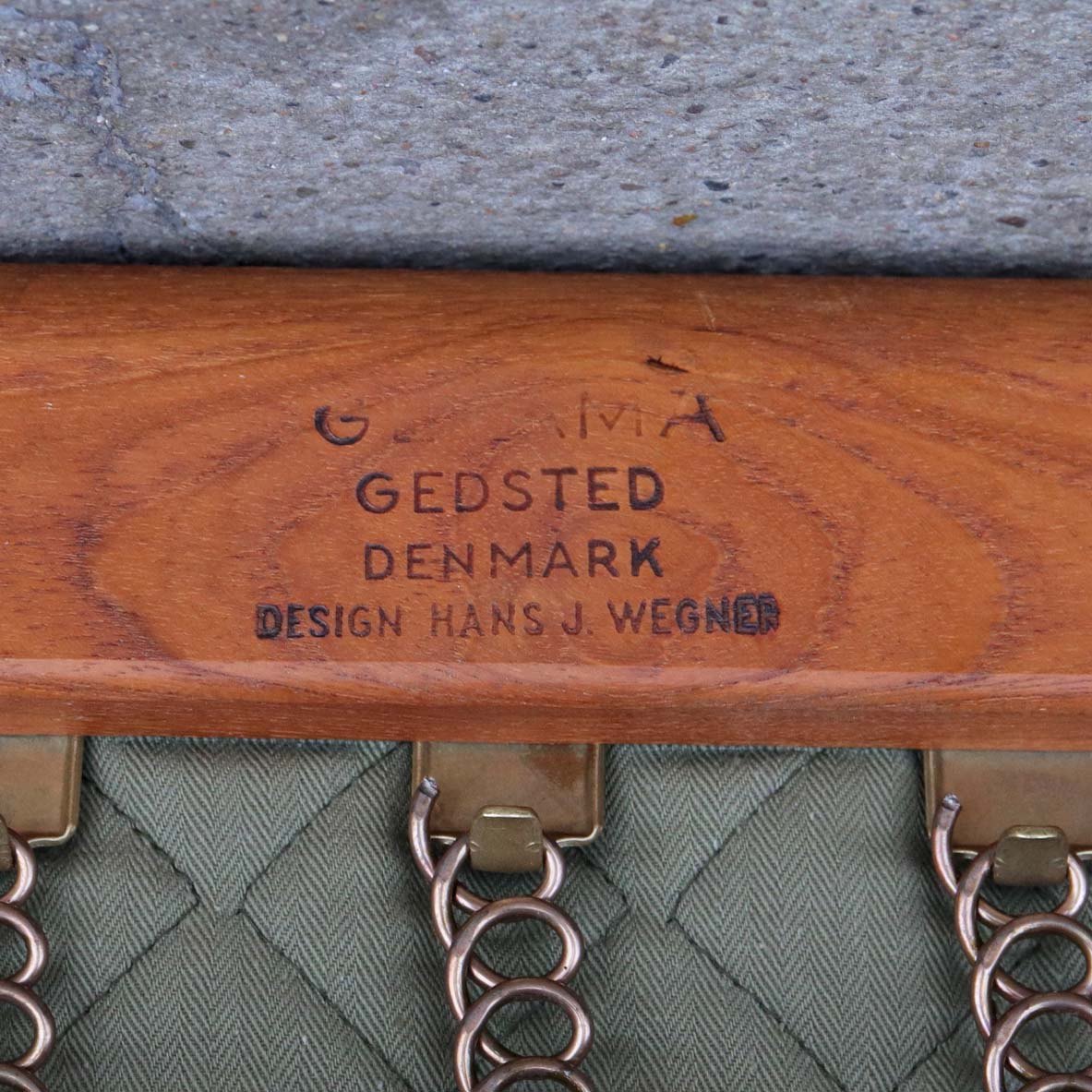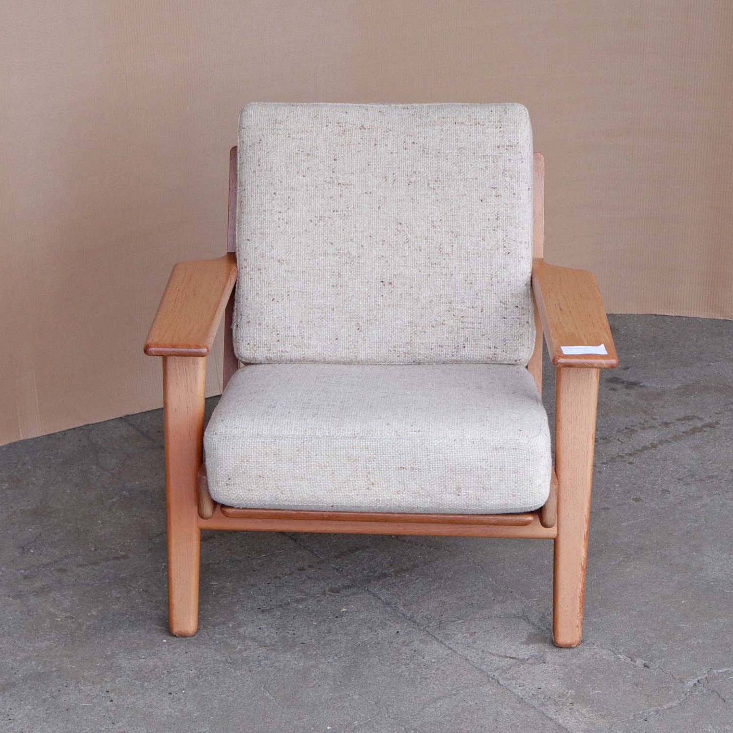 Lænestol med stel i lakeret lyst teaktræ og hynder med springfjeder. Hynderne er betrukket med meleret råhvidt uldstof. Model GE 290