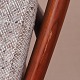 Højrygget lænestol fra 1970erne med stel i lakeret teaktræ og hynder med springfjeder. Hynderne er betrukket med lyst meleret uldstof og nakkepuden holdes på plads af remme i lyst kernelæder