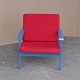 Lænestol med stel i blålakeret teaktræ og hynder betrukket med rødt uldstof, model Capella
