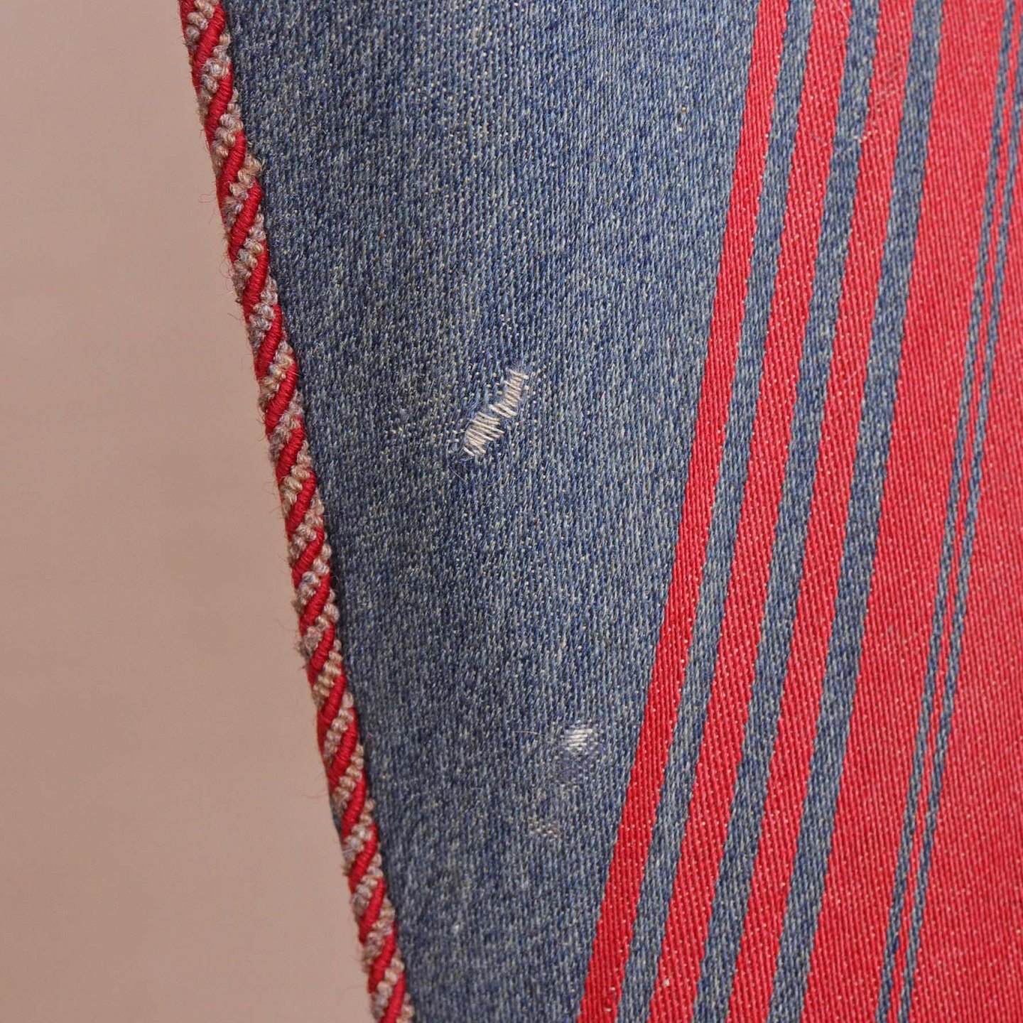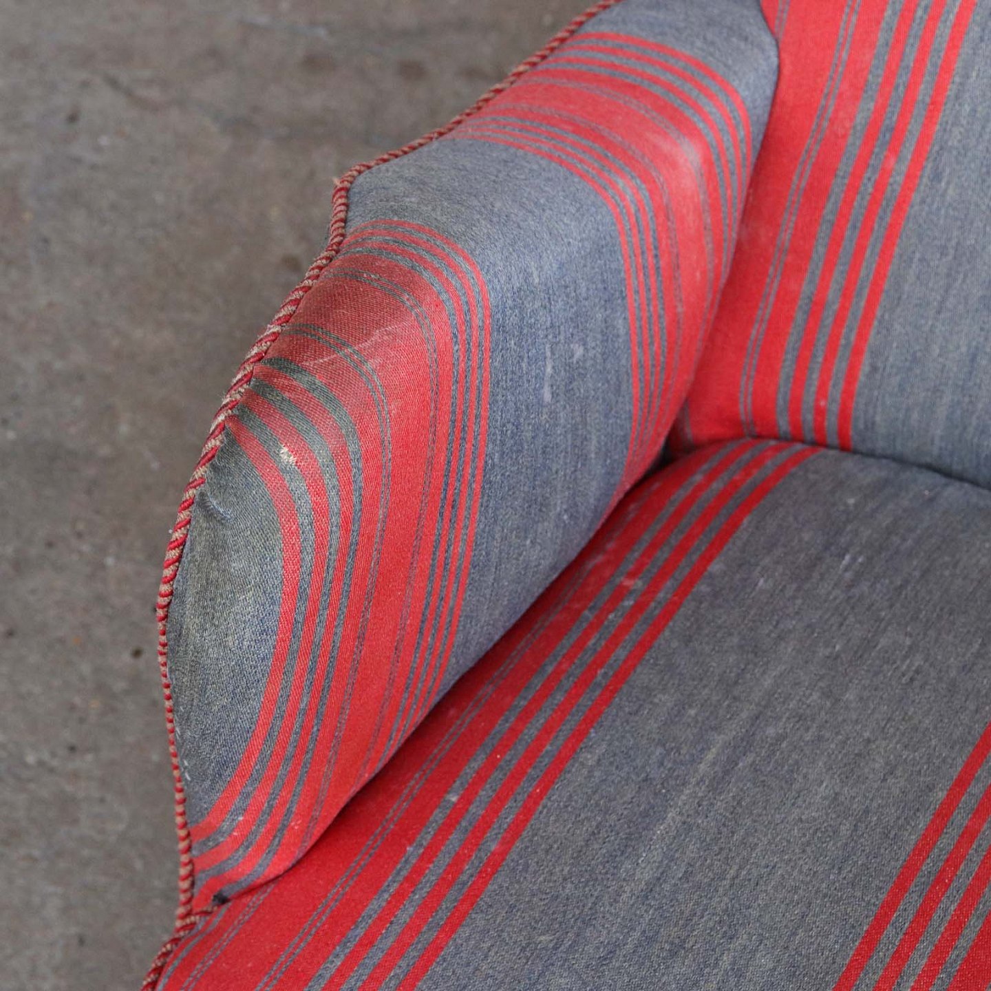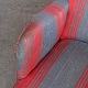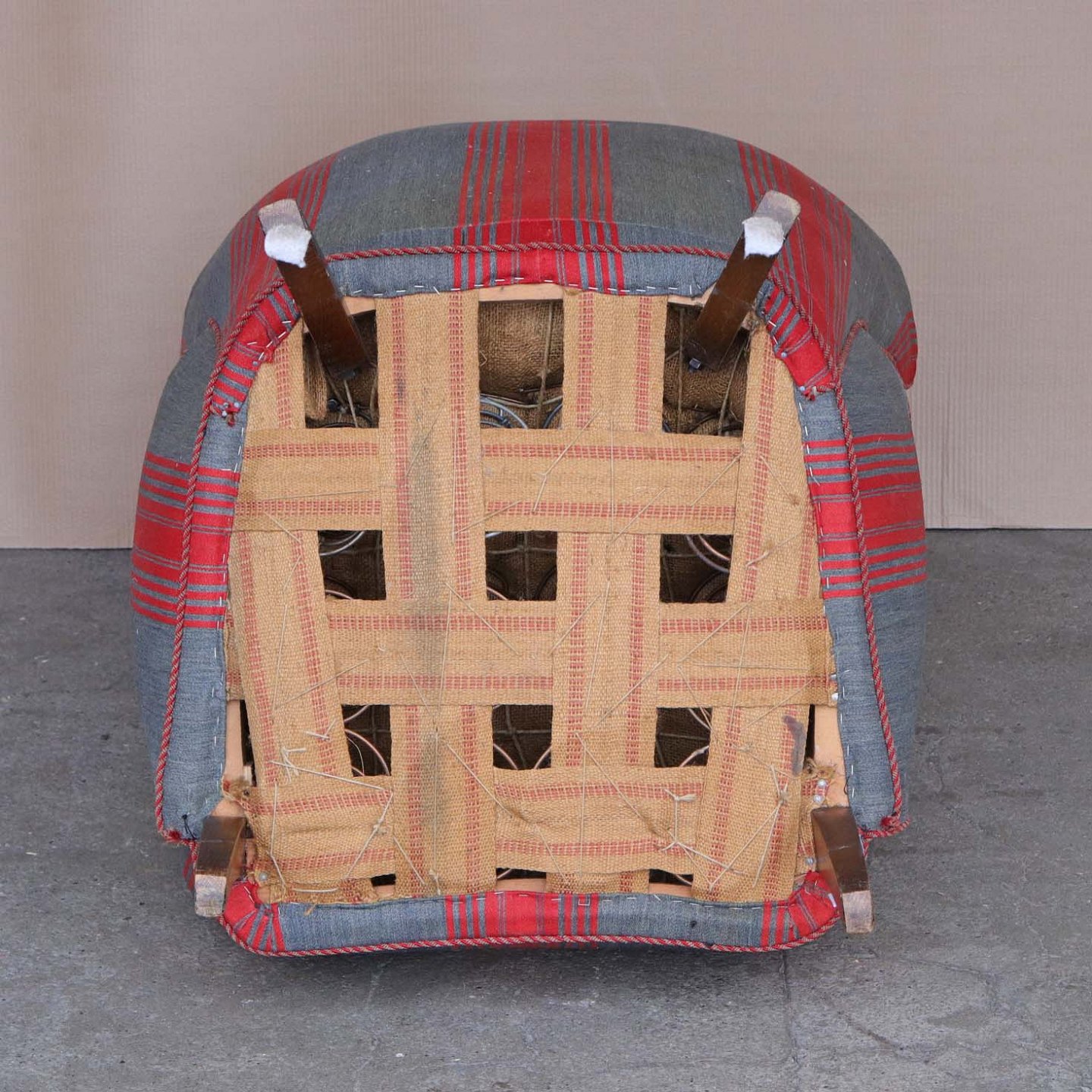 Ældre lænestol med springfjeder sæde og ben af mørk lakeret træ. Stolen er betrukket med gråt og rød stibet stof