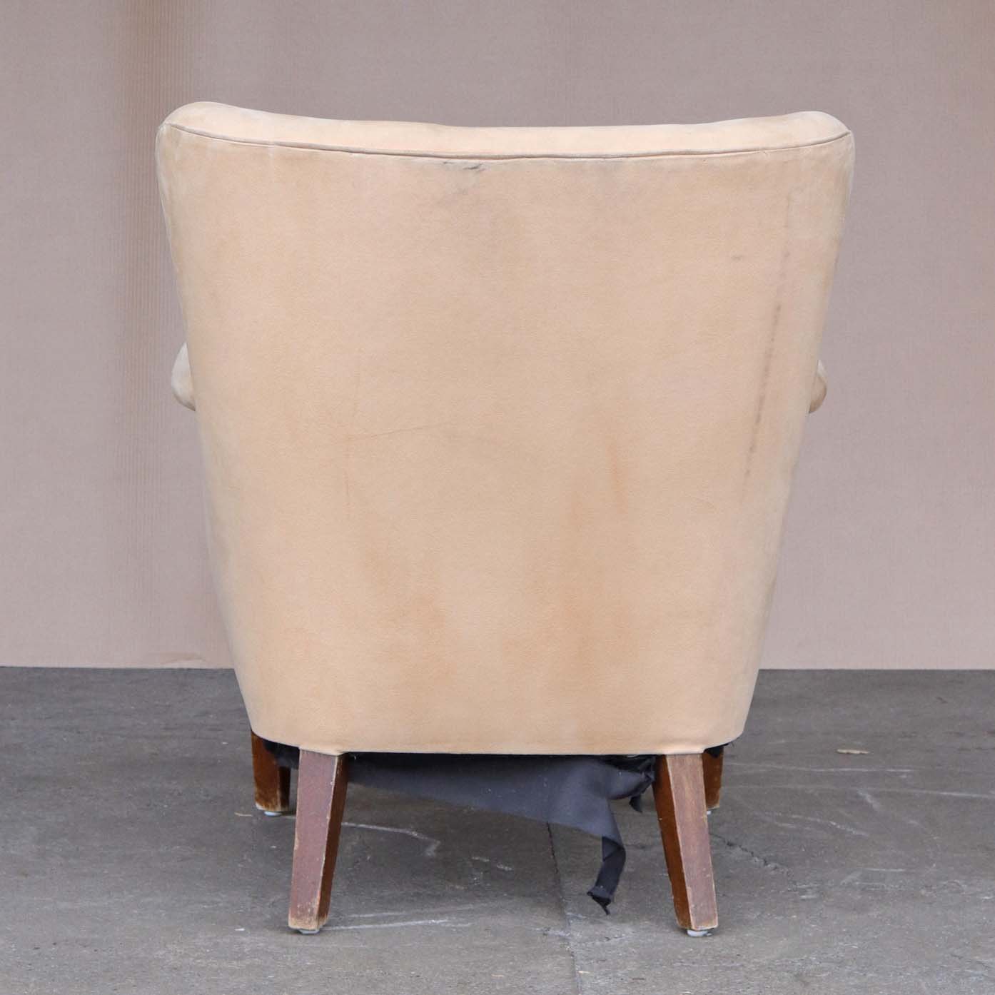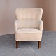 Lænestol med springfjeder sæde og stel i mørk lakeret træ. Stolen betrukket med lys beige smudsafvisende stof