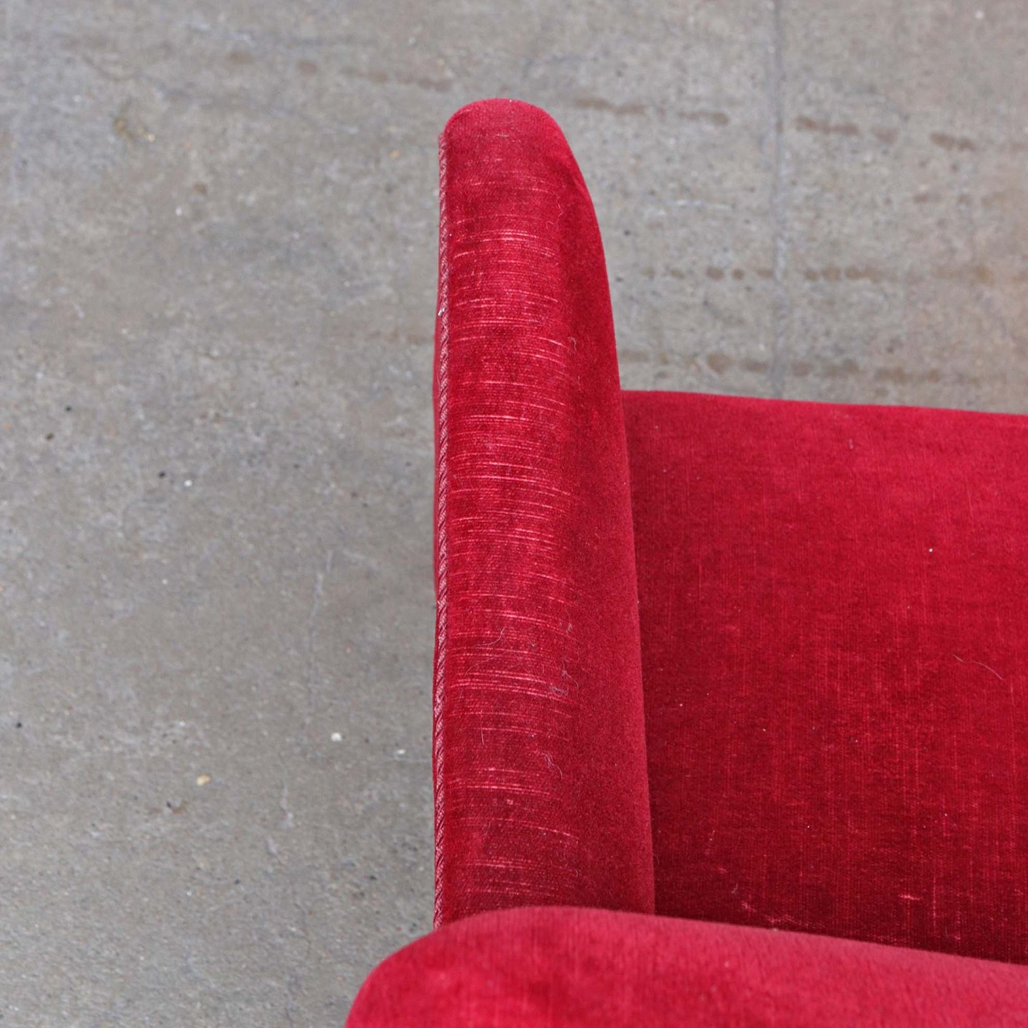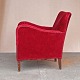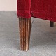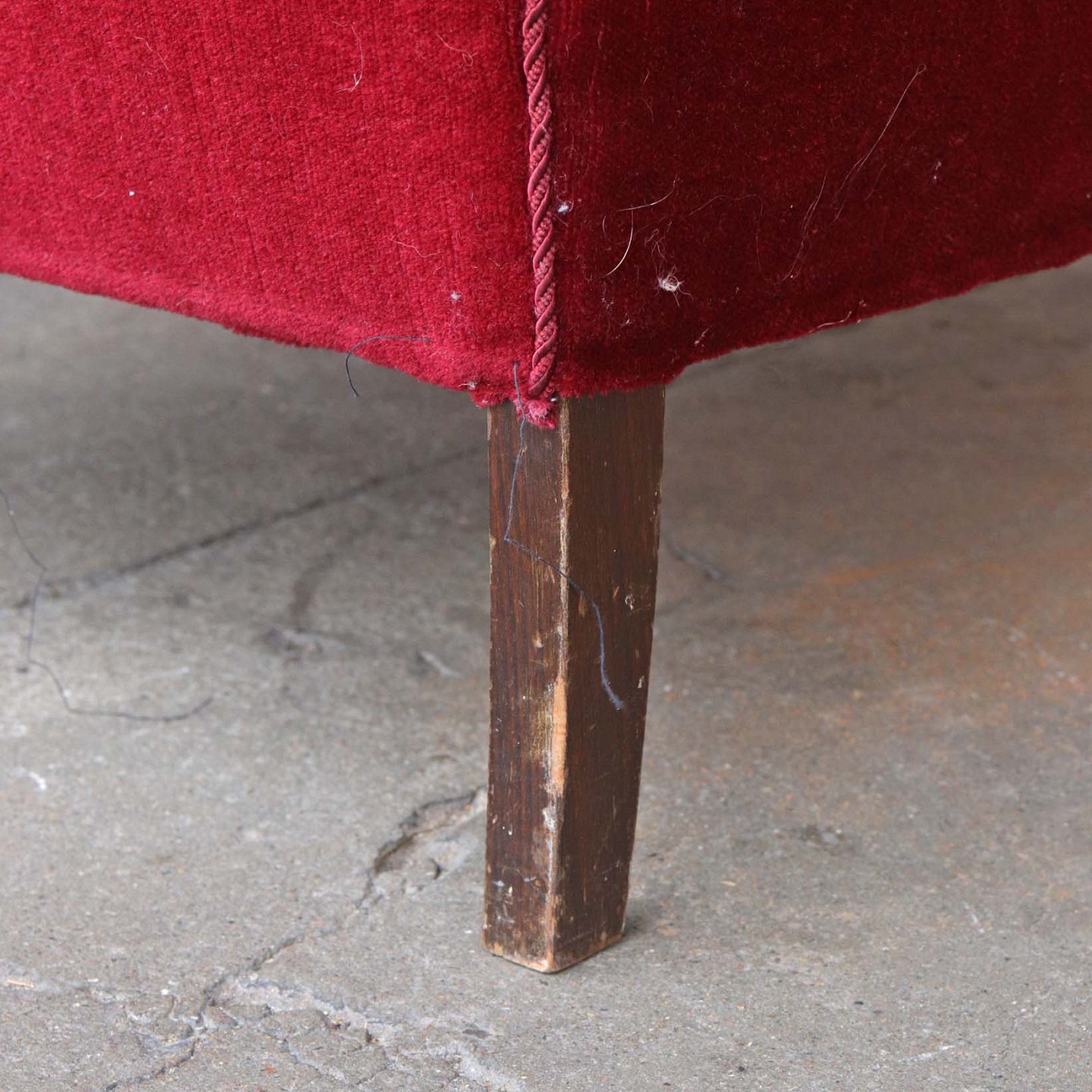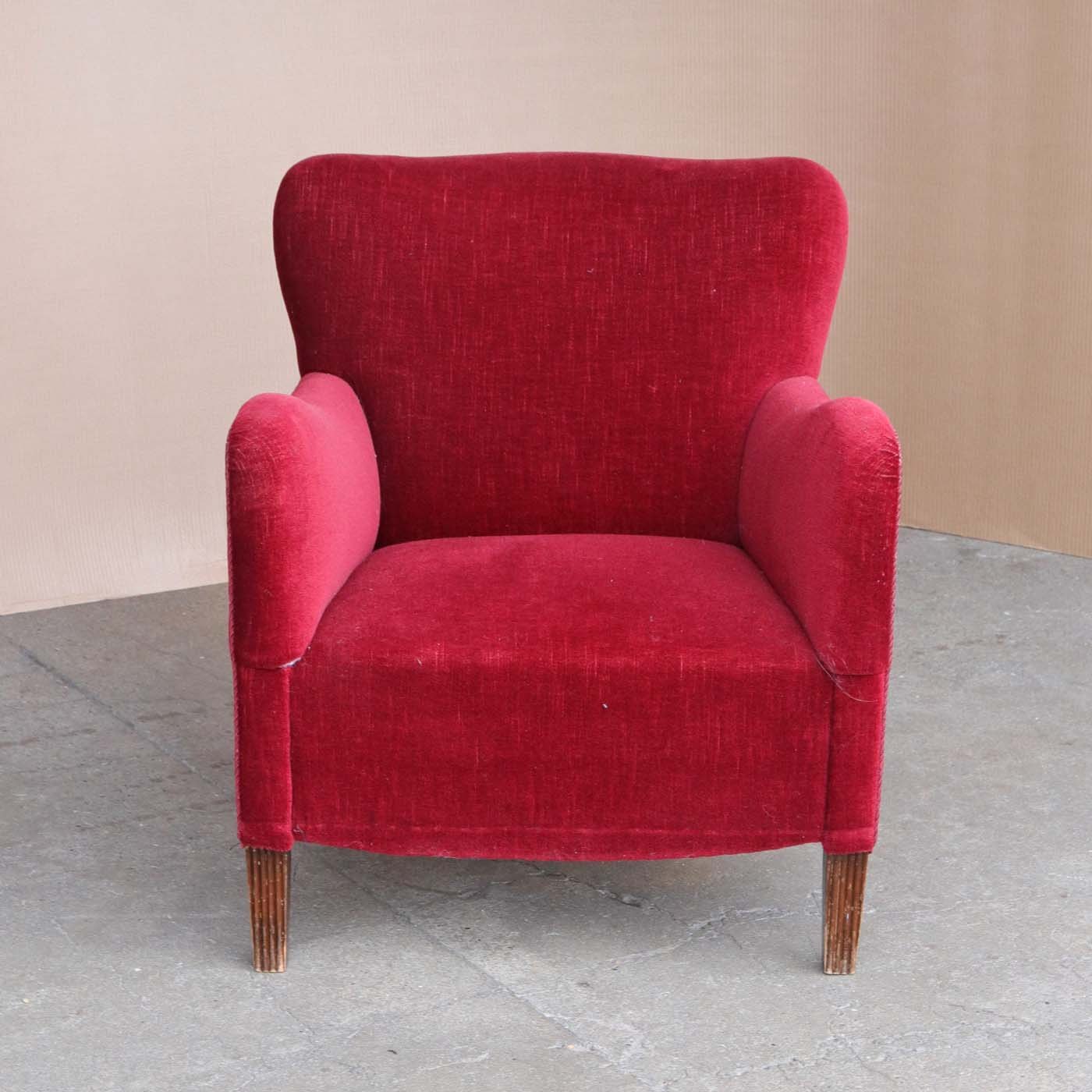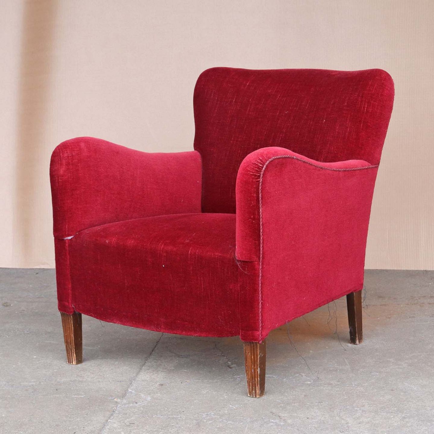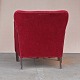 Ældre polstret lænestol med springfjeder sæde. Stolen er betrukket med rødt velour stof