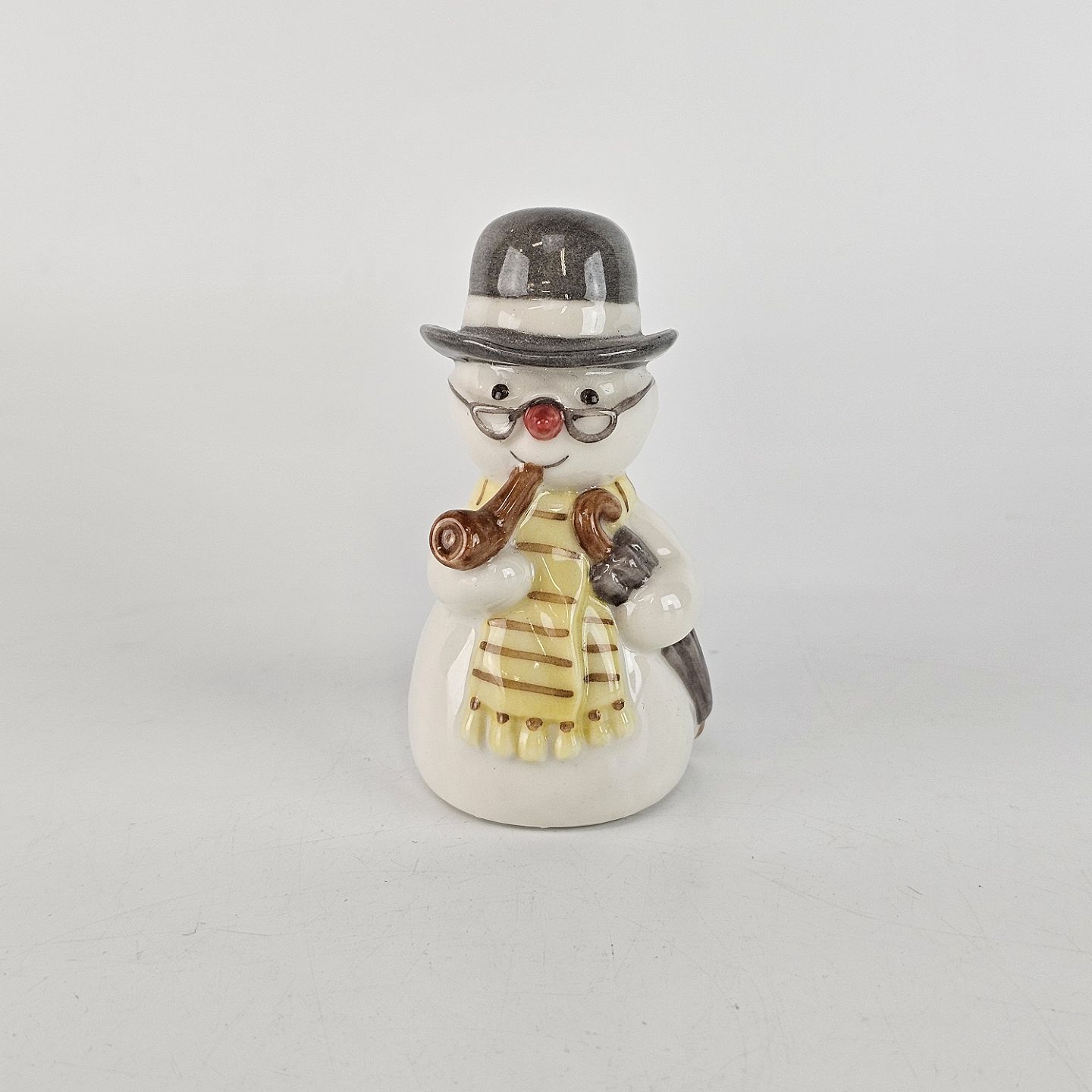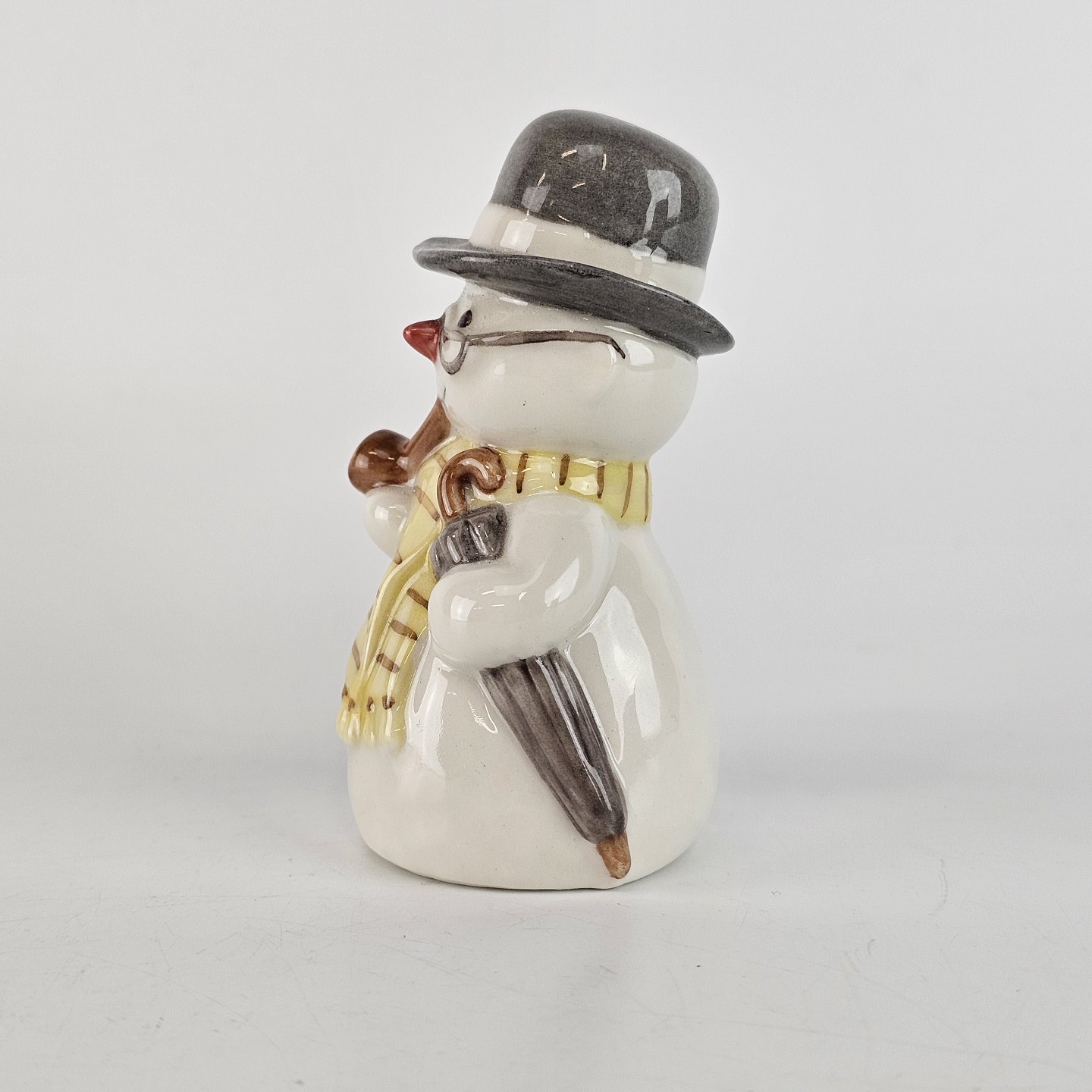 Porcelænsfigur fra snemandsserien med motiv af en snemand med høj hat, pibe og paraply.
