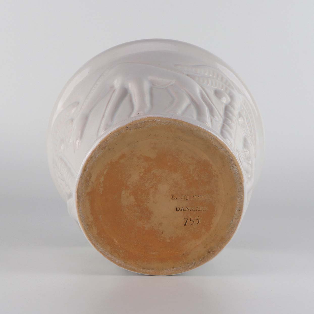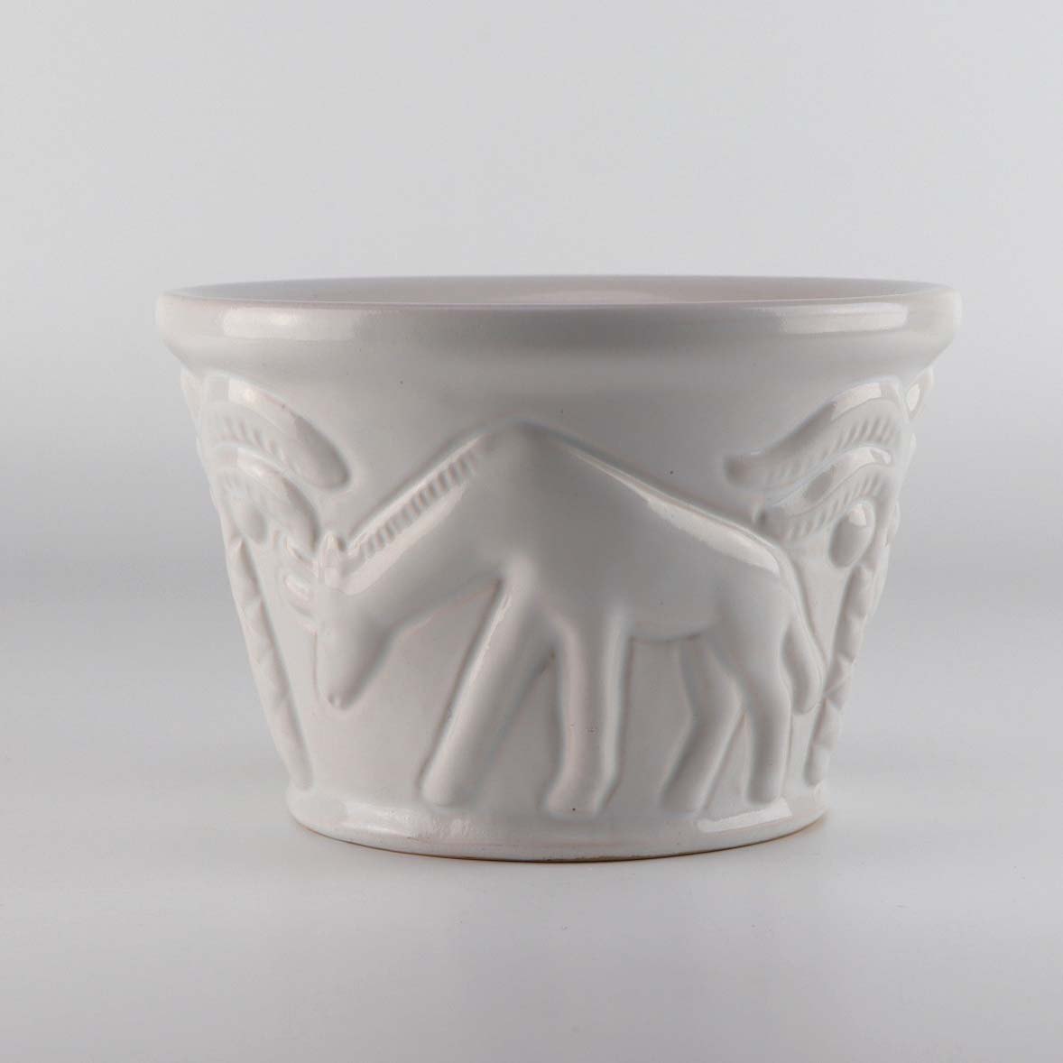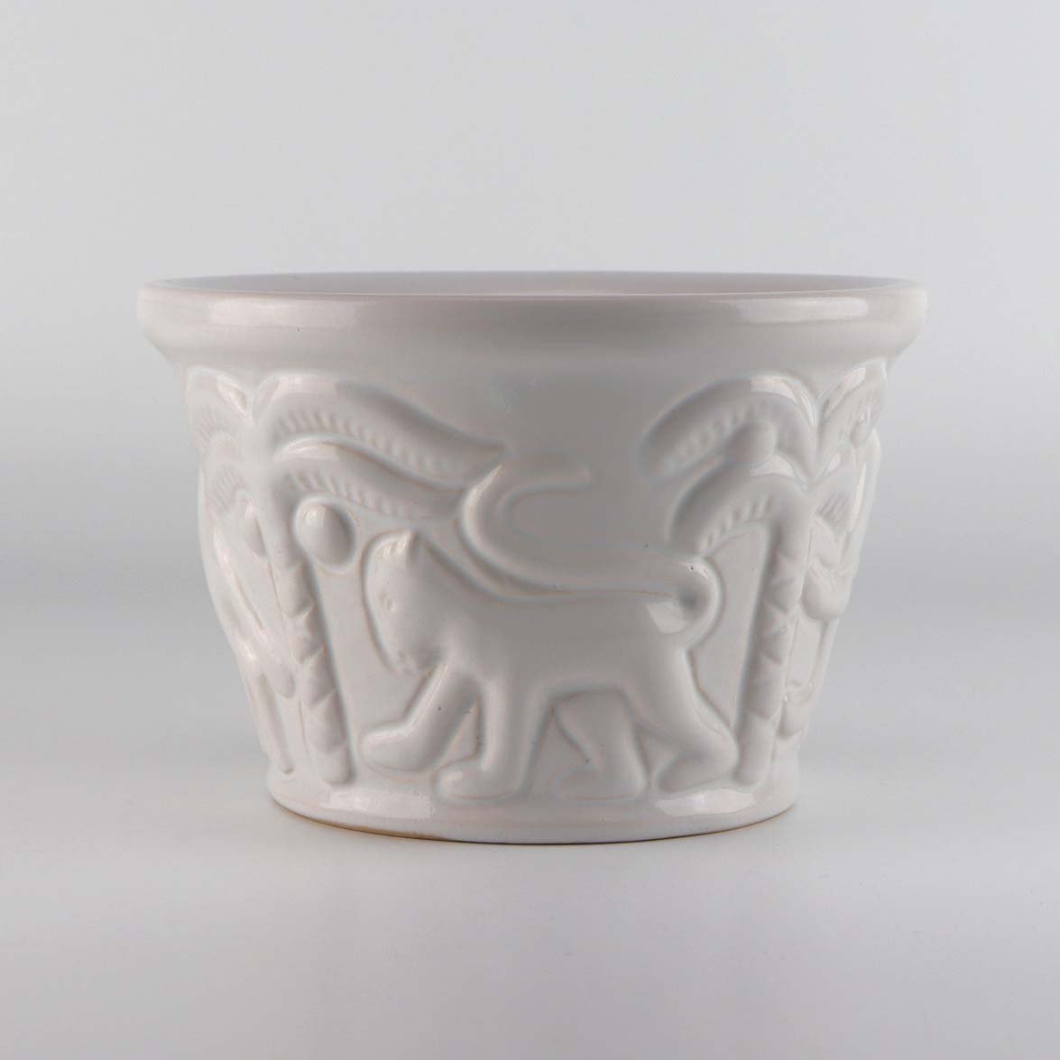 Urtepotteskjuler i hvidglaseret keramik med motiv af elefant, giraf og panter blandt palmetræer. Nr. 755