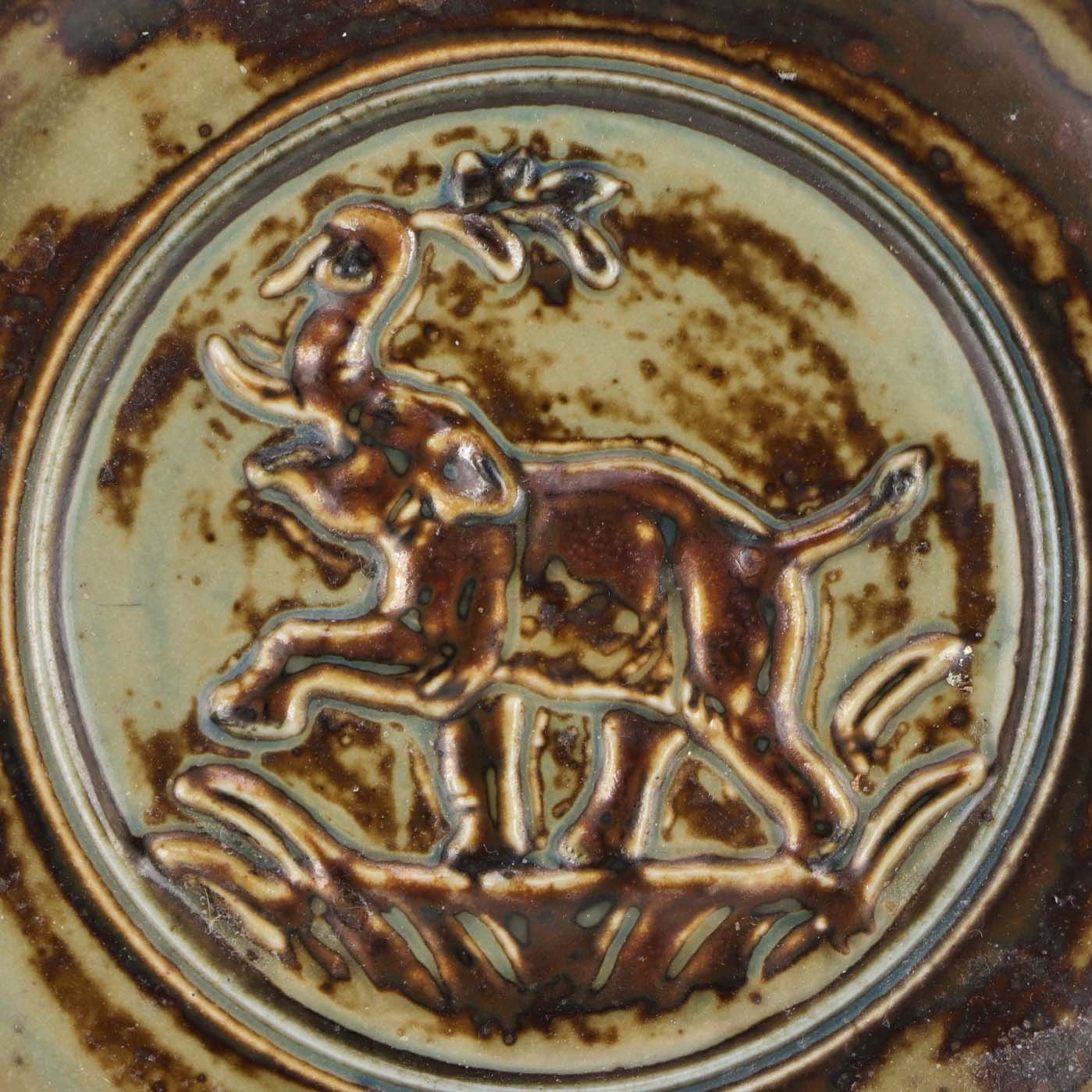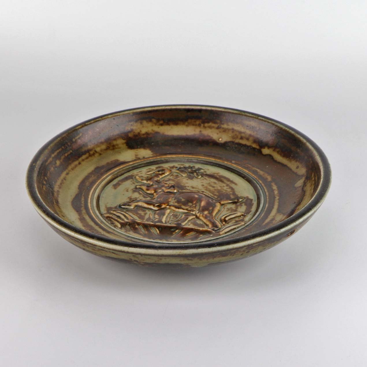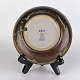 Mindre rundt fad i brunt stentøj med motiv af en elefant med løftet snabel. Nr. 21213