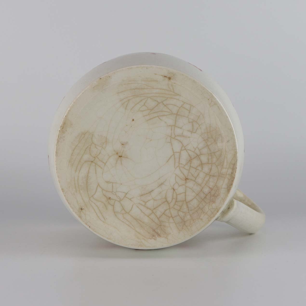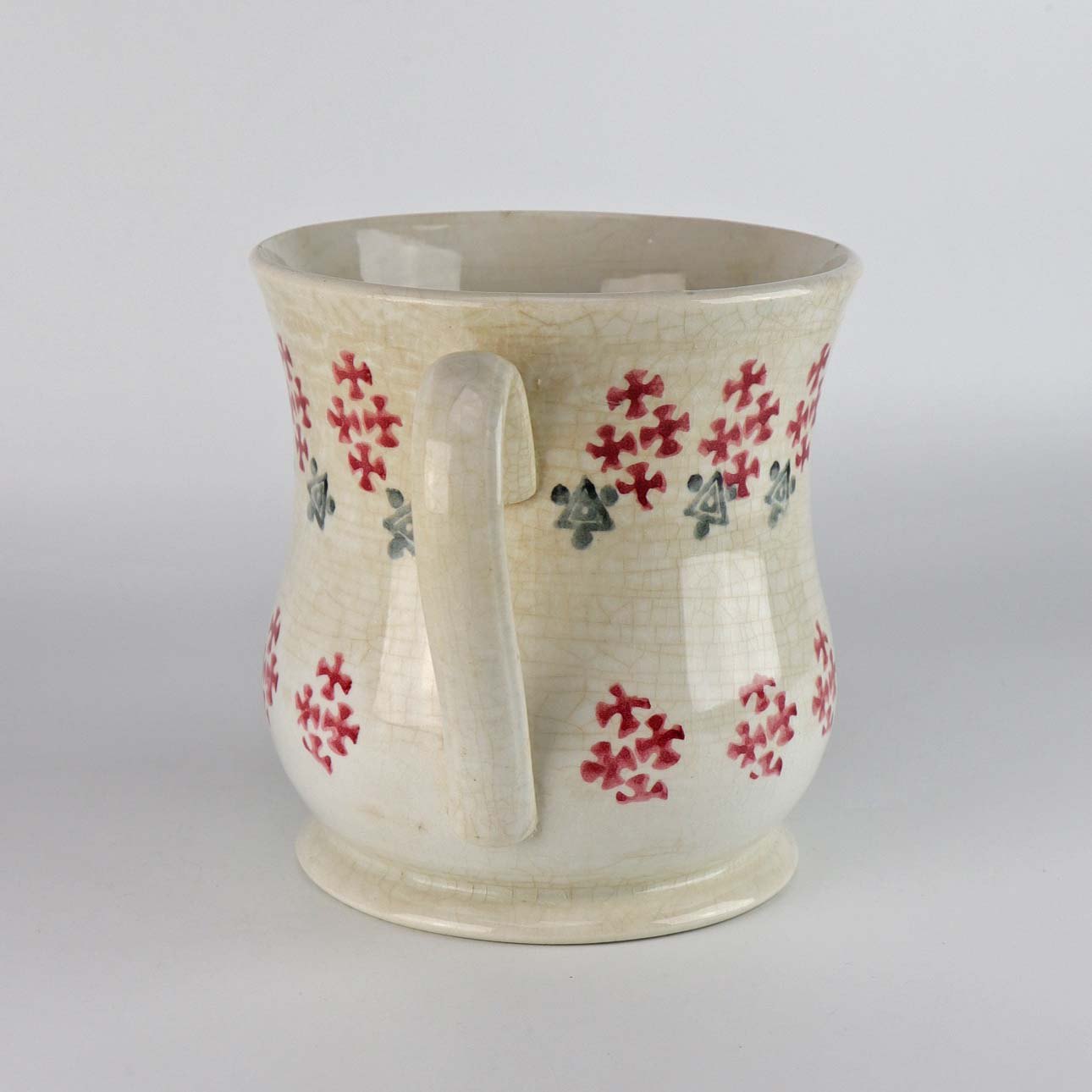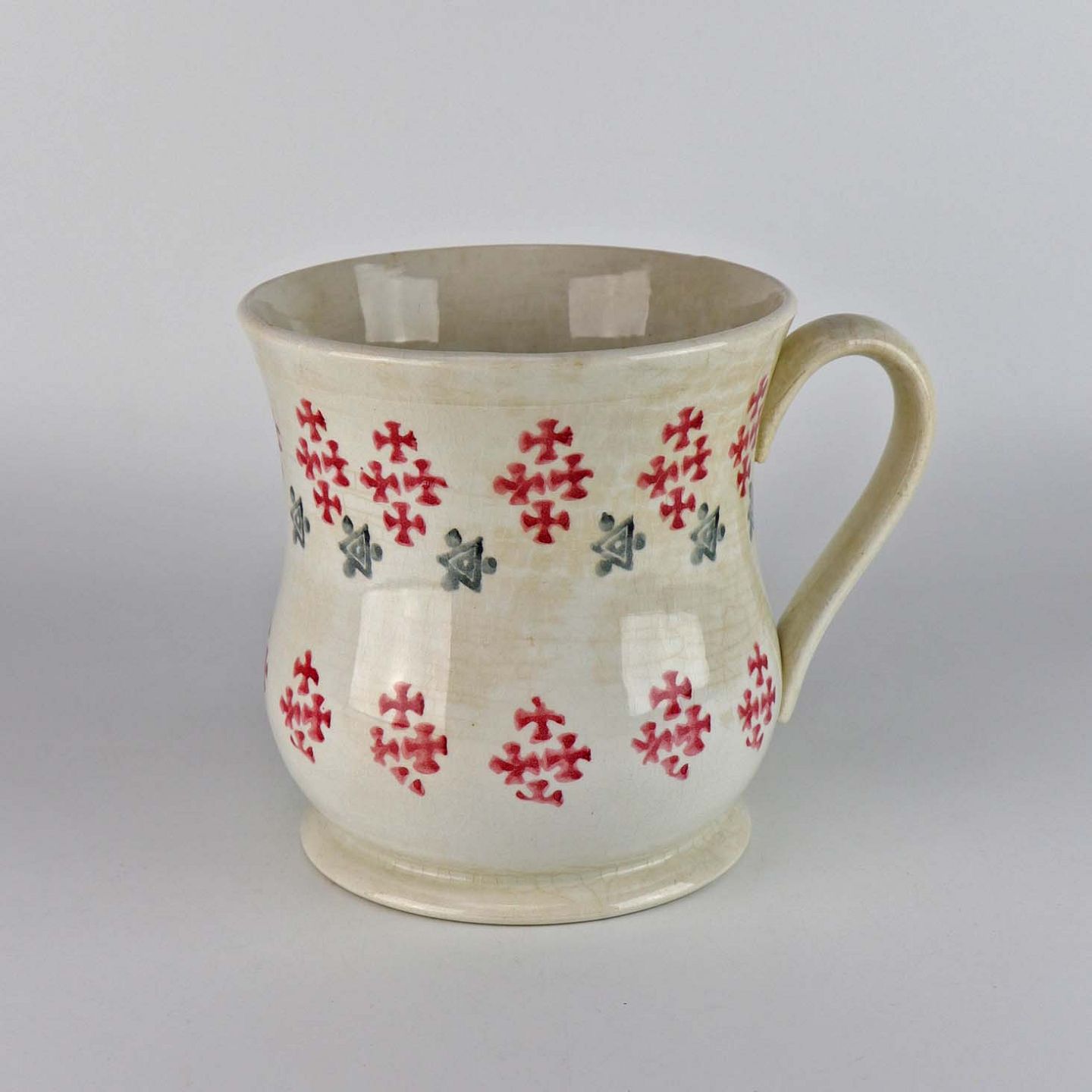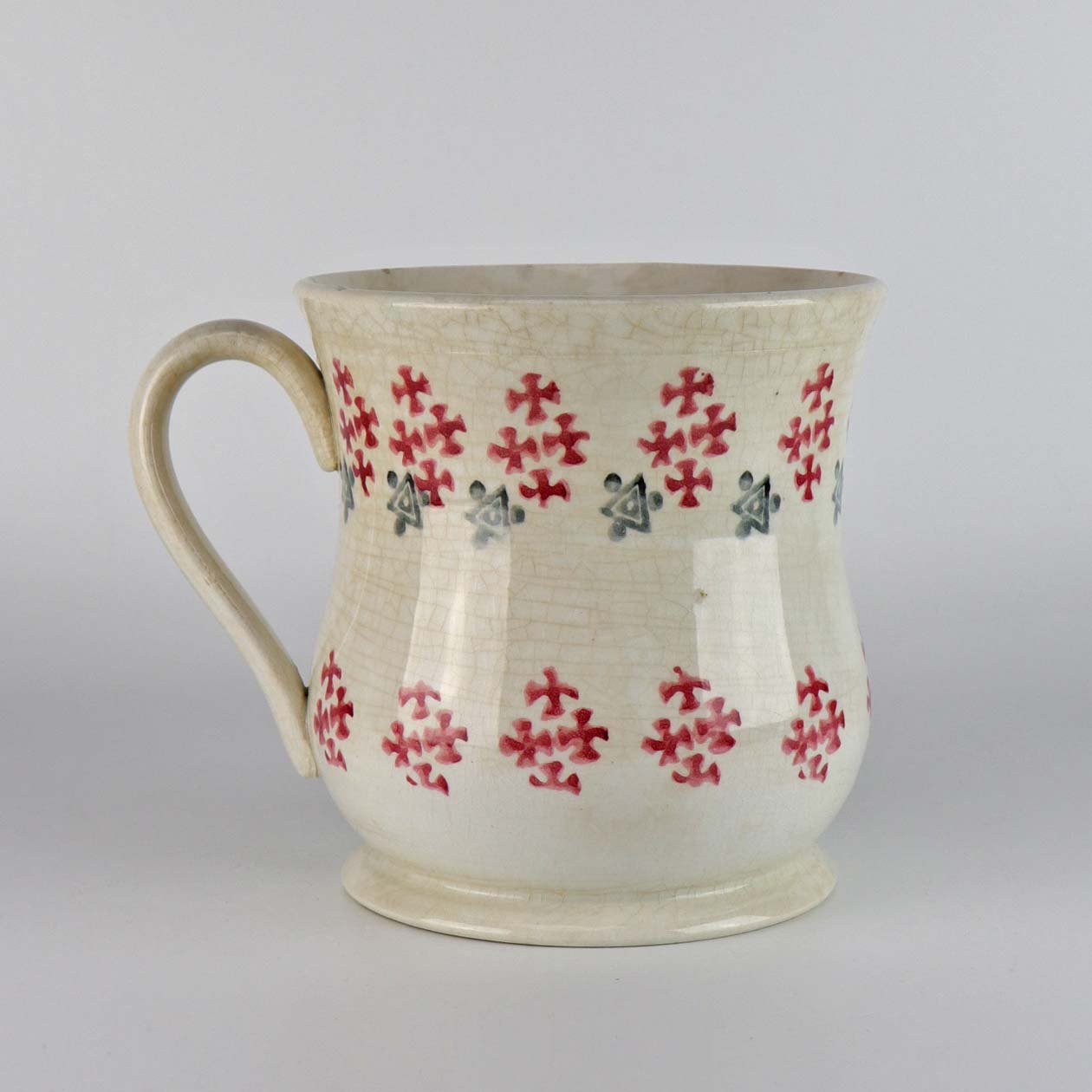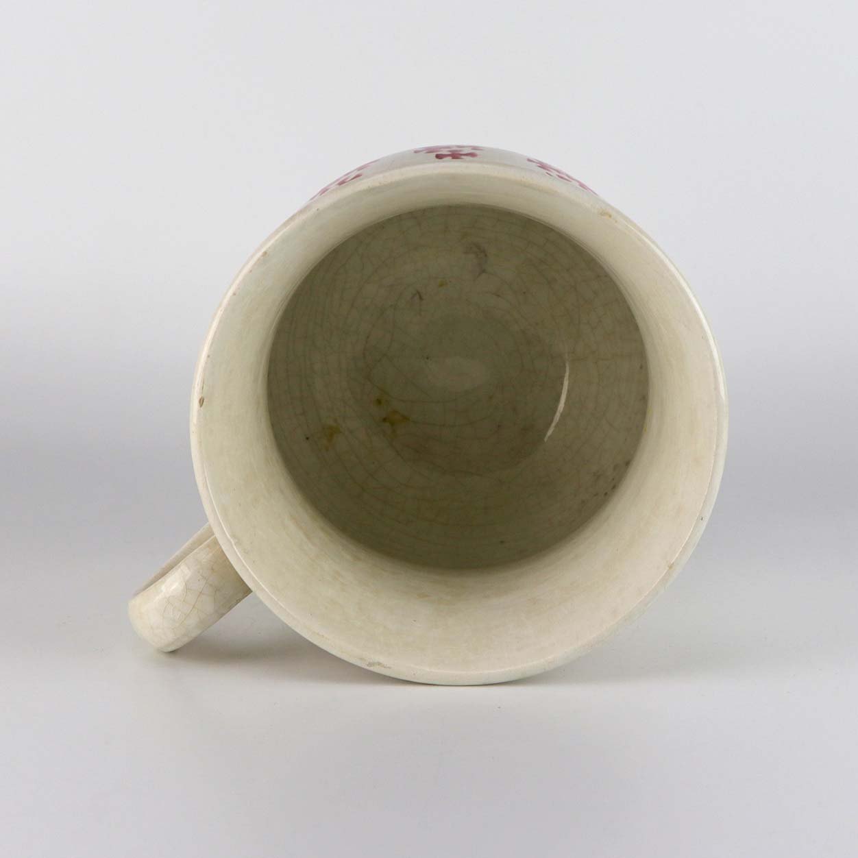 Antik ølkrus i fajance, som også er kendt under navnet Portlands krus. Dette krus er fremstillet i perioden år 1870-1923 og er dekoreret med svampetryk i sort og rød farve