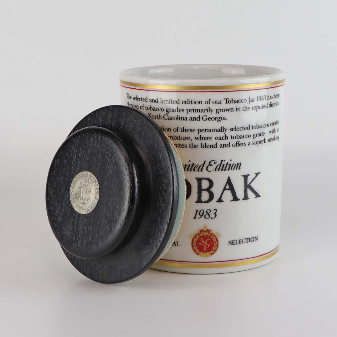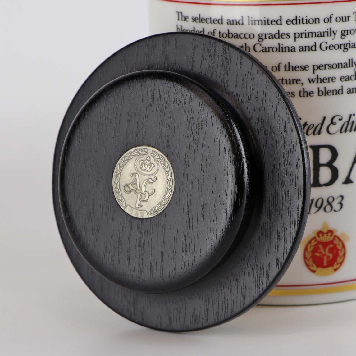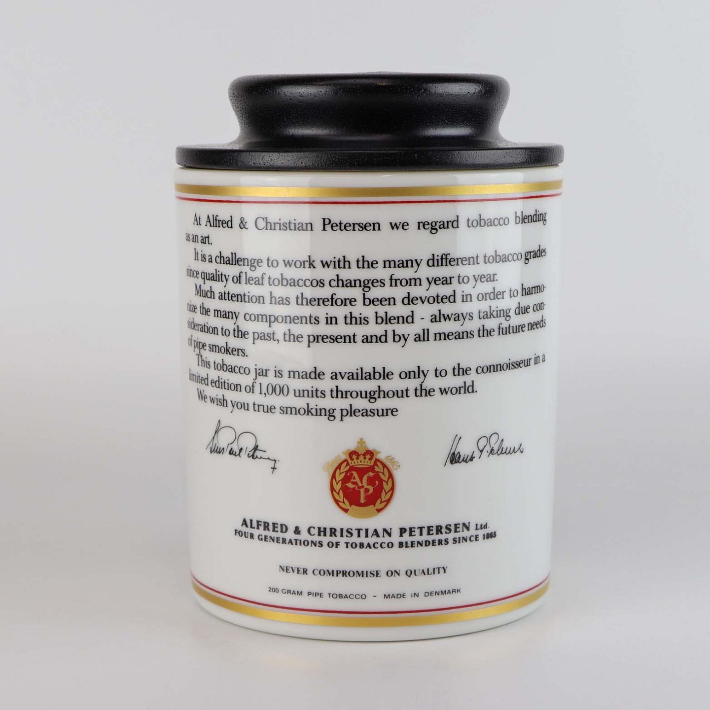Krukke i porcelæn med låg af mørkt træ til opbevaring af pibetobak. Tobaksdåsen har motiv og tekst fra den tidligere tobaksfabrik i Horsens Alfred og Christian Petersen Ltd. Nr. 6053/7057