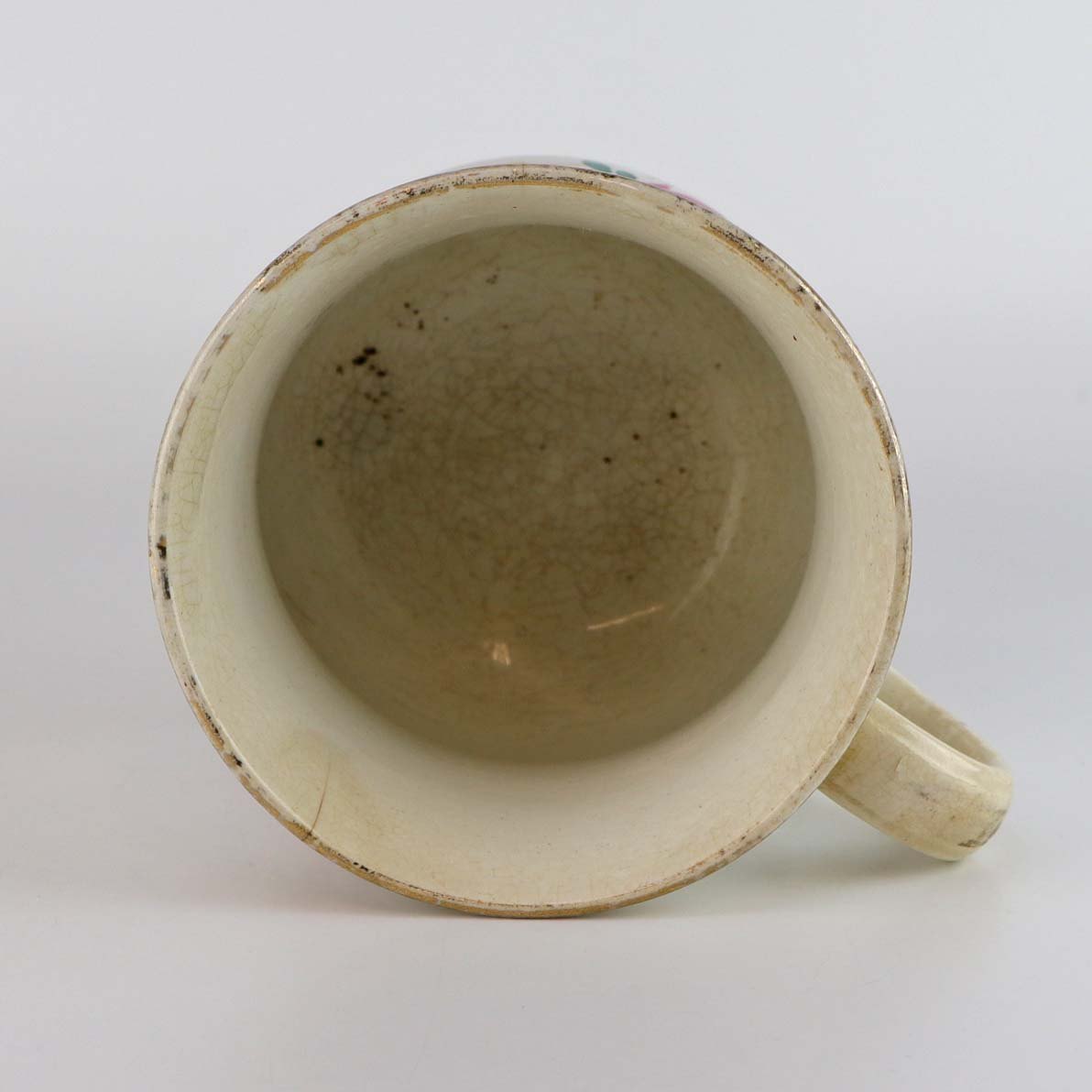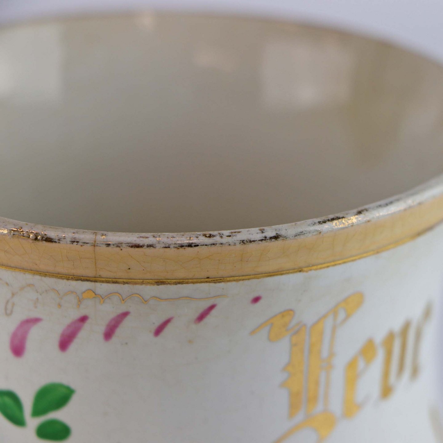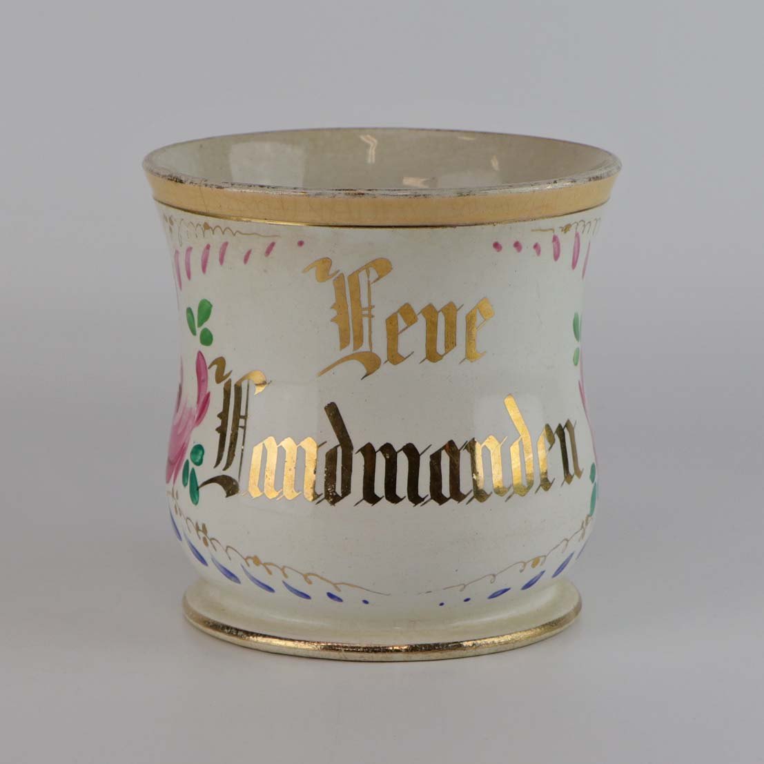 Antik ølkrus i fajance, som også er kendt under navnet Portlands krus. Dette krus er fremstillet i perioden år 1885-1923 og er dekoreret blomsterranker og teksten Leve Landmanden i guldtryk