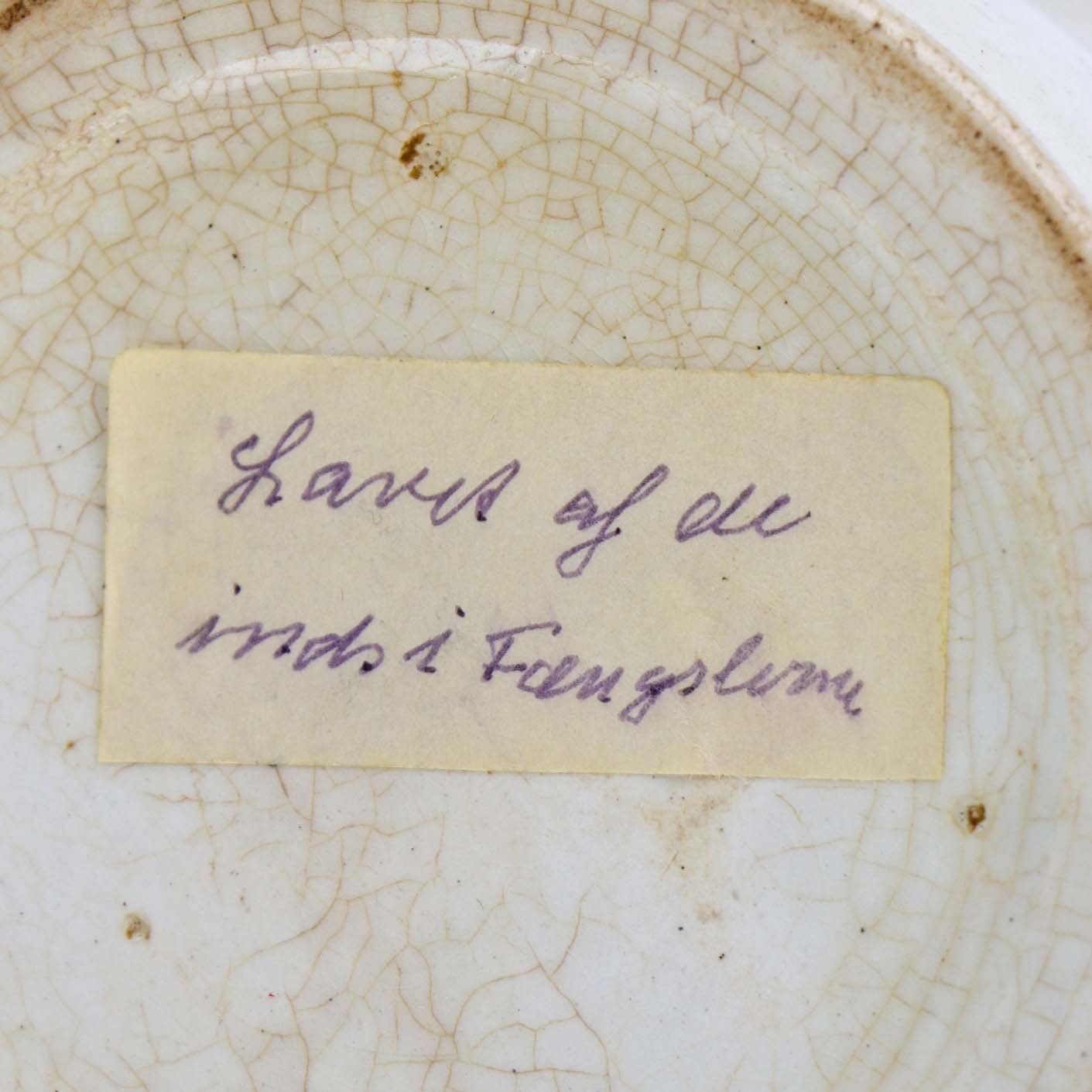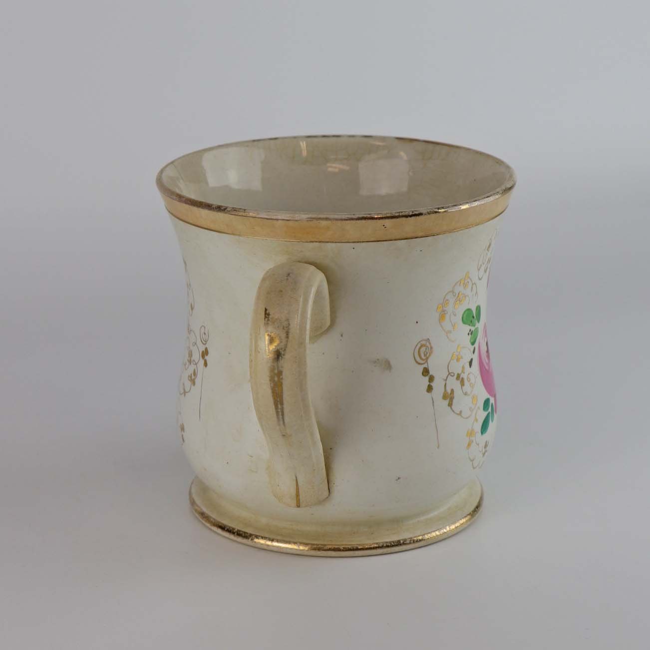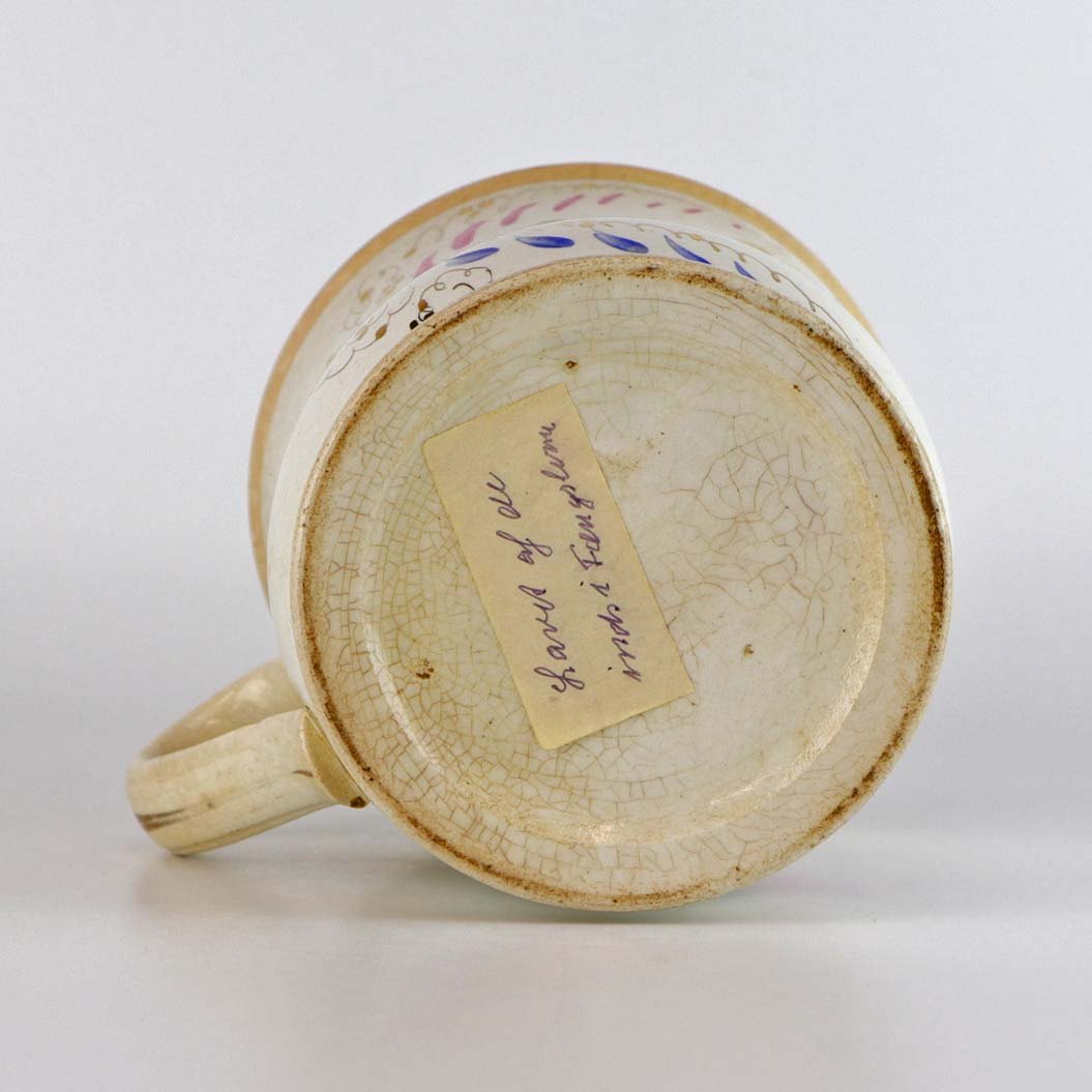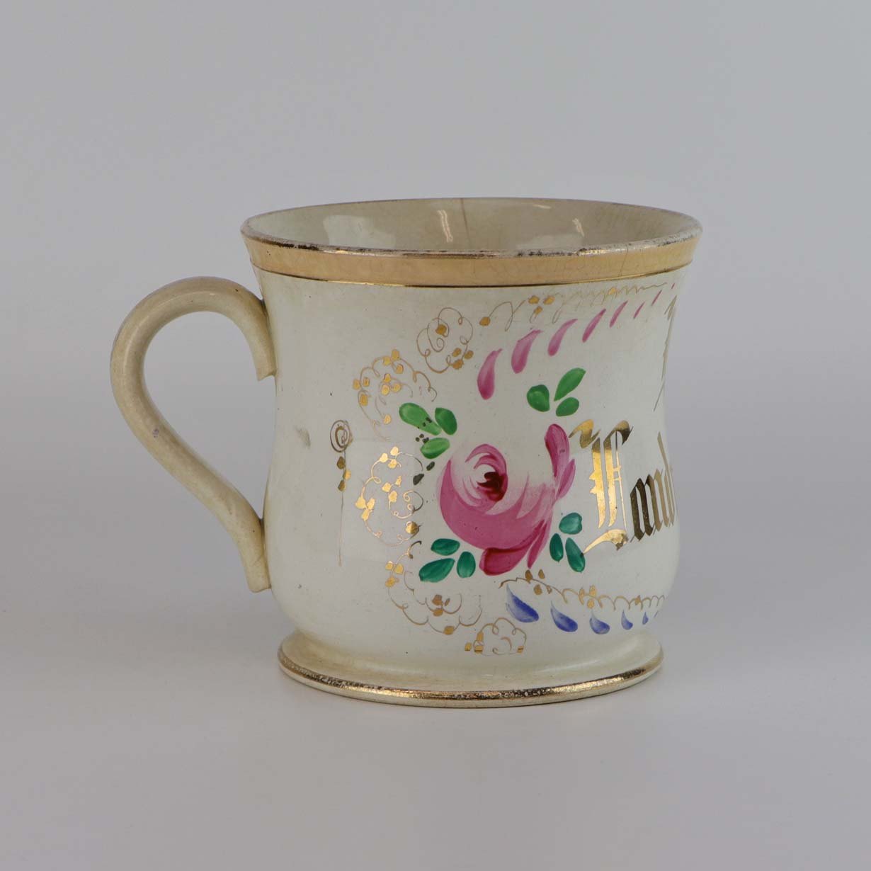 Antik ølkrus i fajance, som også er kendt under navnet Portlands krus. Dette krus er fremstillet i perioden år 1885-1923 og er dekoreret blomsterranker og teksten Leve Landmanden i guldtryk