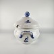Glat hvidt porcelæn dekoreret med blå blomster.