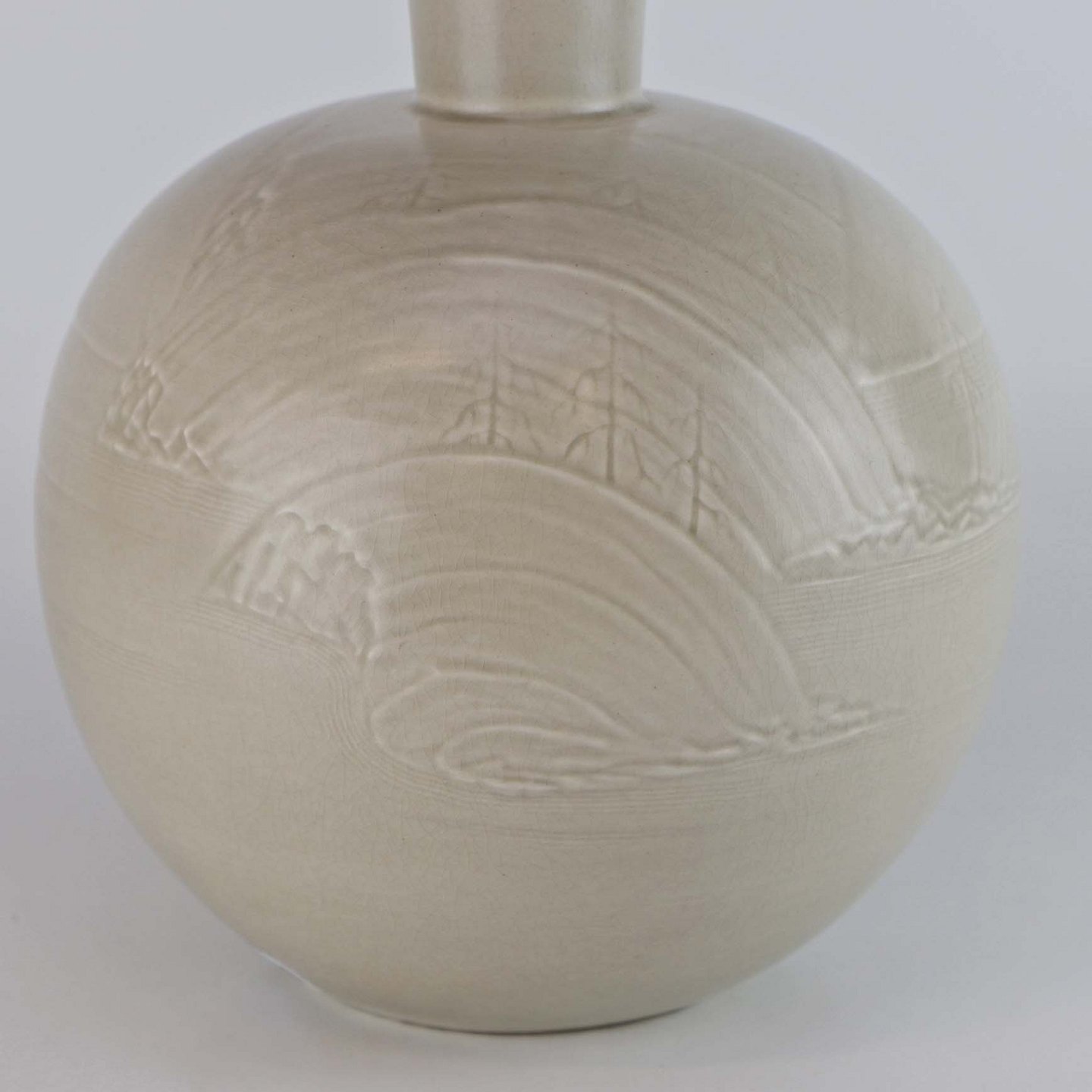 Vase i fajance med råhvid glasur og dekoration af bakker og nøgne træer. Nr. 1698