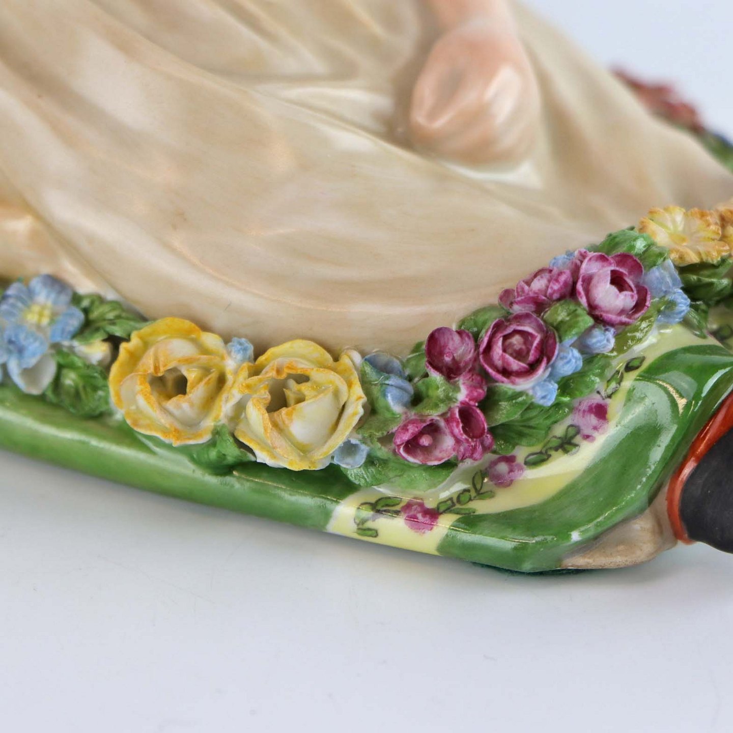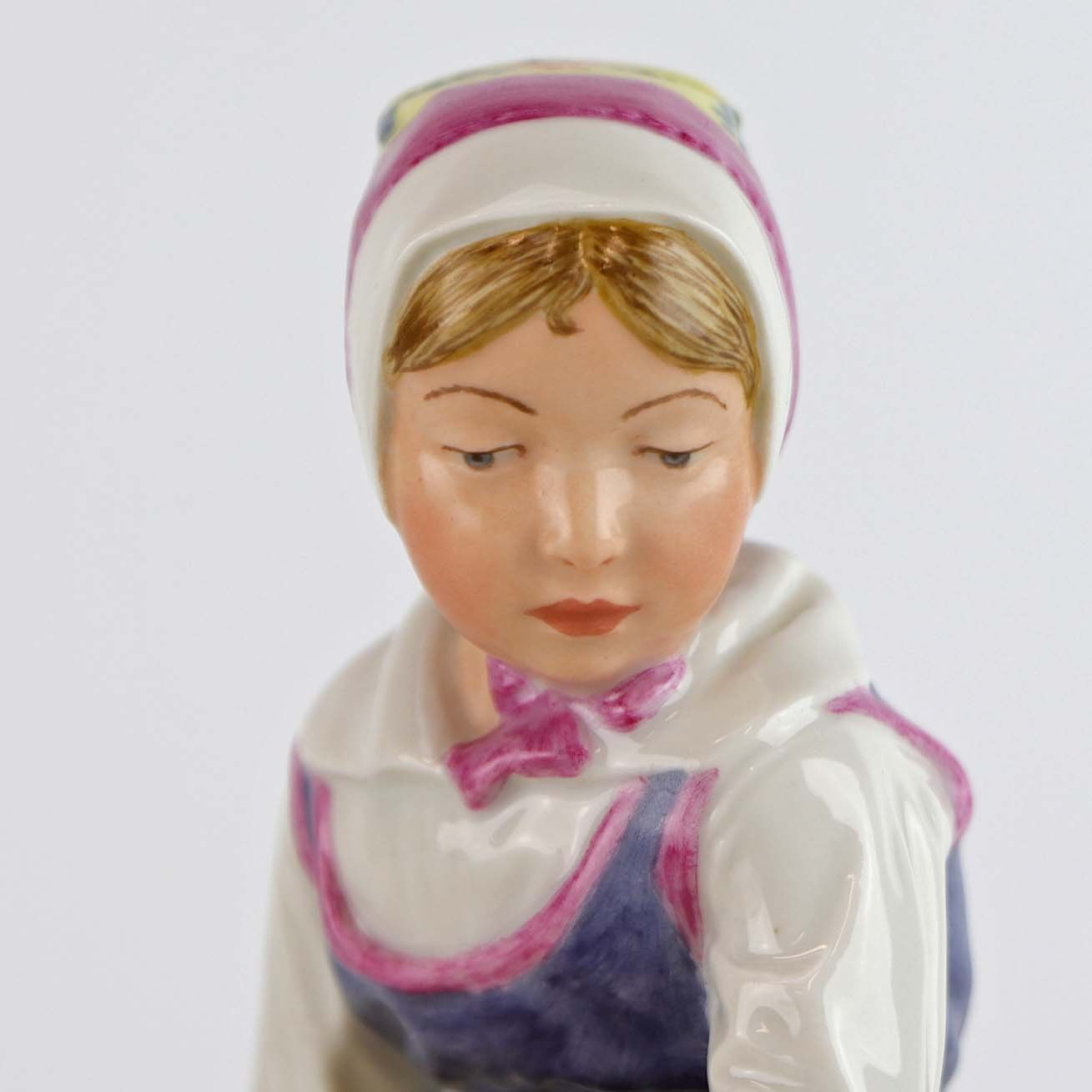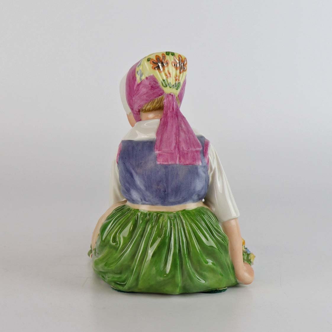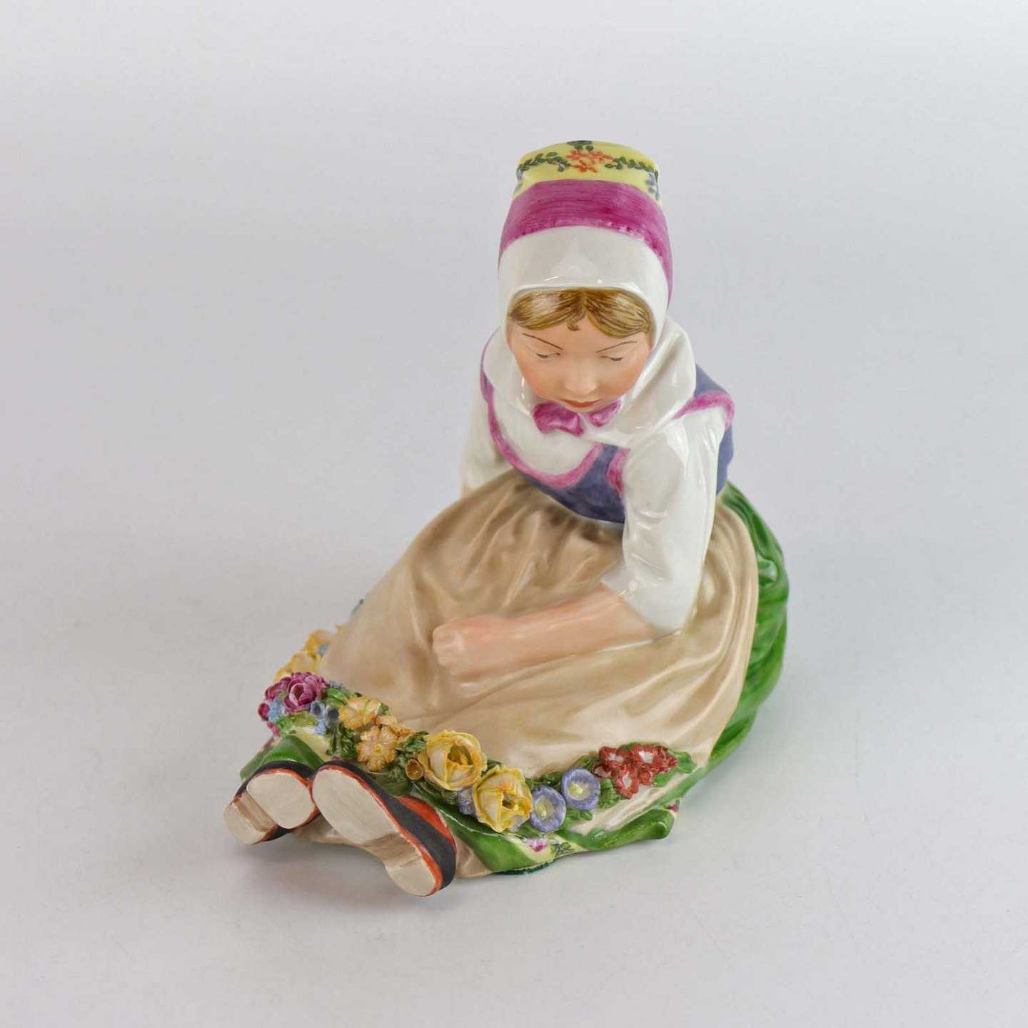 Kongelig figur i porcelæn med motiv af siddende blomsterpige i egnsdragt fra Sjælland. Nr. 12418