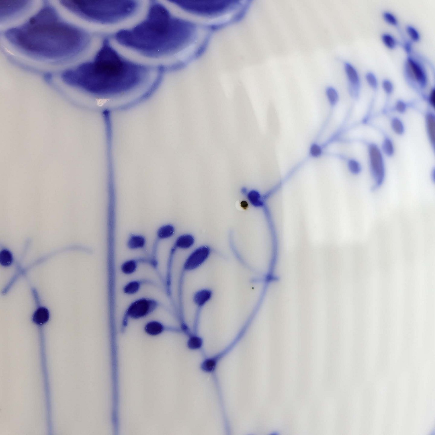 Musselmalet er af kongeligt hvidt porcelæn, dekoreret med rifler og mønster af blå ranker og blomster