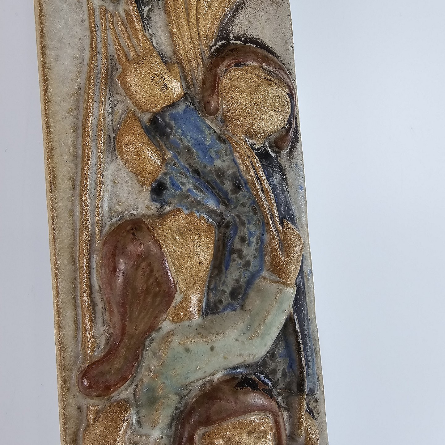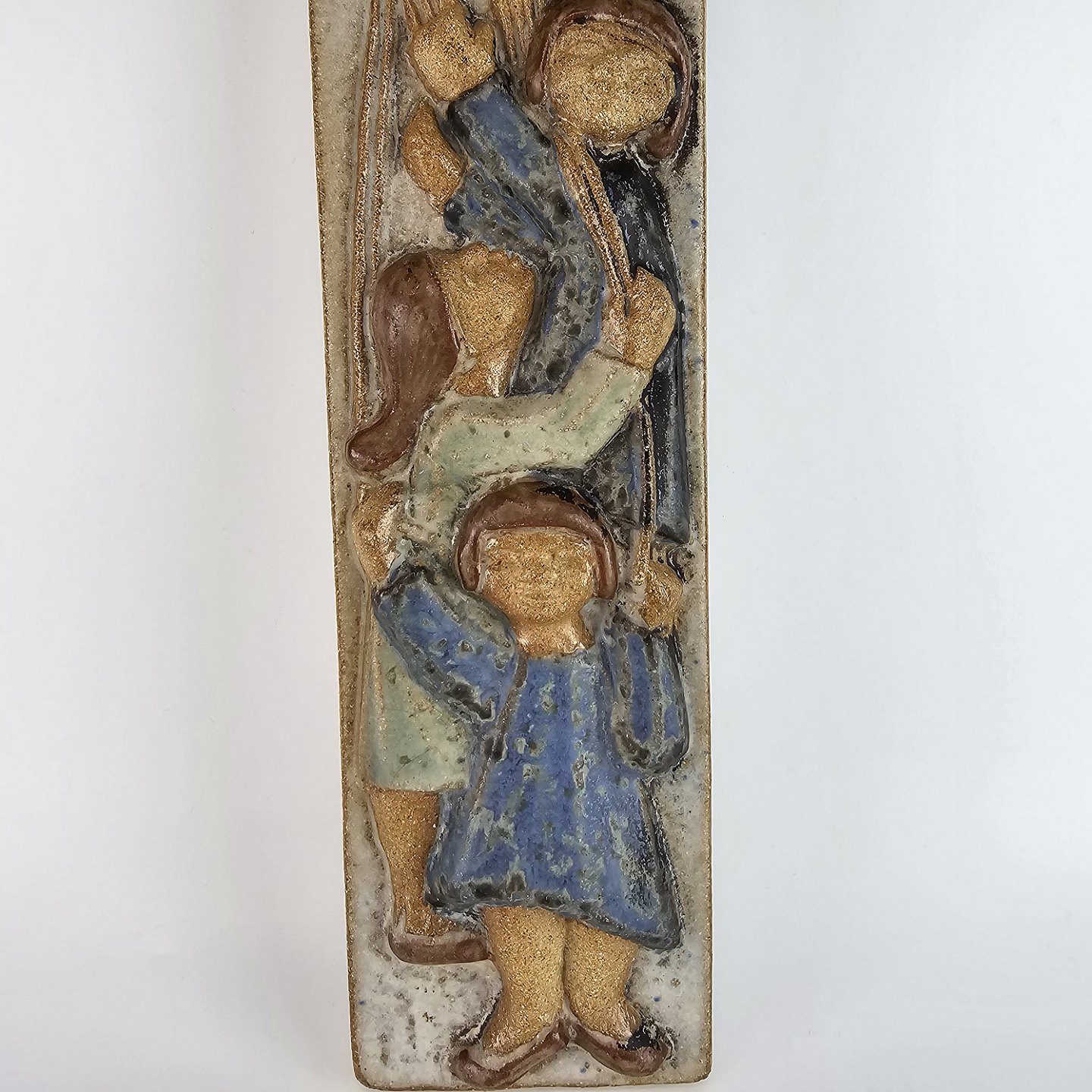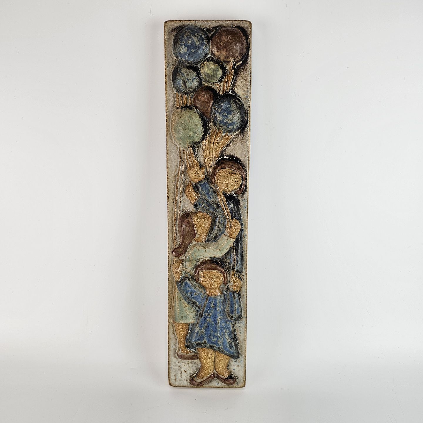 Vægrelief i keramik, med motiv af tre børn med balloner.
