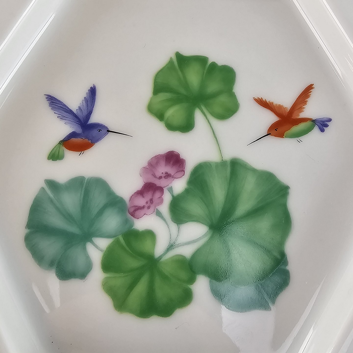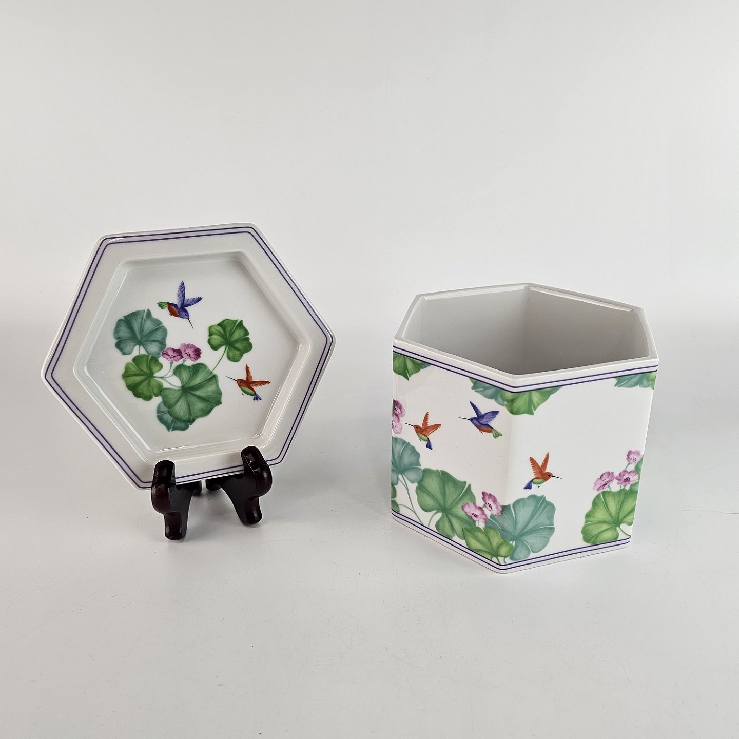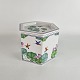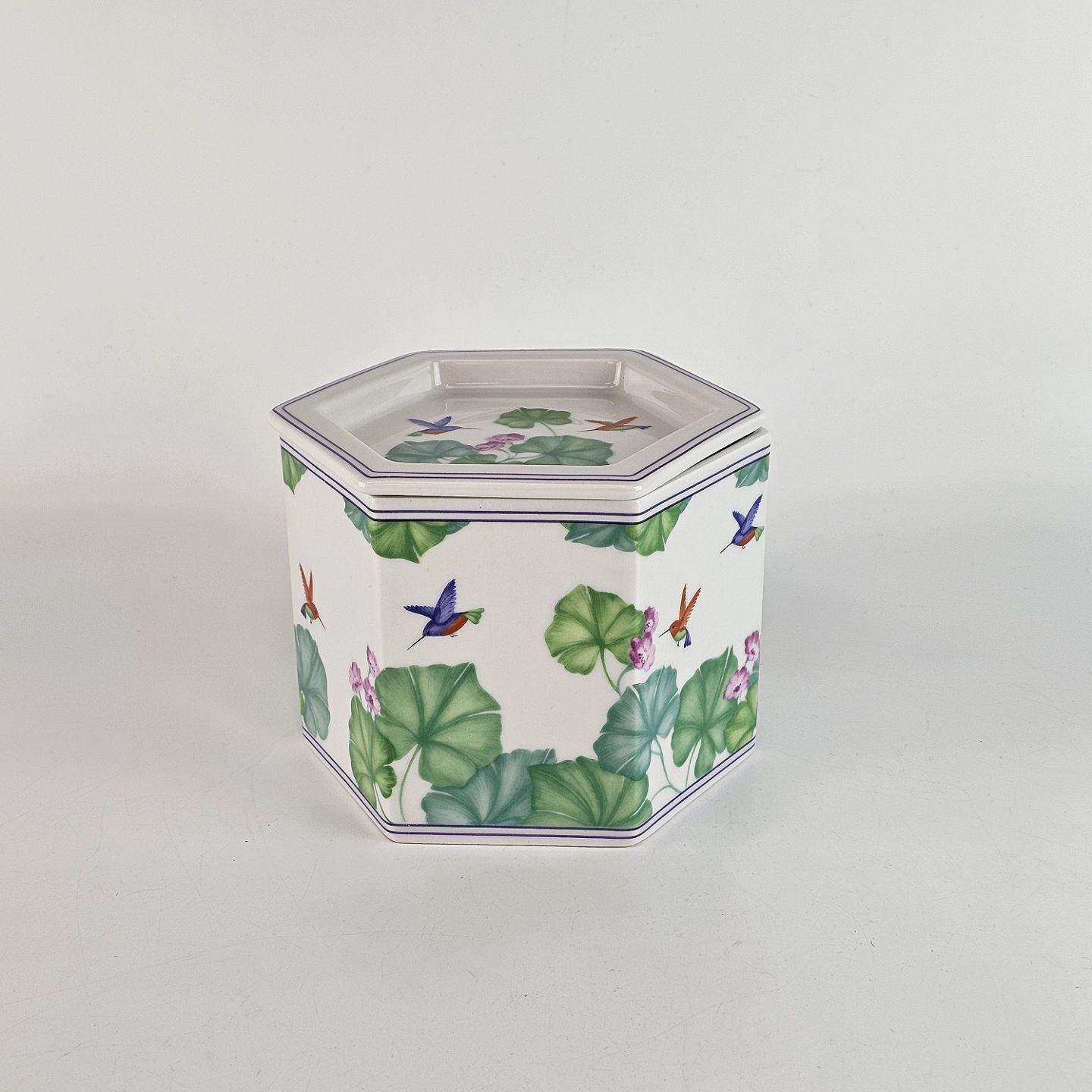 Sekskantet krukke med låg, med motiv af kolibrier og blade.