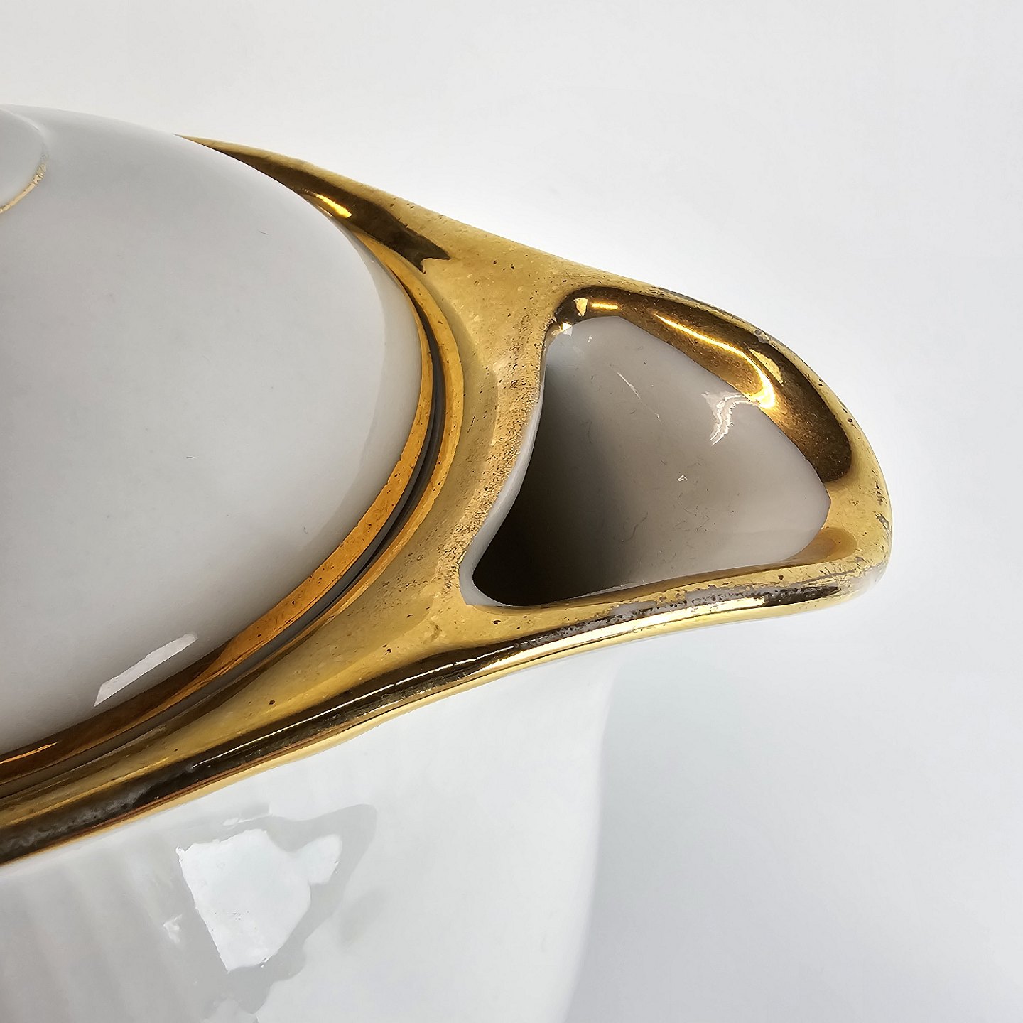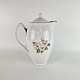 Hvidt riflet porcelæn med guldkant og motiv af æbleblomster.