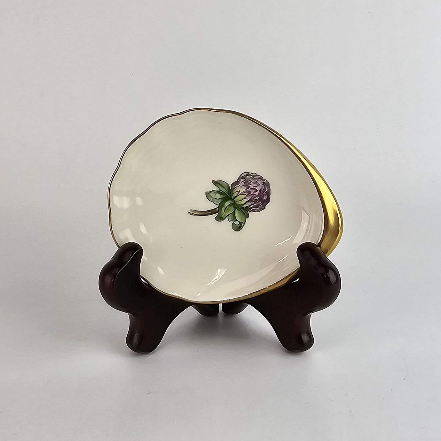 Hermod er cremefarvet, skælformet porcelæn dekoreret med gule kløverblomster.