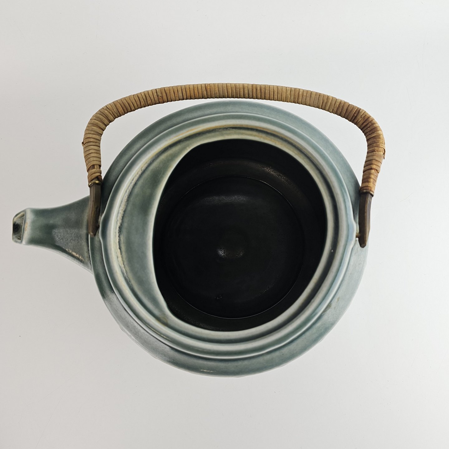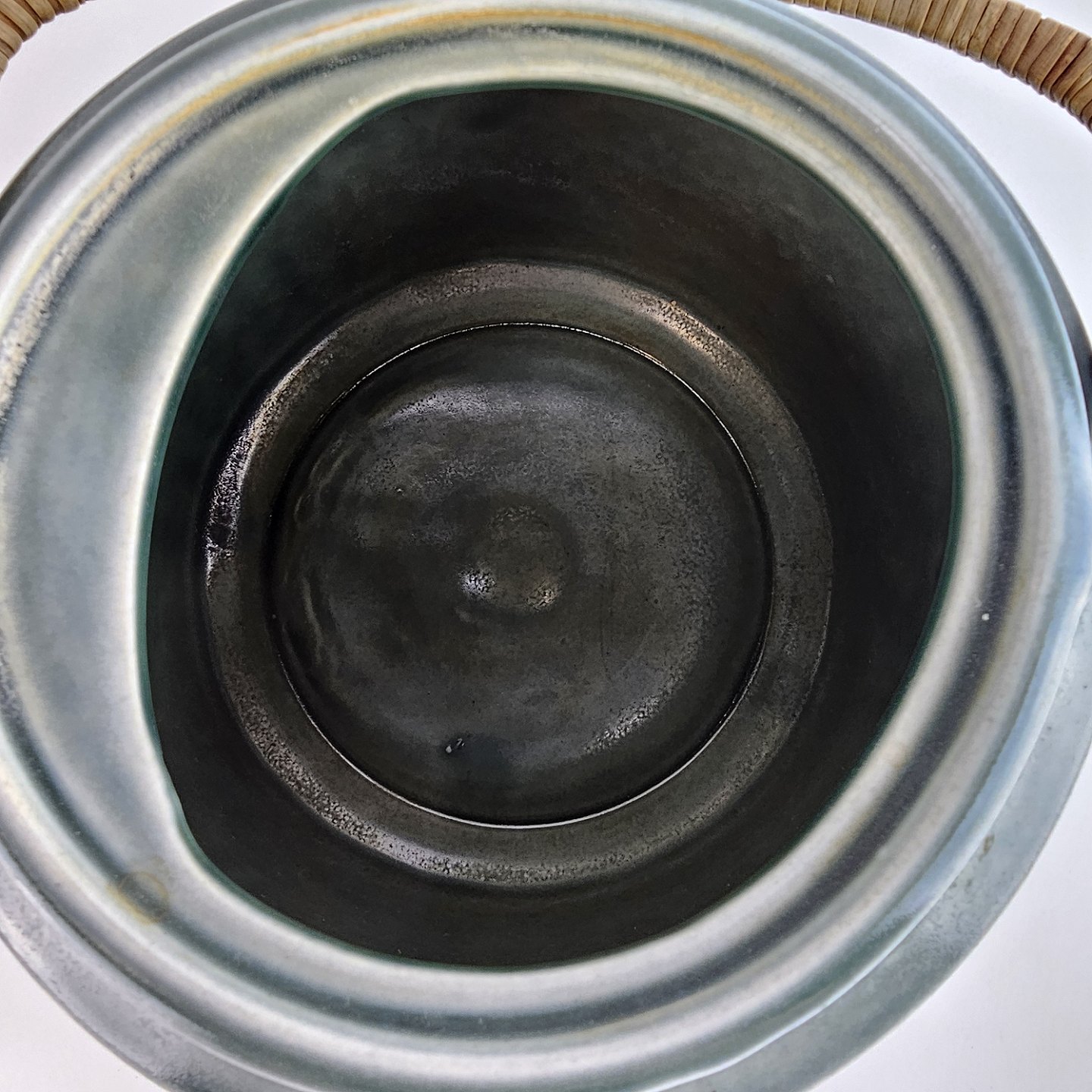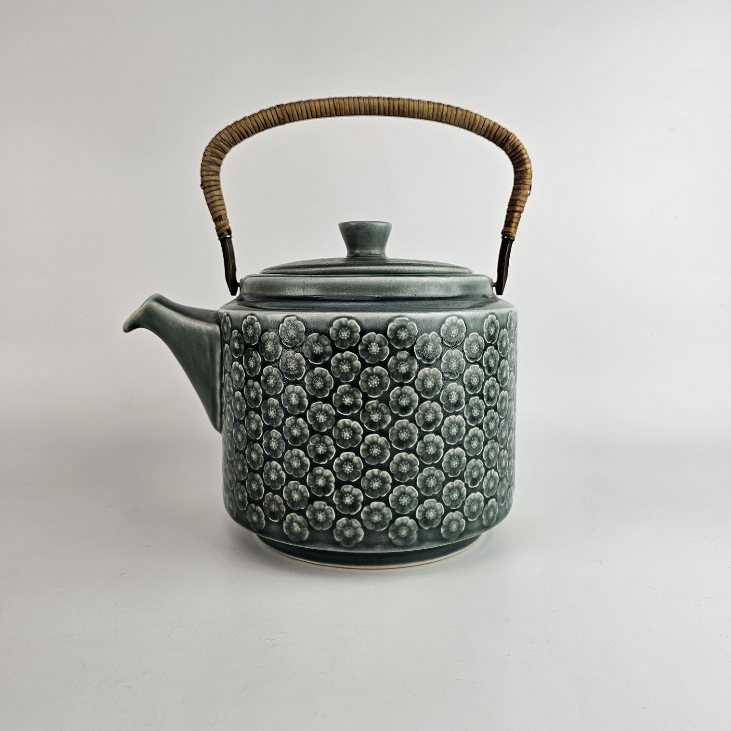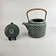 Stel i blågrøn stentøj med blomster motiver og håndtag i messing beklædt med bambusflet.