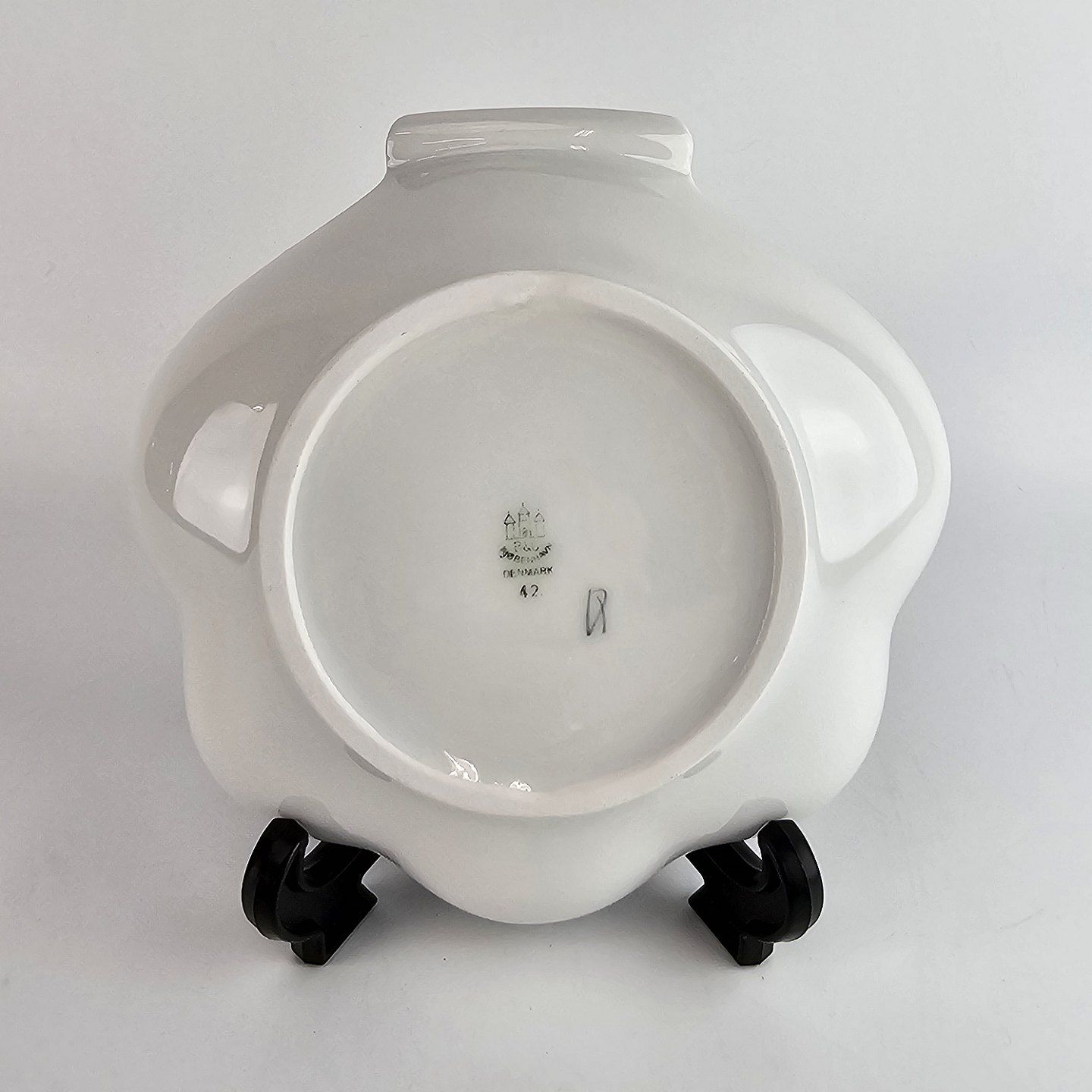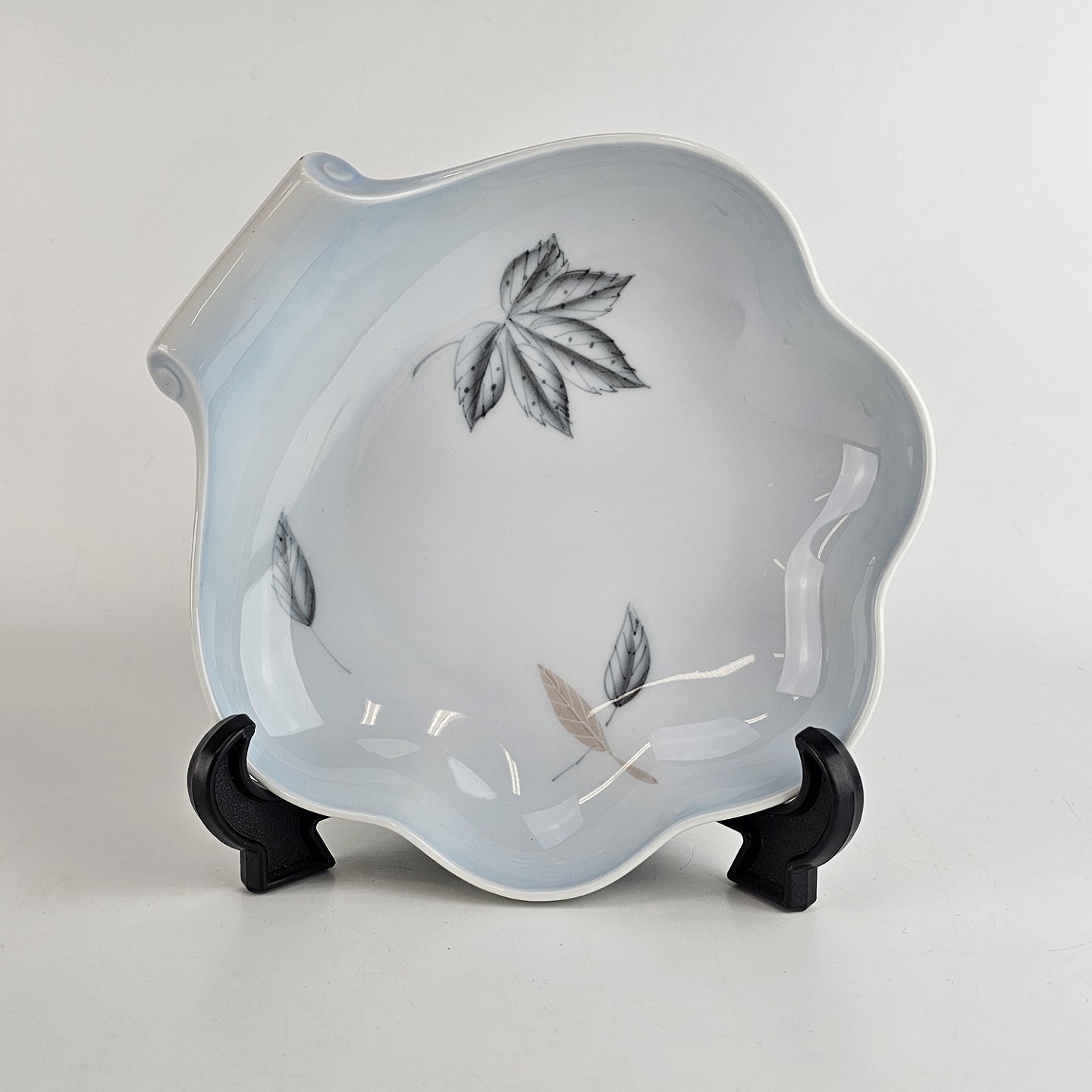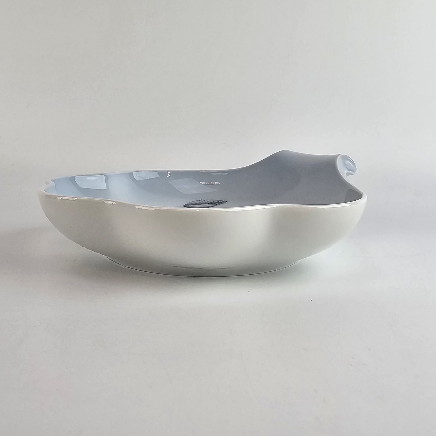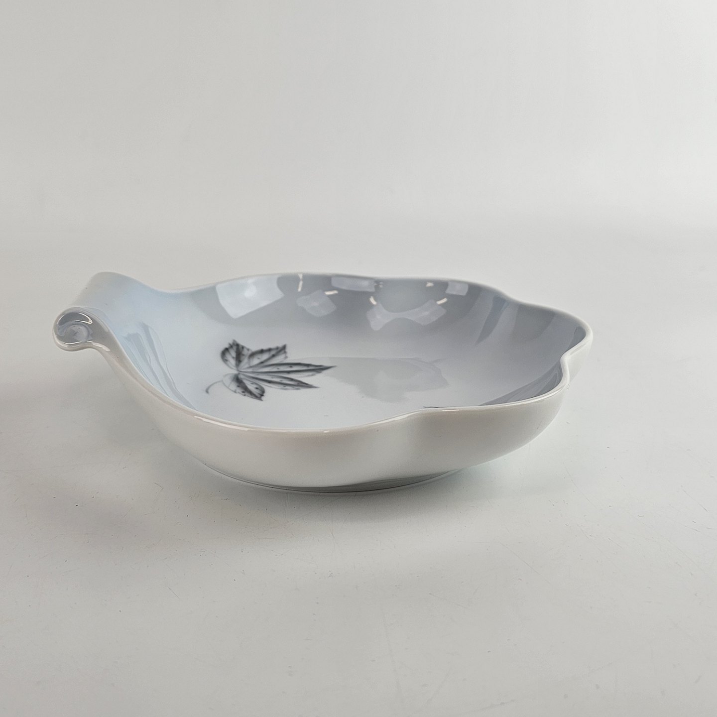Muslingeformet fad i porcelæn fra stellet Løvfald. Nr 42.