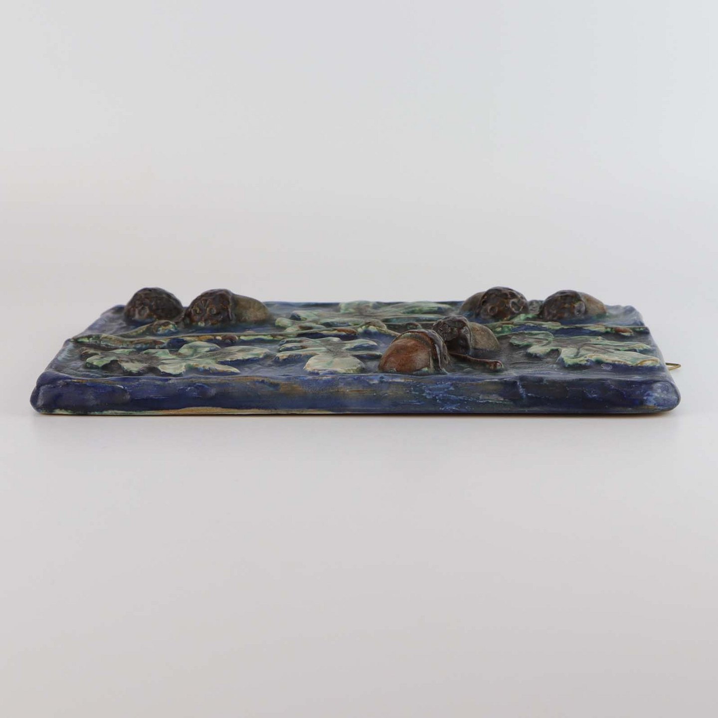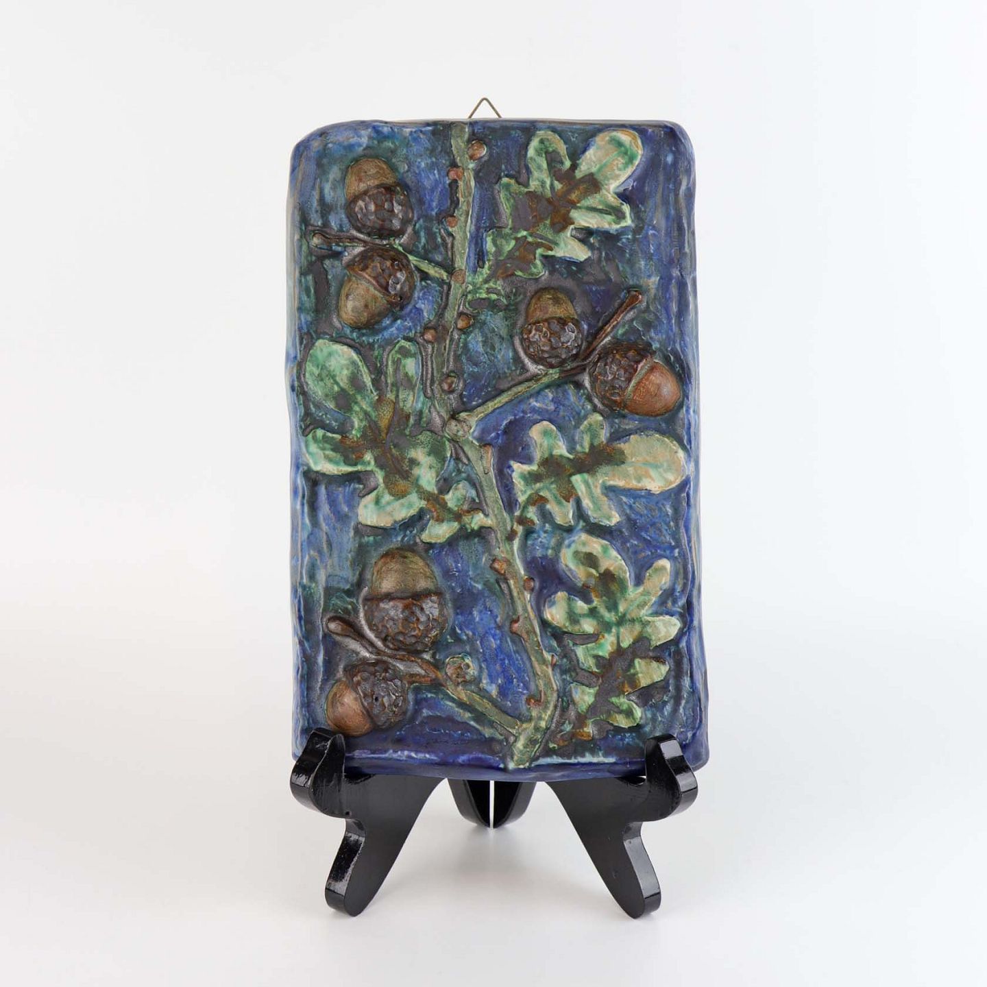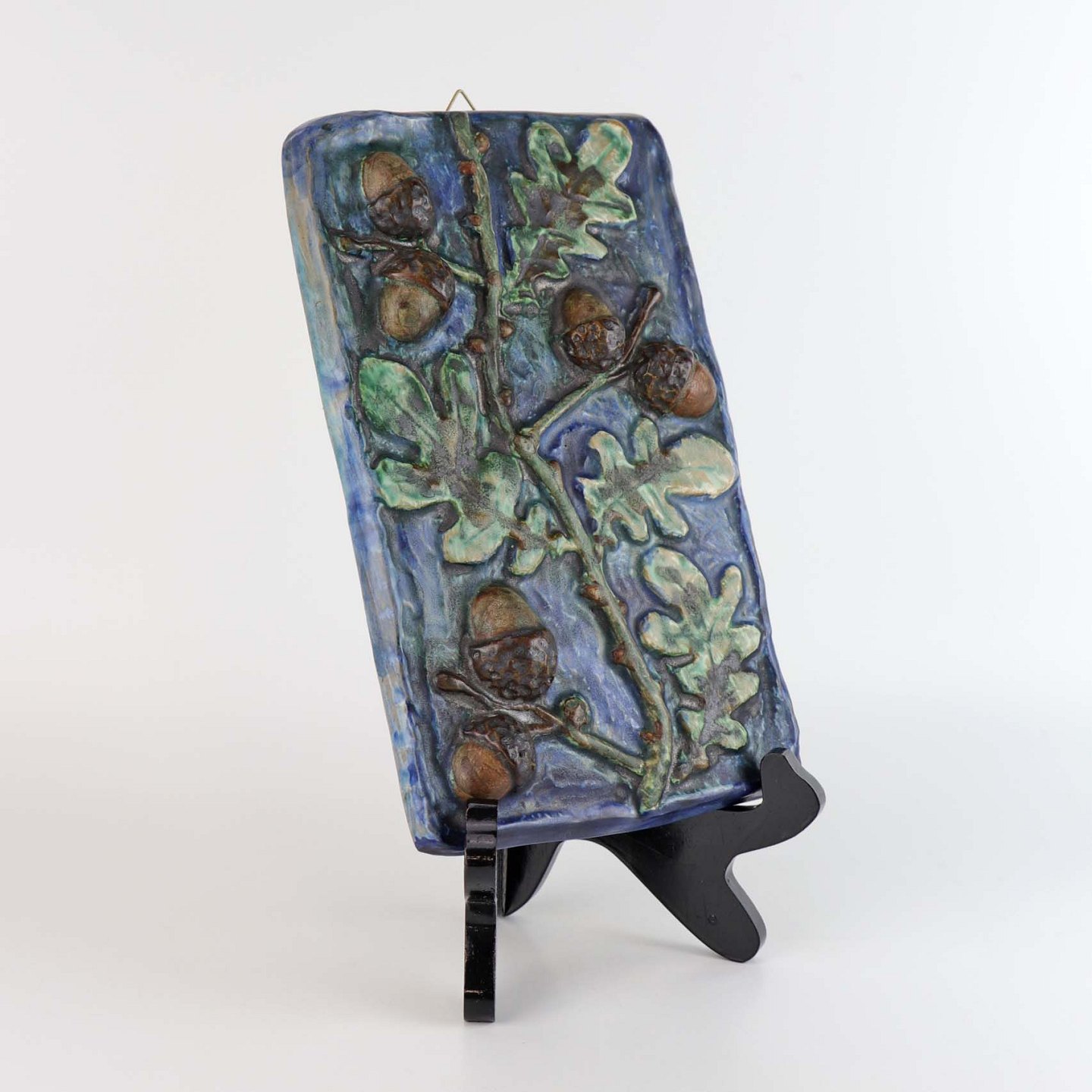 Vægrelief i keramik med motiv af brune agern og blade på blå glaseret baggrund