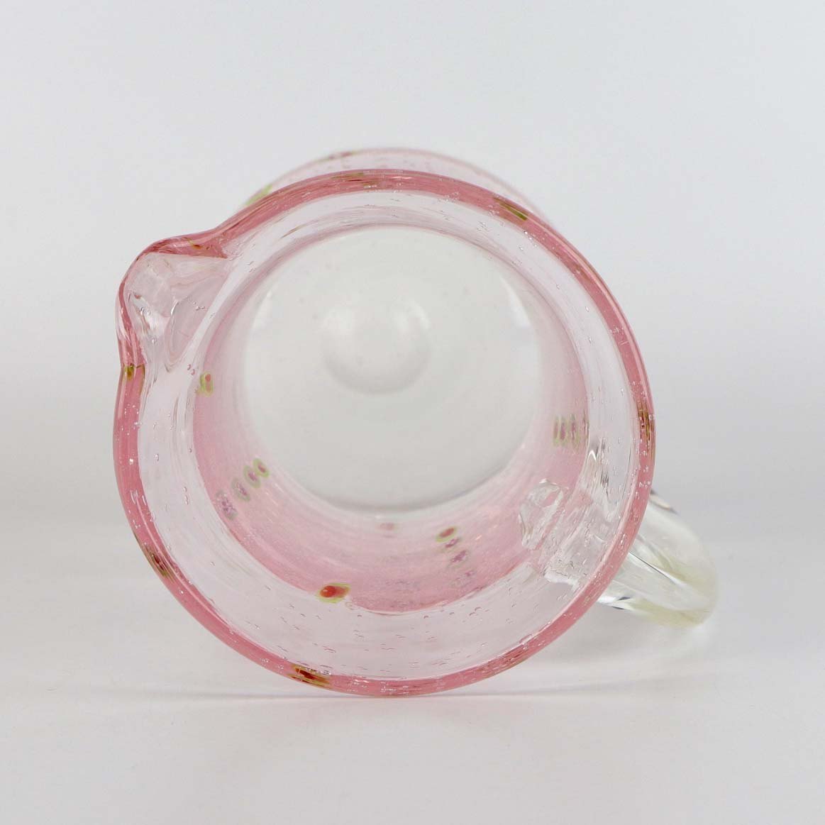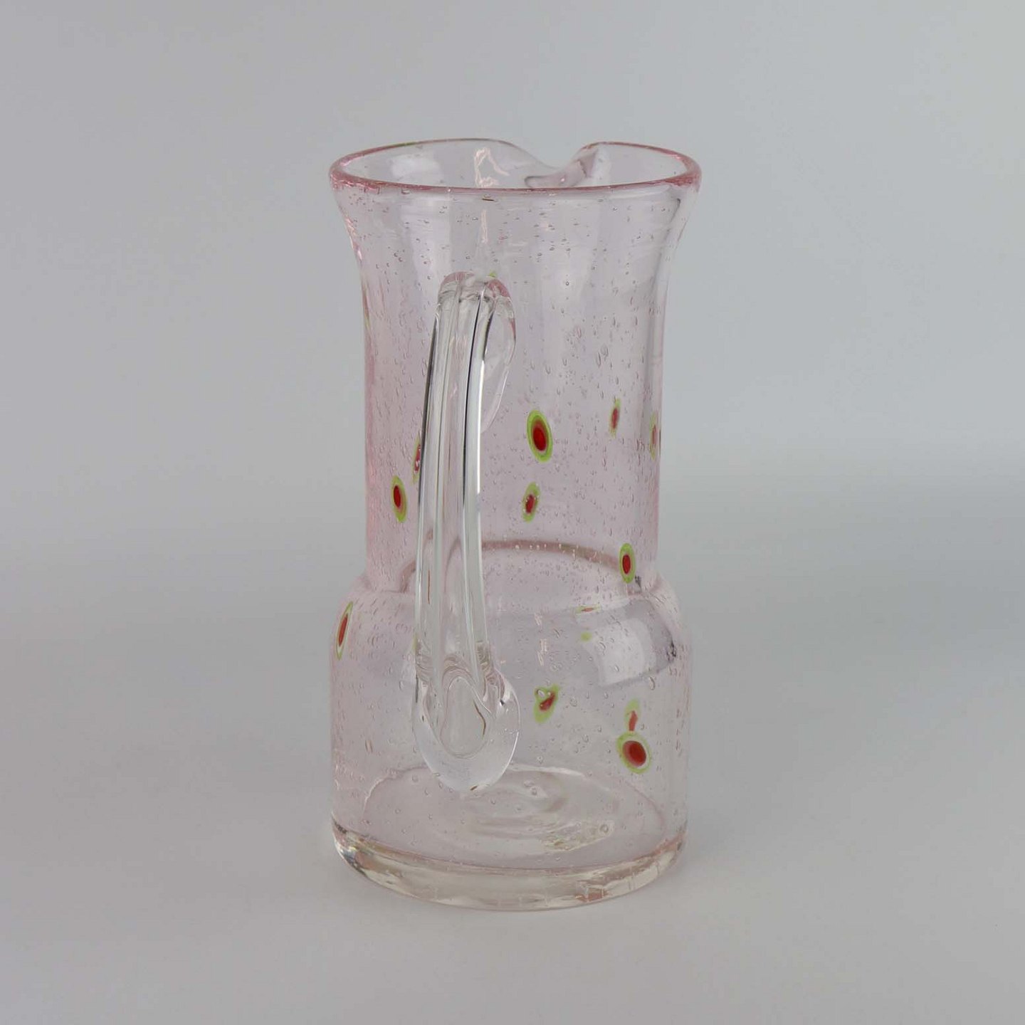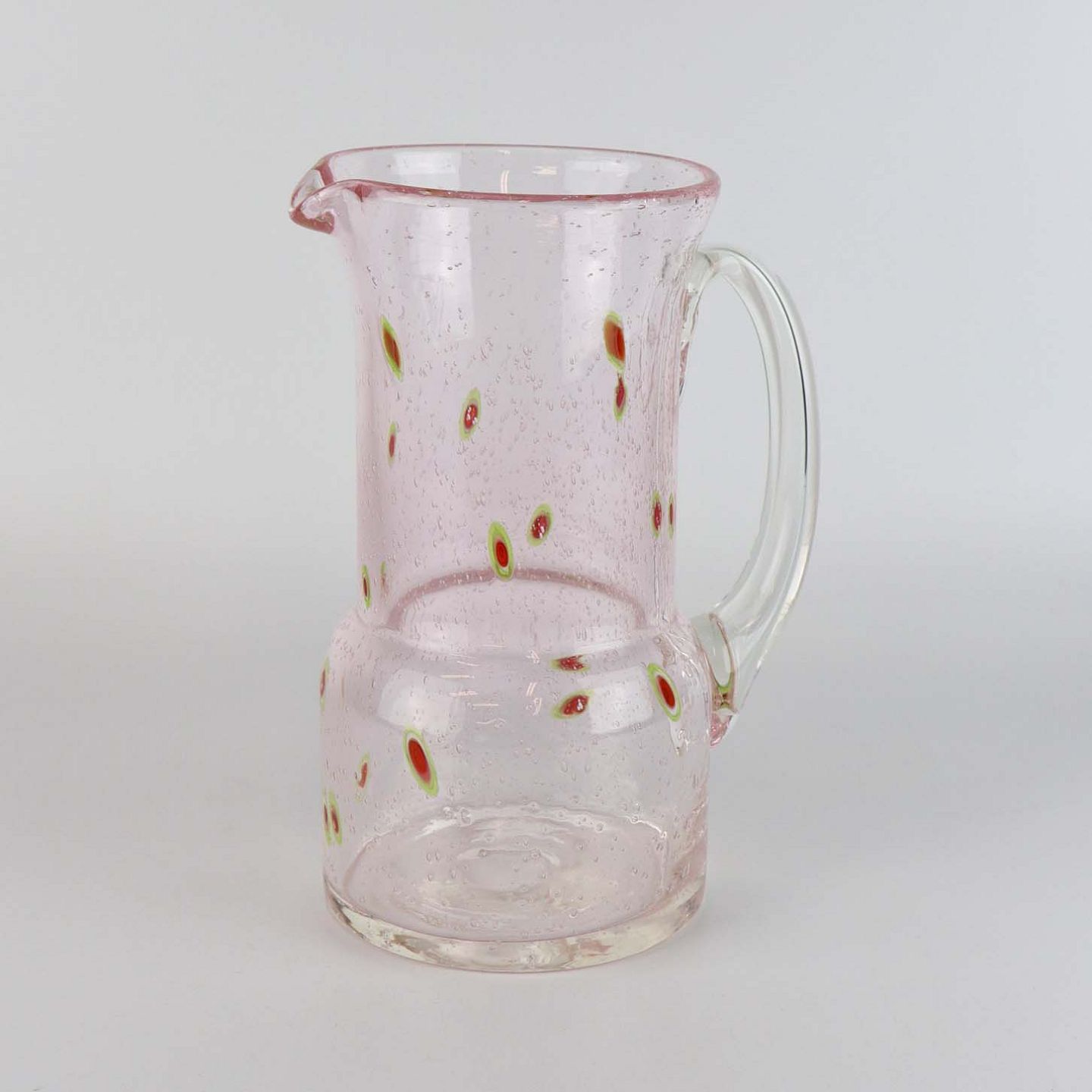 Vandkande i klart lyserødt glas med boblemønster samt grønne og røde ovale motiver