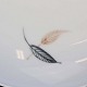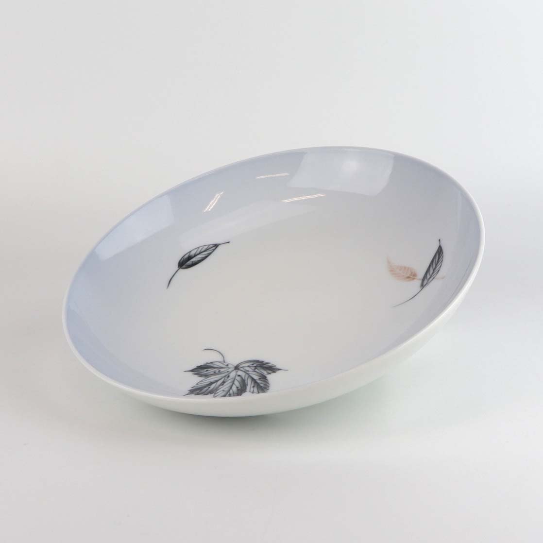 Løvfald er hvidt porcelæn som toner ud i blå, dekoreret med faldende blade i sort og rødt.