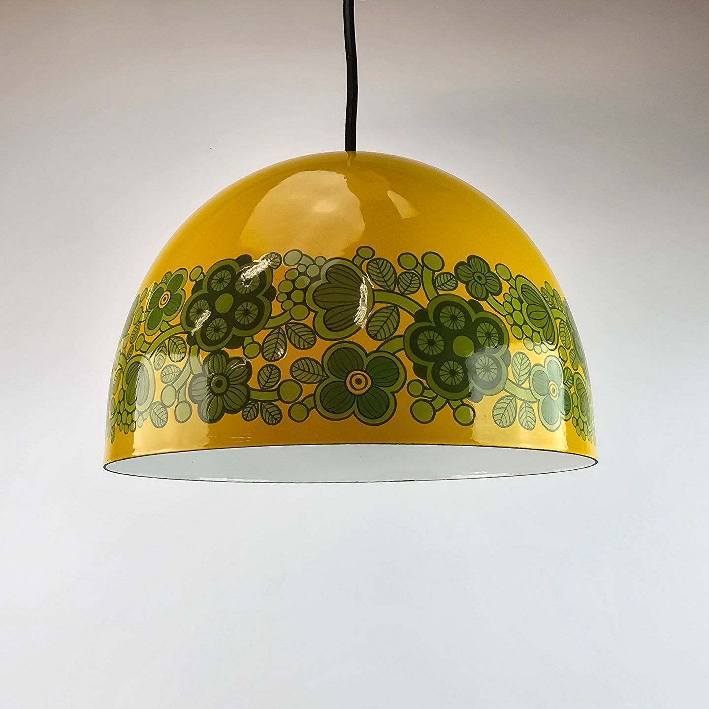 Arabia kalas pendel, i emalje. Gul med grønne blomster.