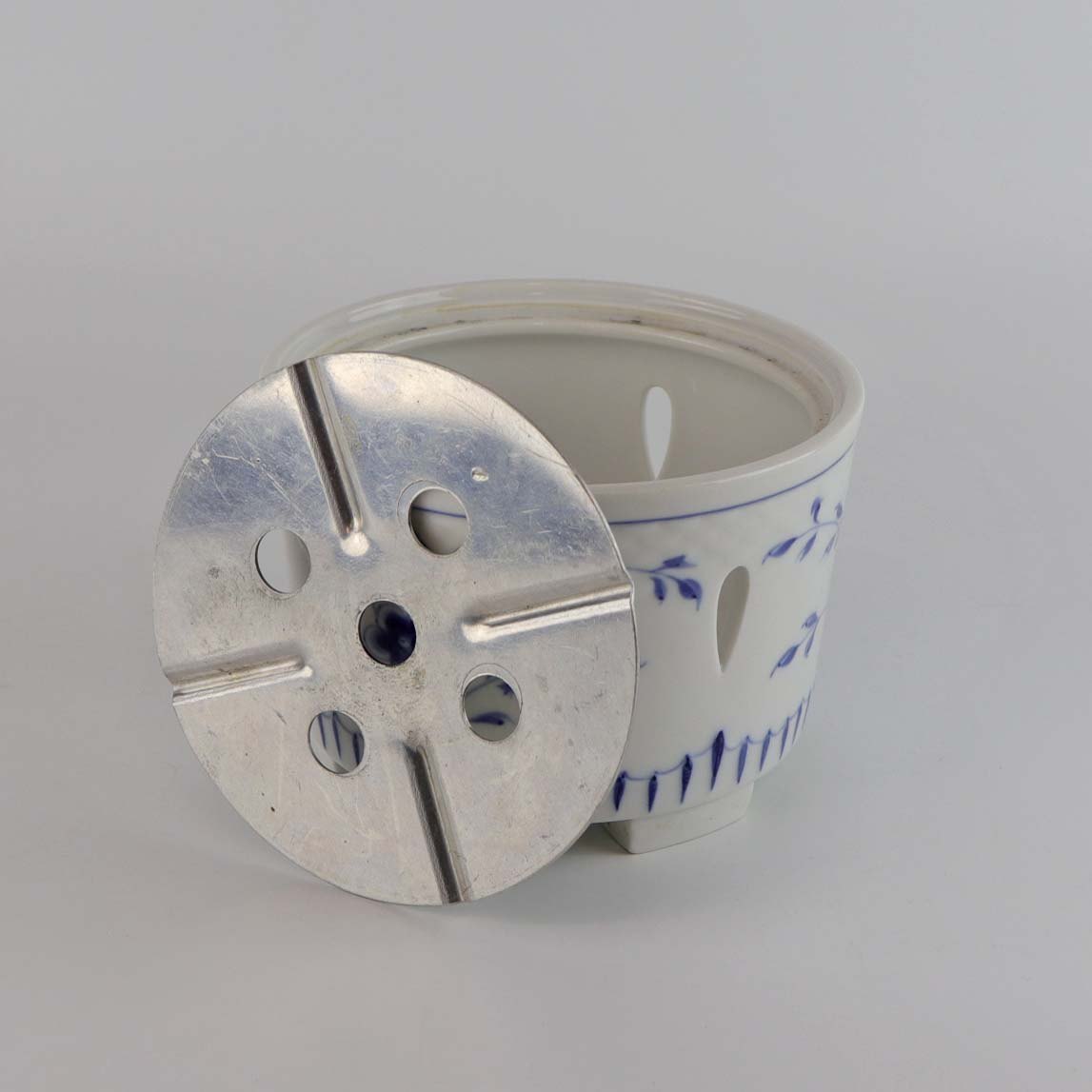 Tekande varmer i porcelæn og metal fra stellet Sommerfugl. Nr. 237