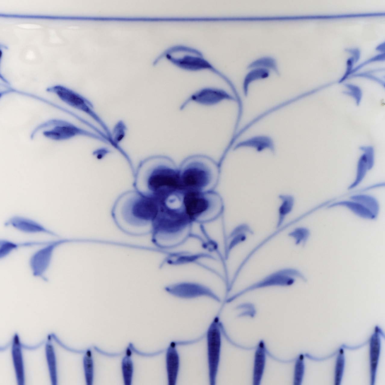 Service i hvidt skælformet porcelæn med blå motiver af blomster og sommerfugle.