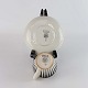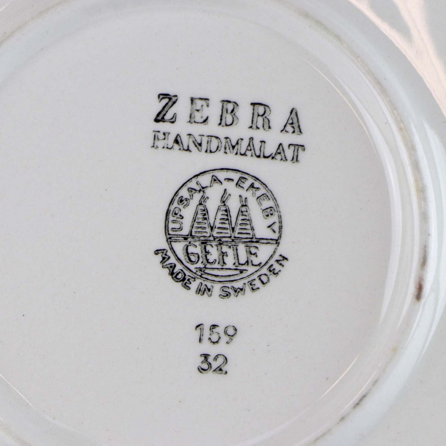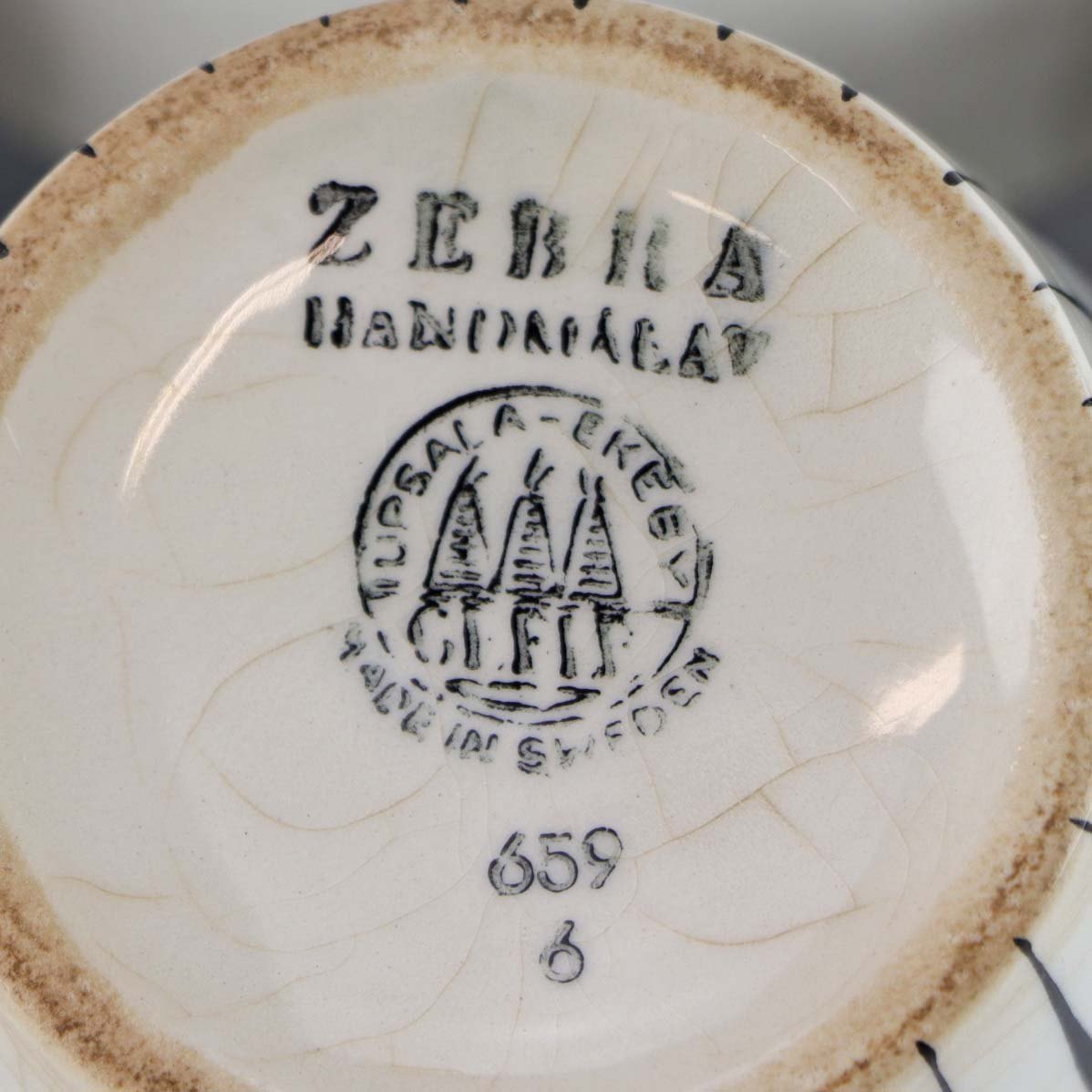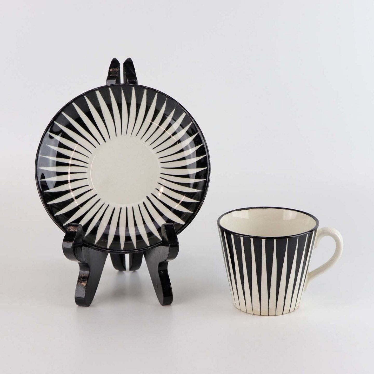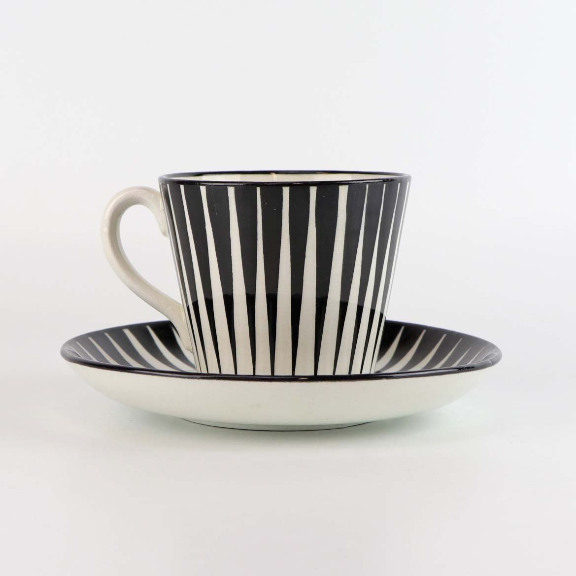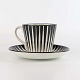 Håndmalet kaffekop med underkop i fajance fra stellet Zebra med mønster i sorte og hvide striber. Nr. 159/32 og 659/6