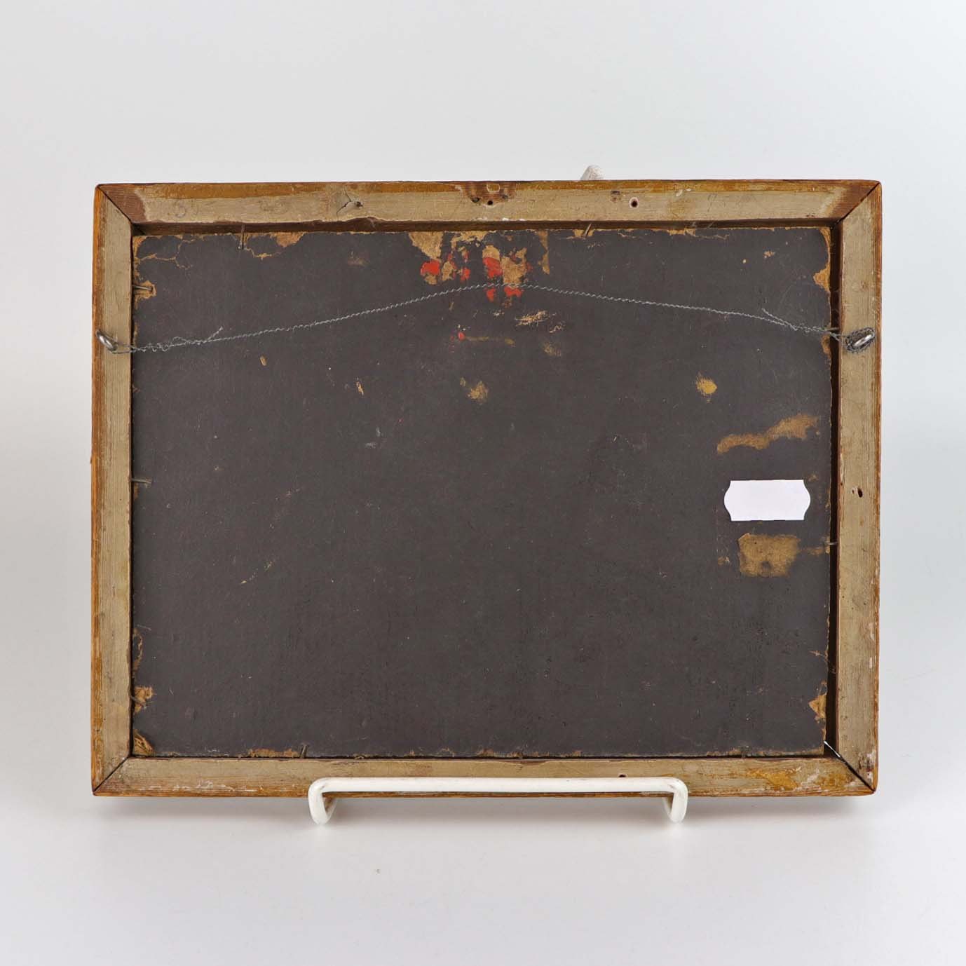 Antikt oliemaleri på plade i træramme fra 1848 med naturalistisk motiv af lyserød rose med blade på mørk baggrund