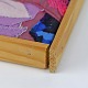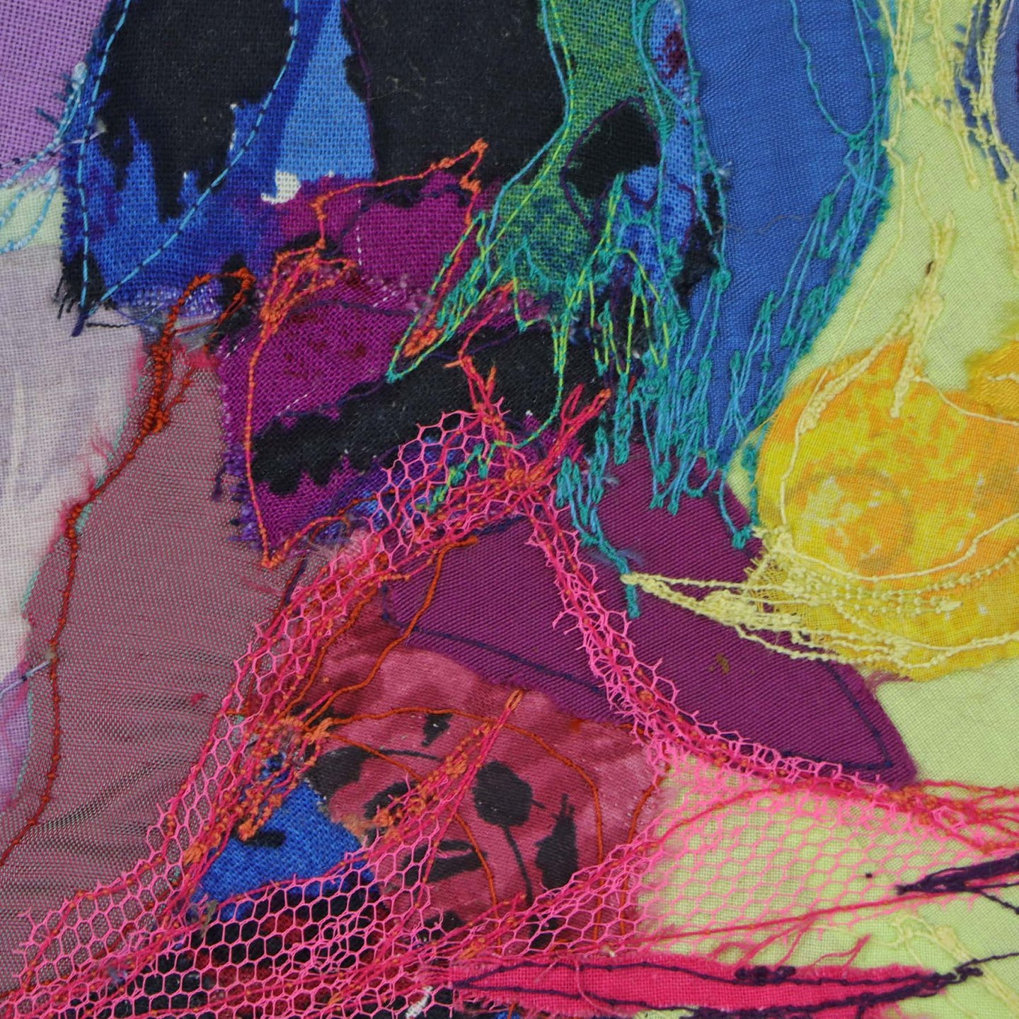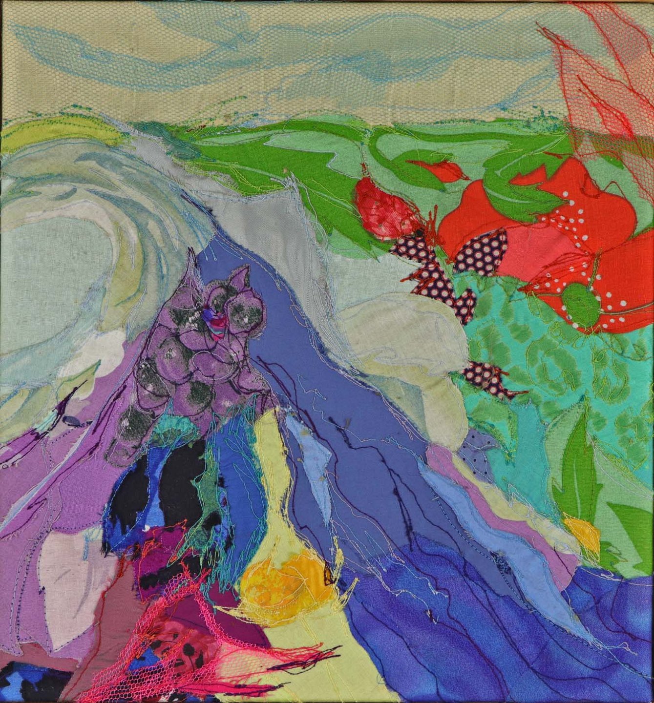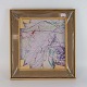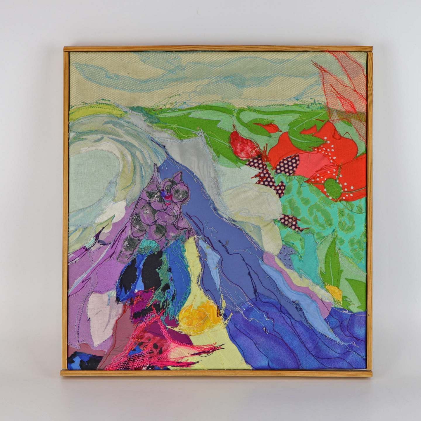 Oprammet tekstil billede i træramme med abstrakt motiv af landskab i klare farver og med forskellige stofstrukturer
