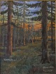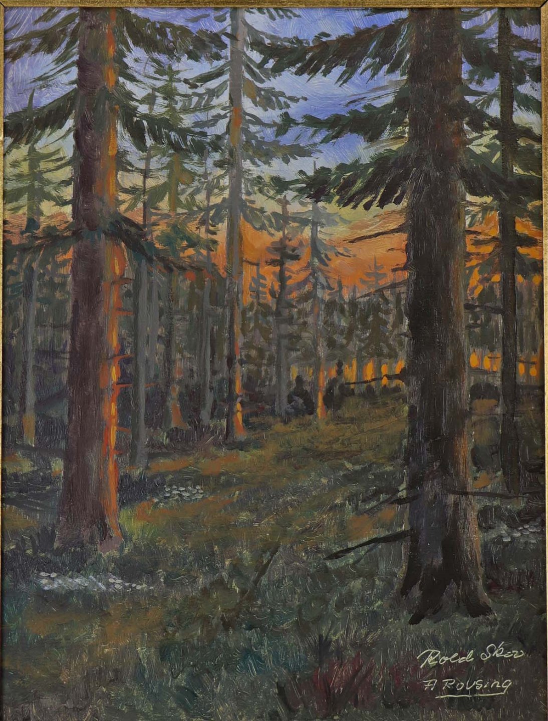 Oliemaleri på plade i gylden træramme med natur motiv af fyrtræer i Rold skov.