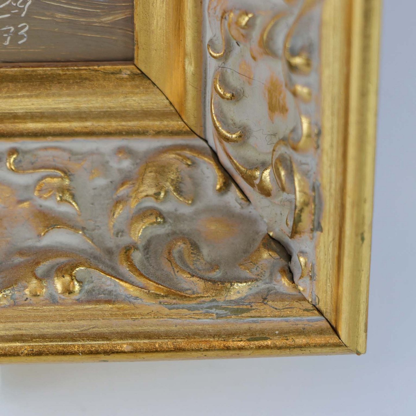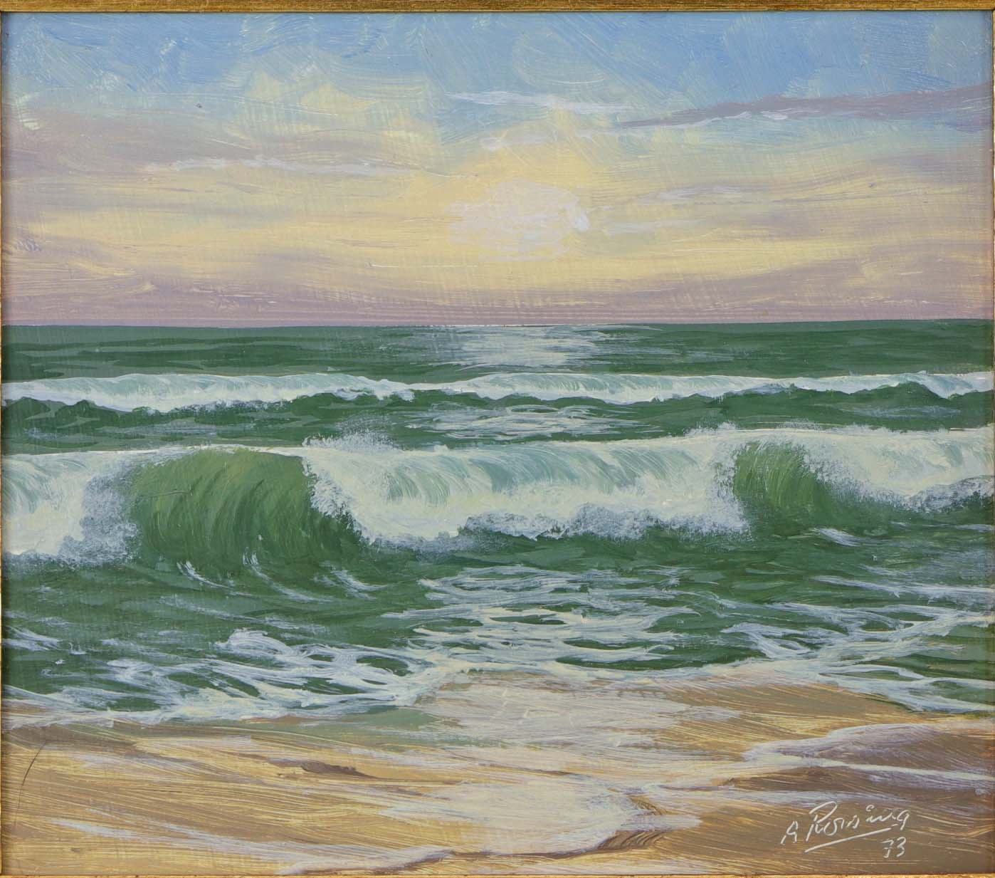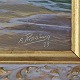 Oliemaleri på plade i gylden træramme med natur motiv af bølger som slår ind mod strandbredden.