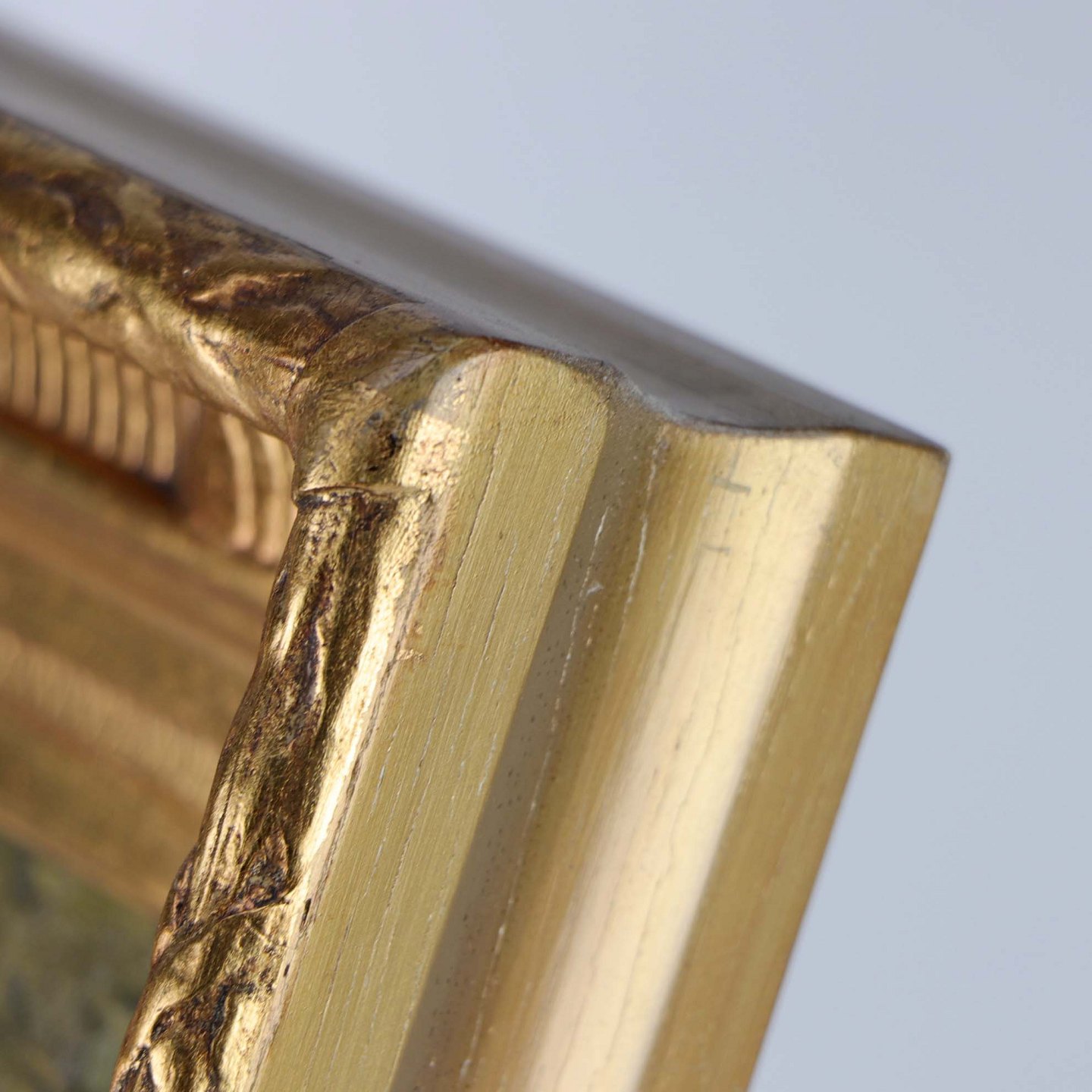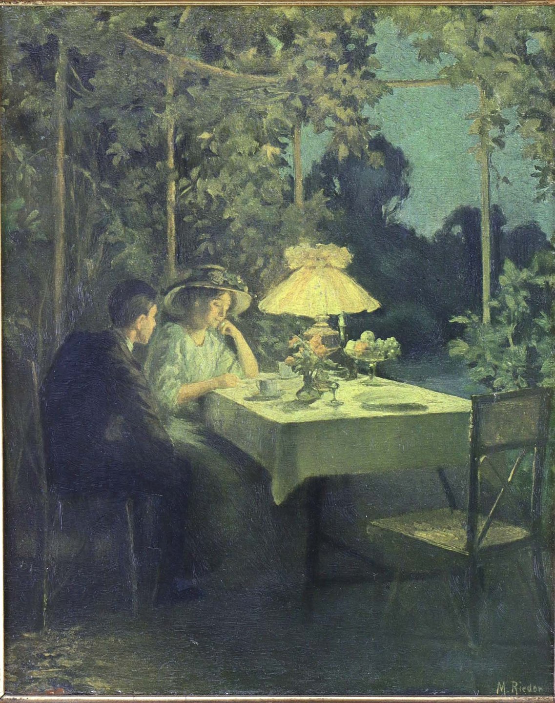Ældre oliemaleri på plade i guldmalet træramme med motiv af et par siddende ved bord i et lysthus.