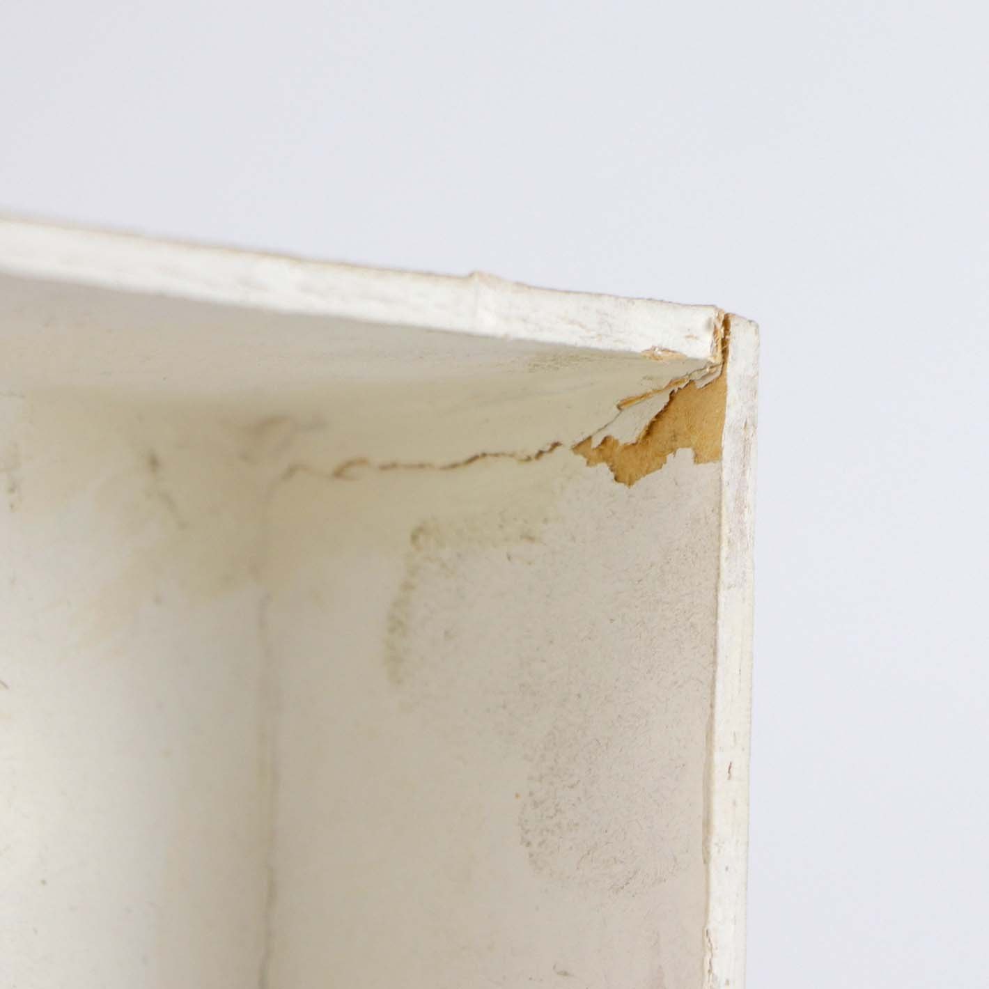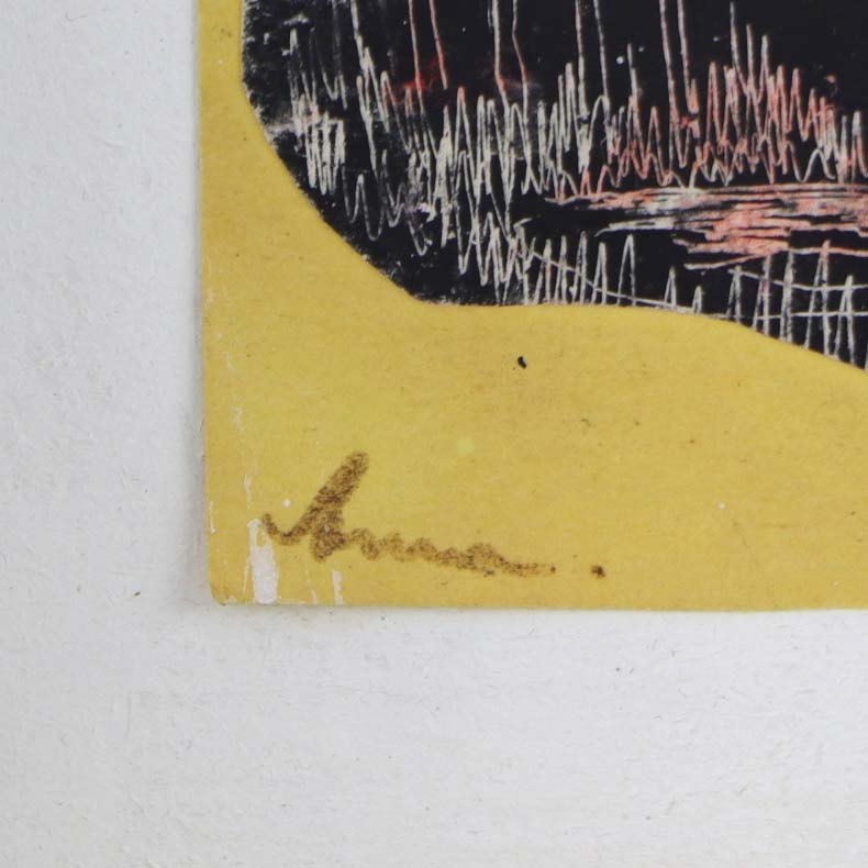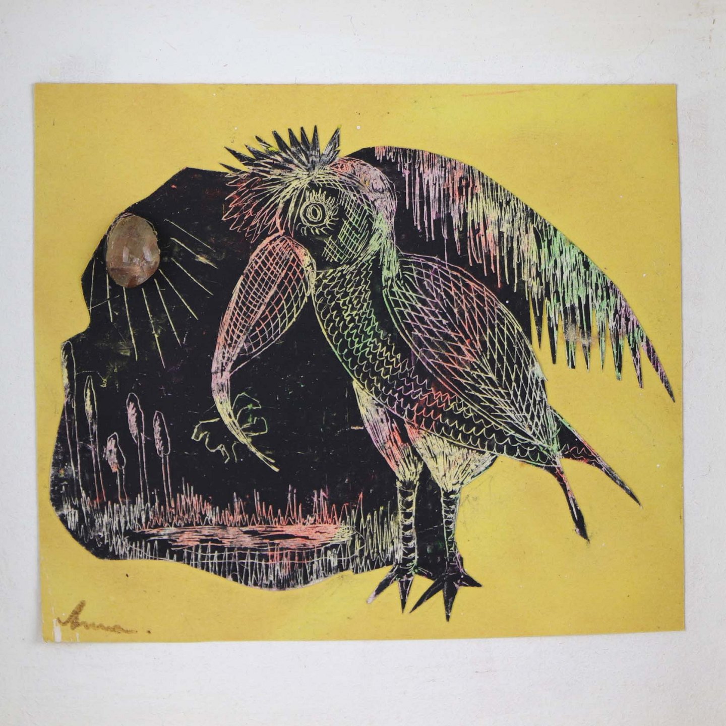 Multifarvet radering på sort baggrund i hvidmalet træramme med motiv af fugl ved sø. Den udklippede radering er monteret på gul baggrund med påsat sten i venstre hjørne.