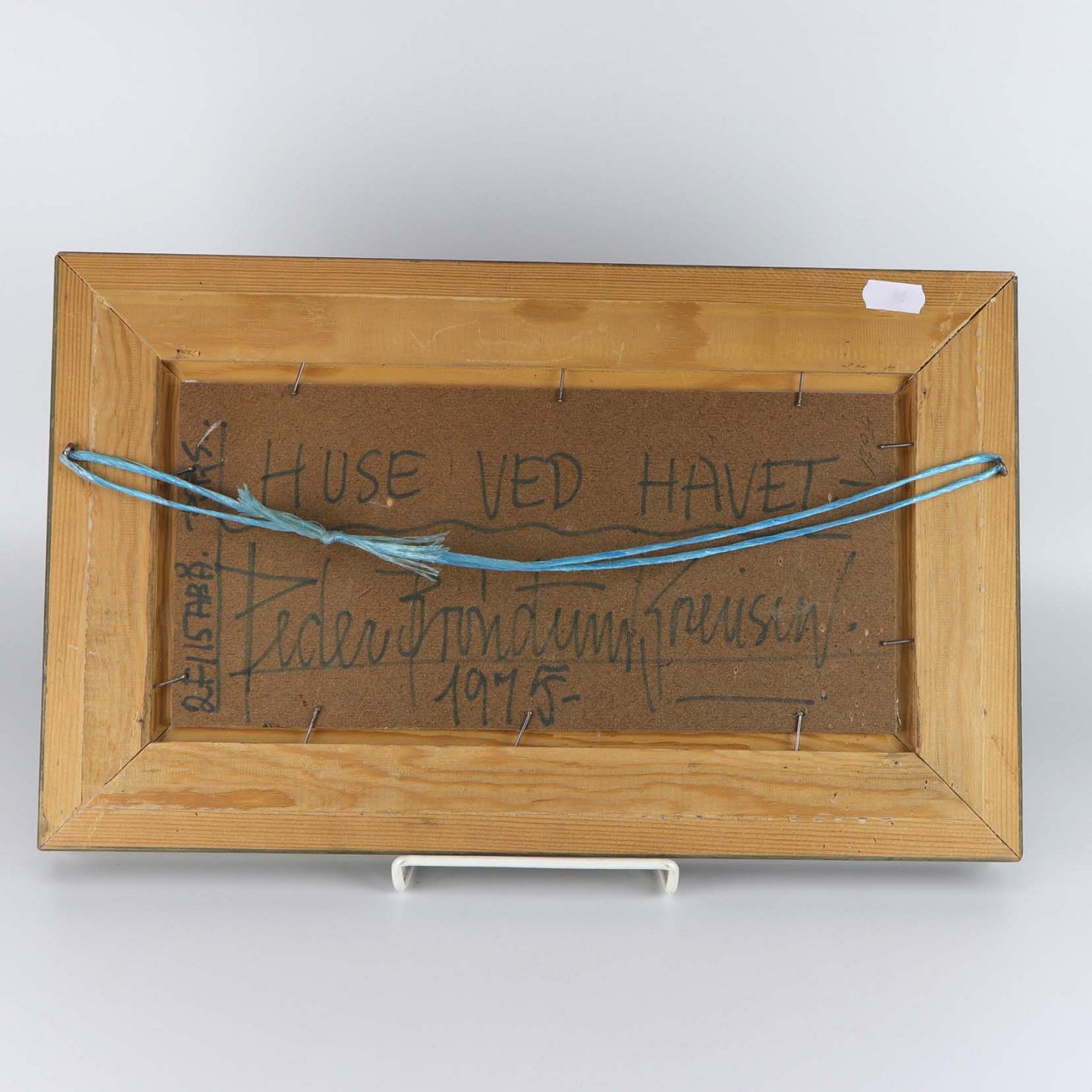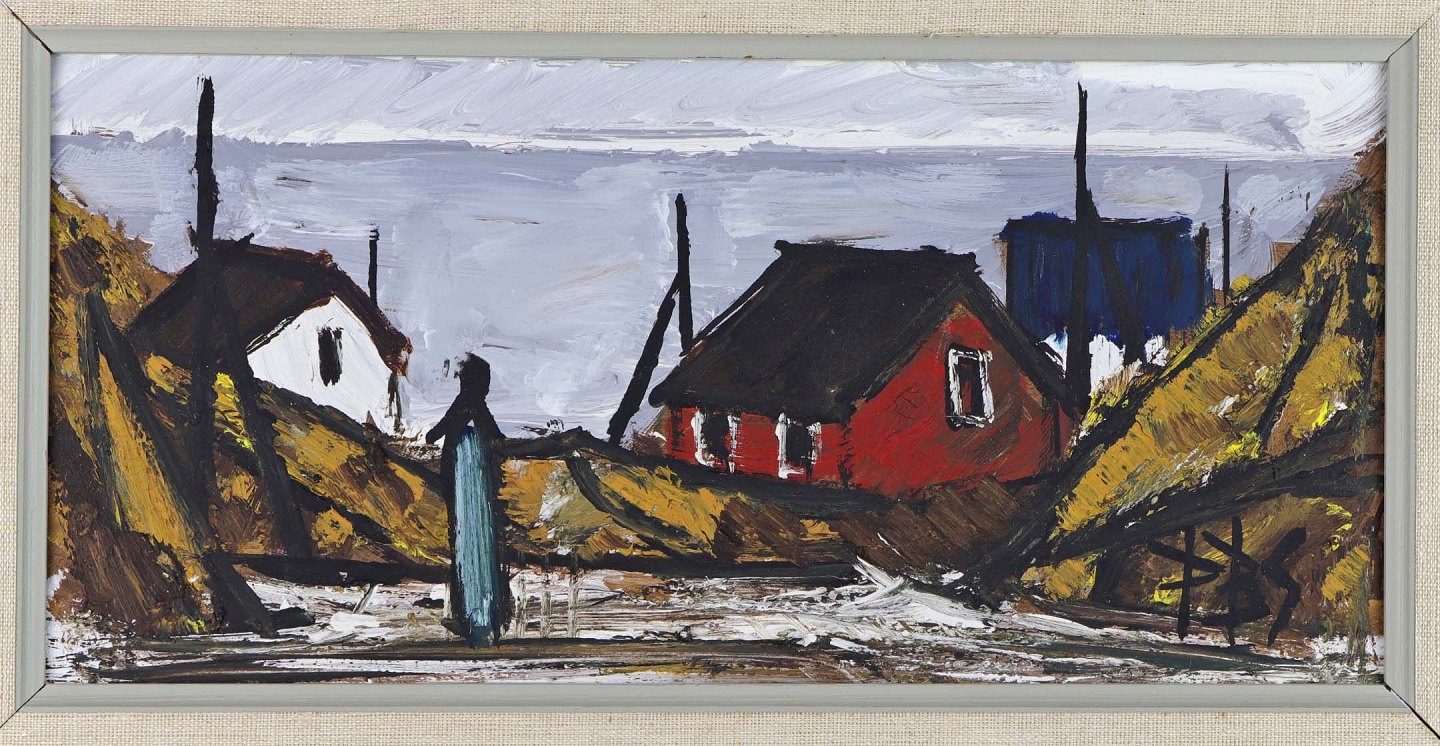 Oliemaleri på plade i træramme med motiv af huse ved hav. Dateret år 1975