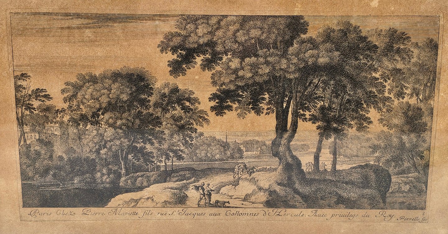 Bogtryk med motiv af landskab med flod, træer og mennesker med hund.
