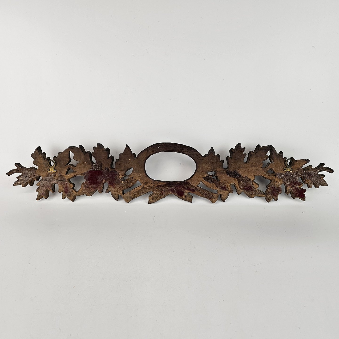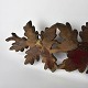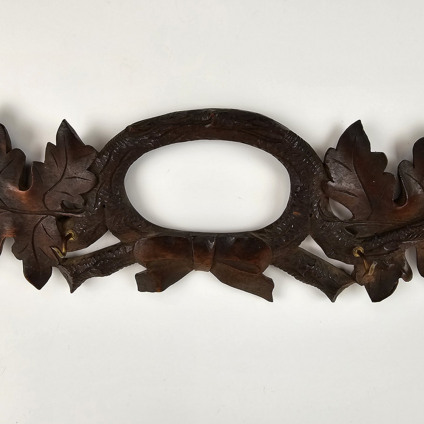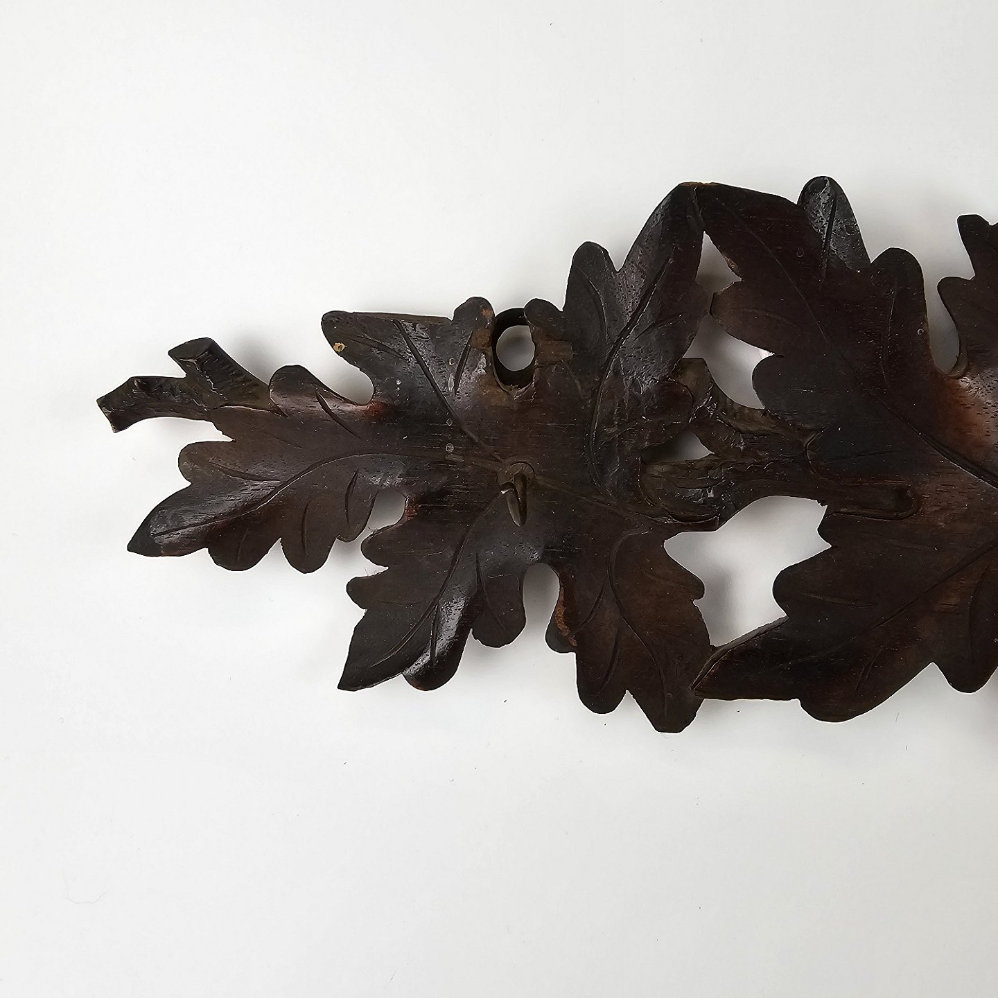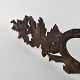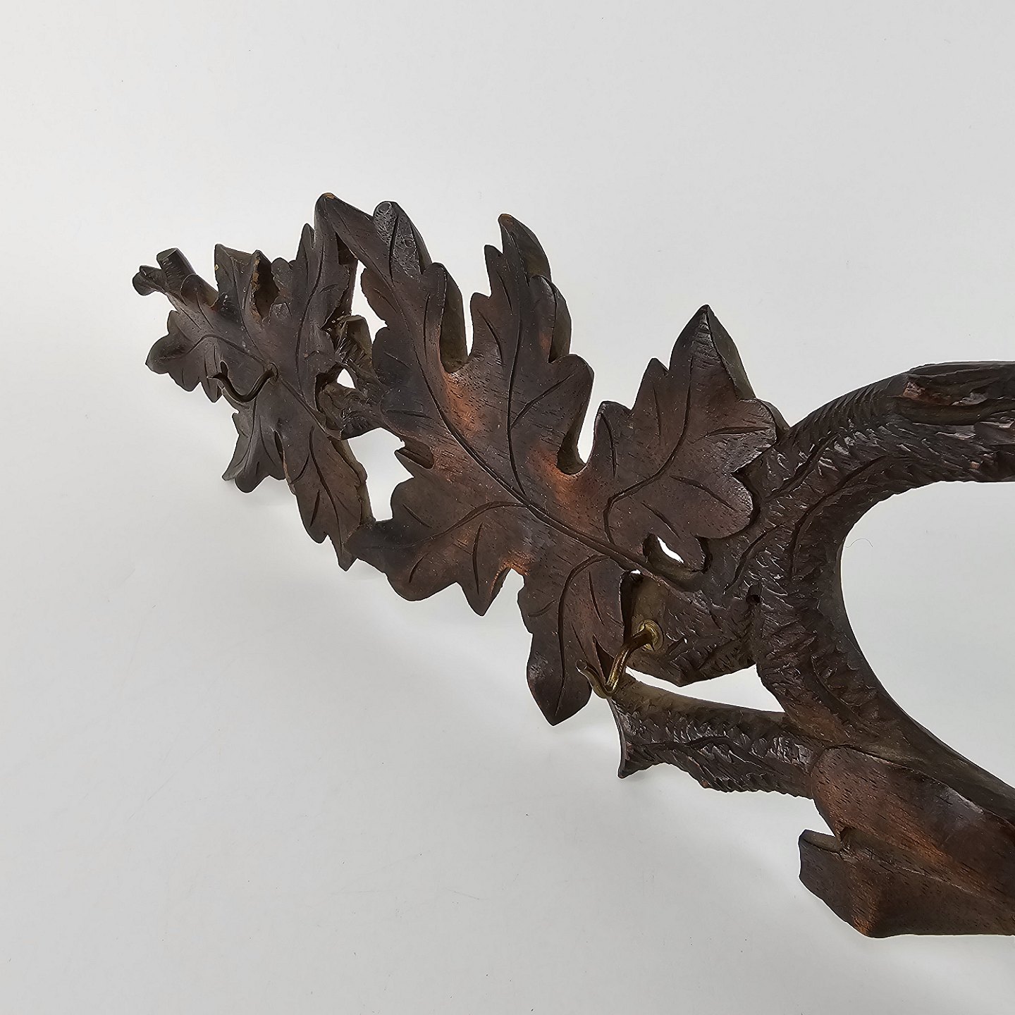 Pibeophæng i mørkt træ, med motiv af grene og blade.
