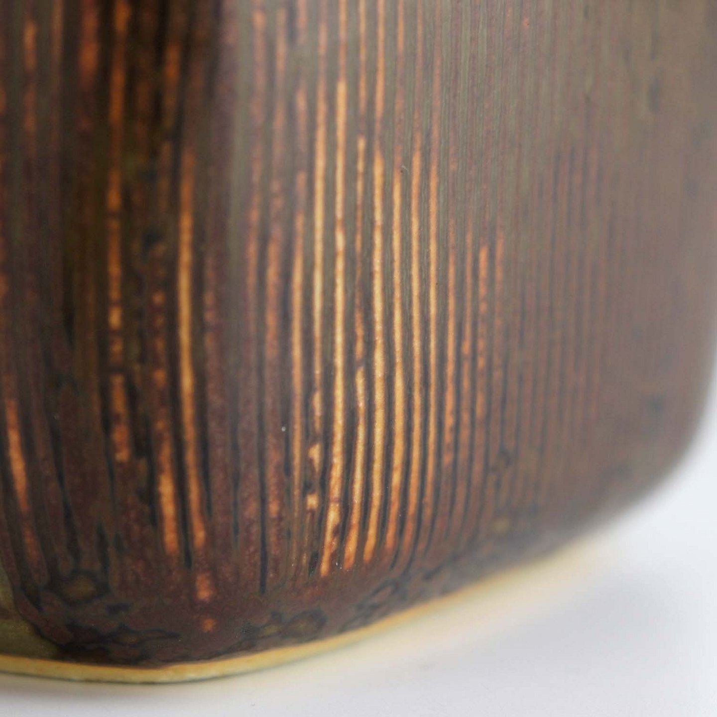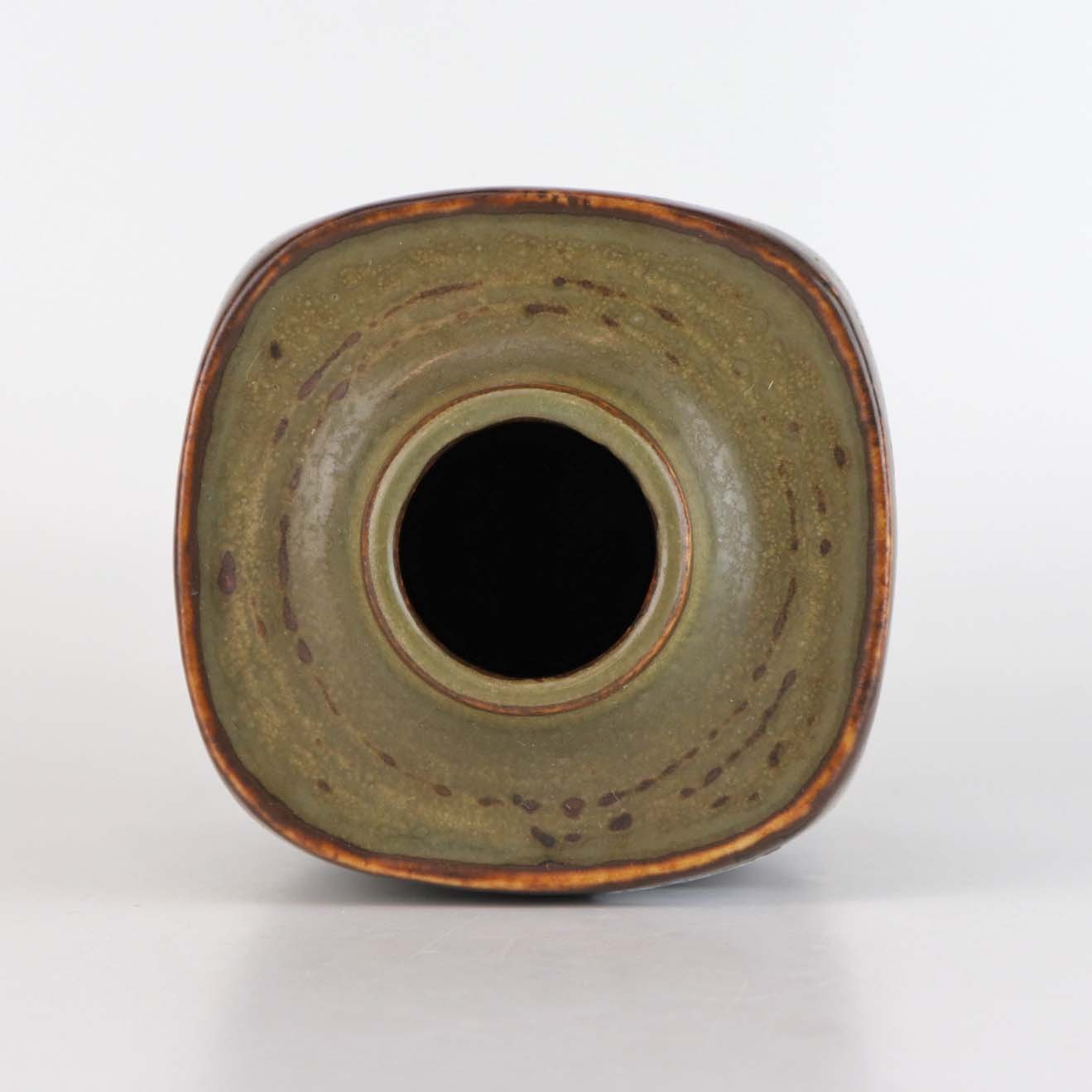 Firkantet vase i brunt stentøj med stribet mønster. Nr. 7223
