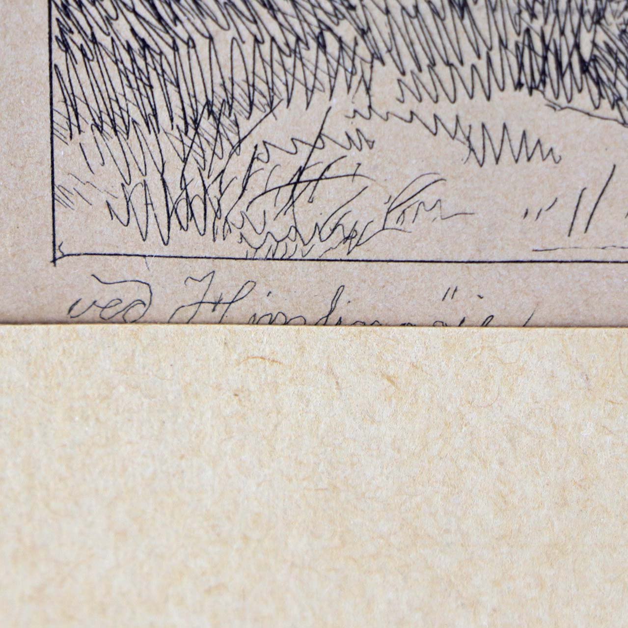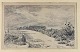 Indrammet antik radering på brunt papir med passepartout i guldmalet træramme og landskabsmotiv med udsigt fra sti.