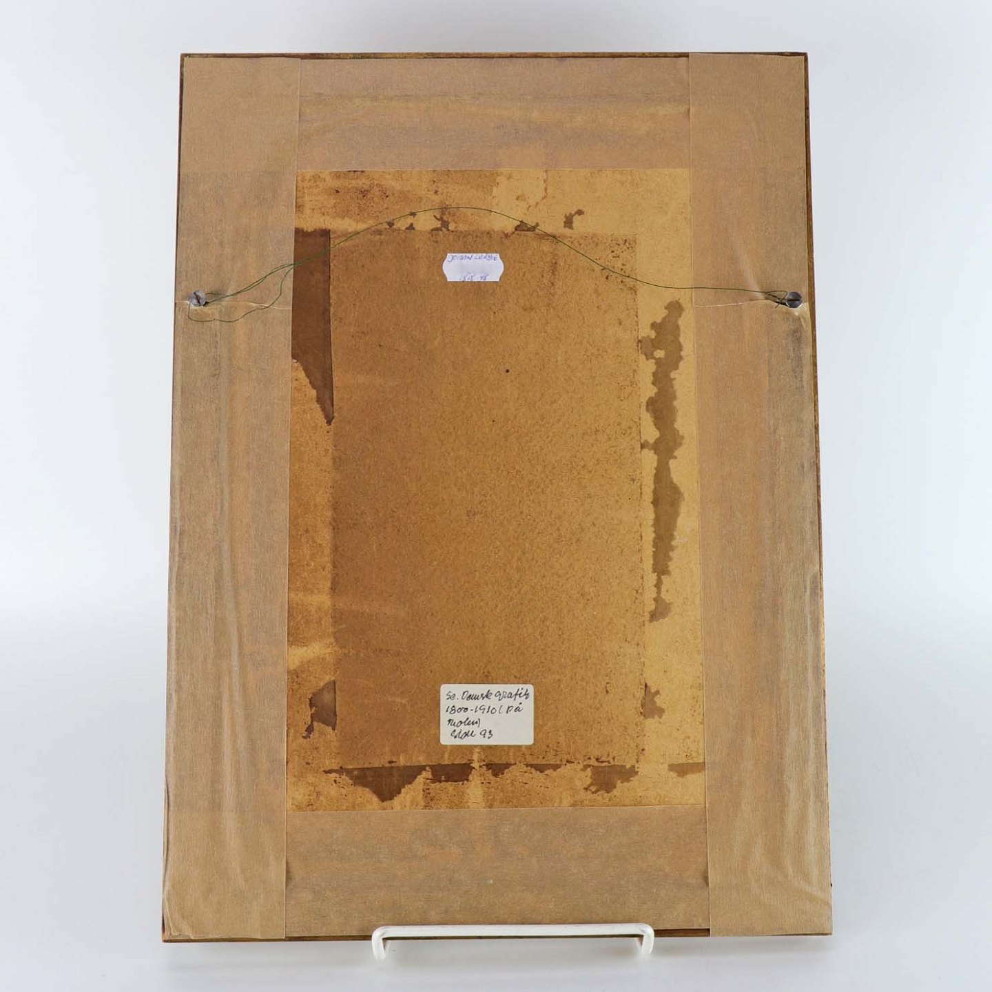 Indrammet ældre radering med passepartout i guldmalet træramme med motiv af ryggen af en kvinde med blomster i favnen og teksten Sakunfala, Skuespil af Kalidasos.