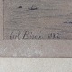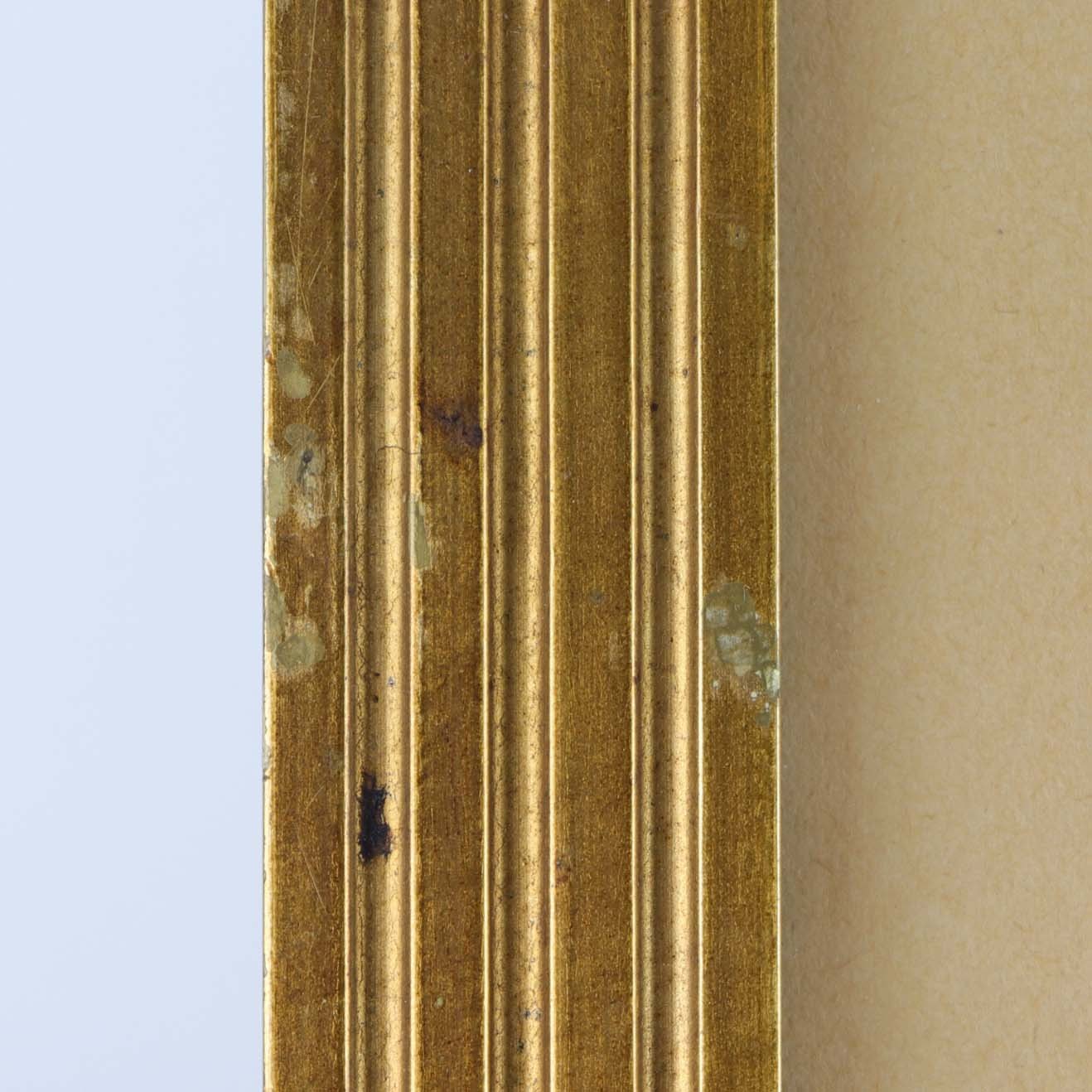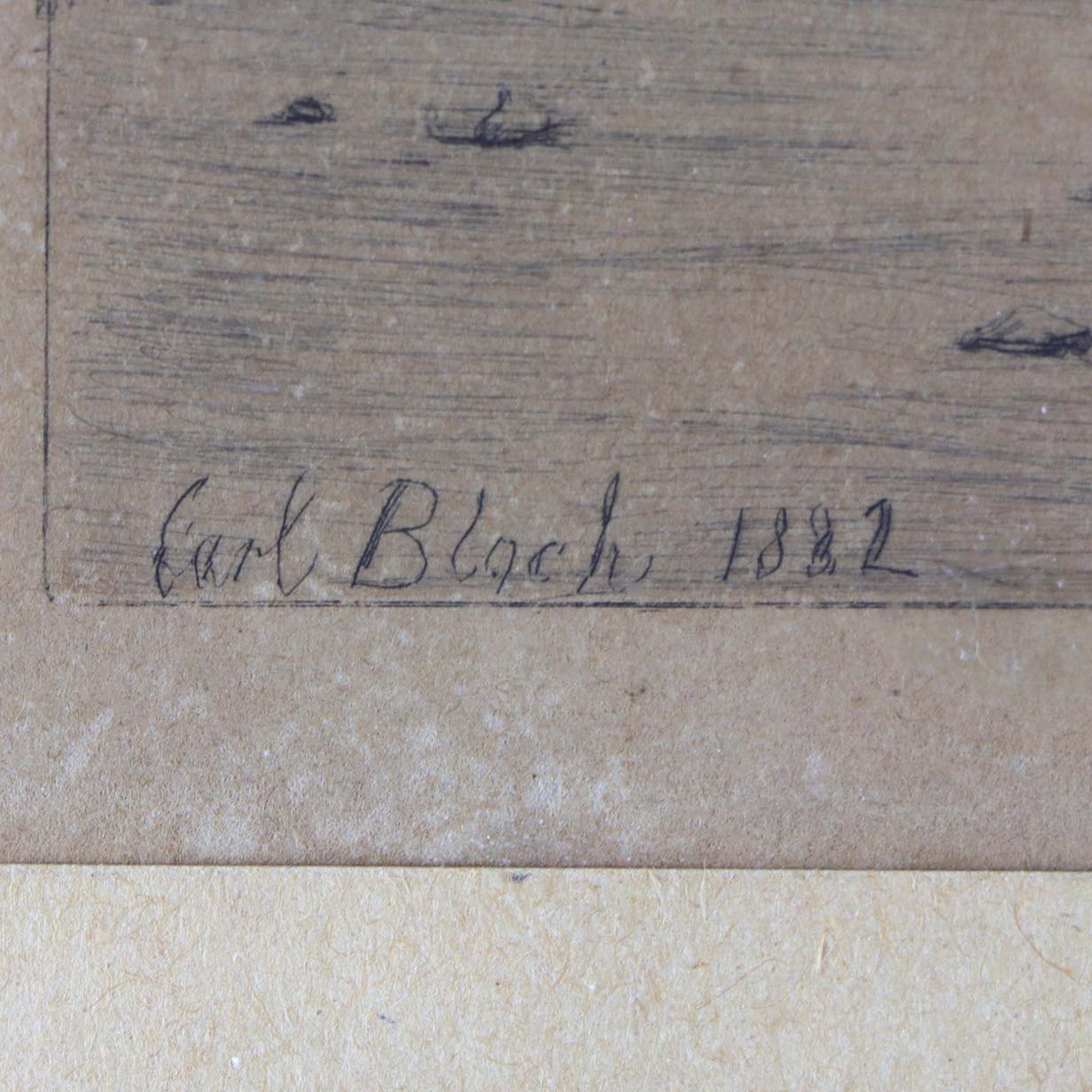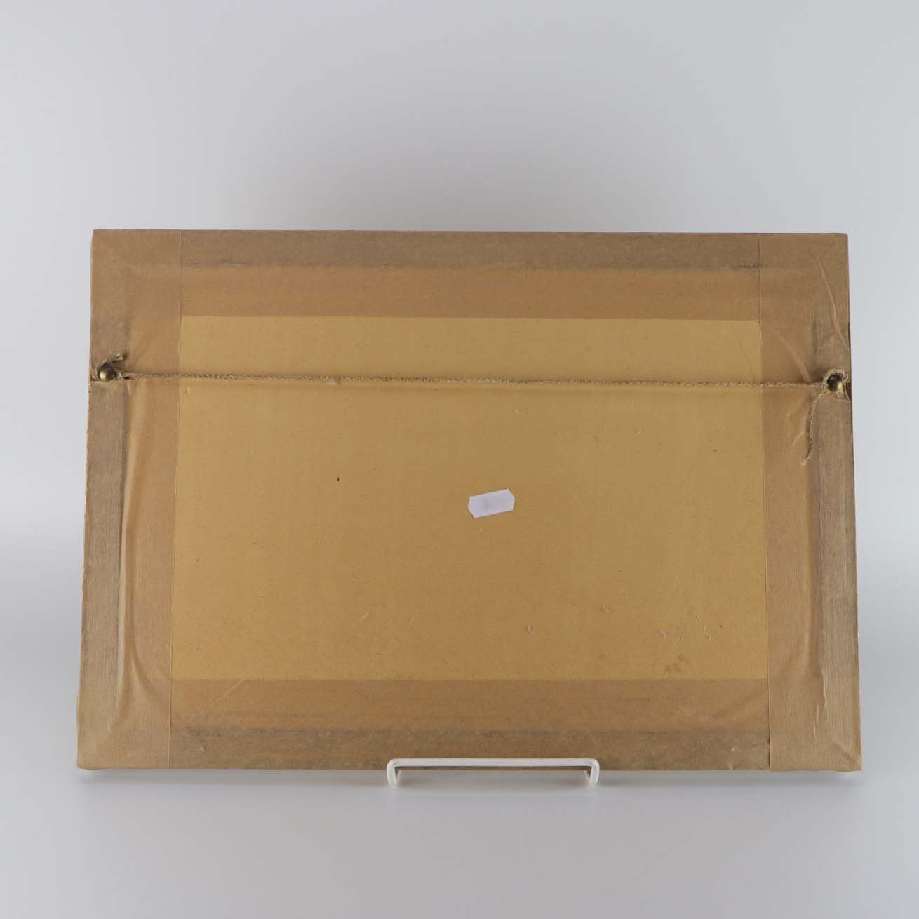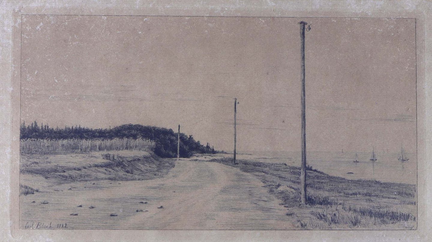 Indrammet radering med passepartout i guldmalet træramme og landskabsmotiv af kystvej med elmaster og sejlbåde på hav.