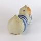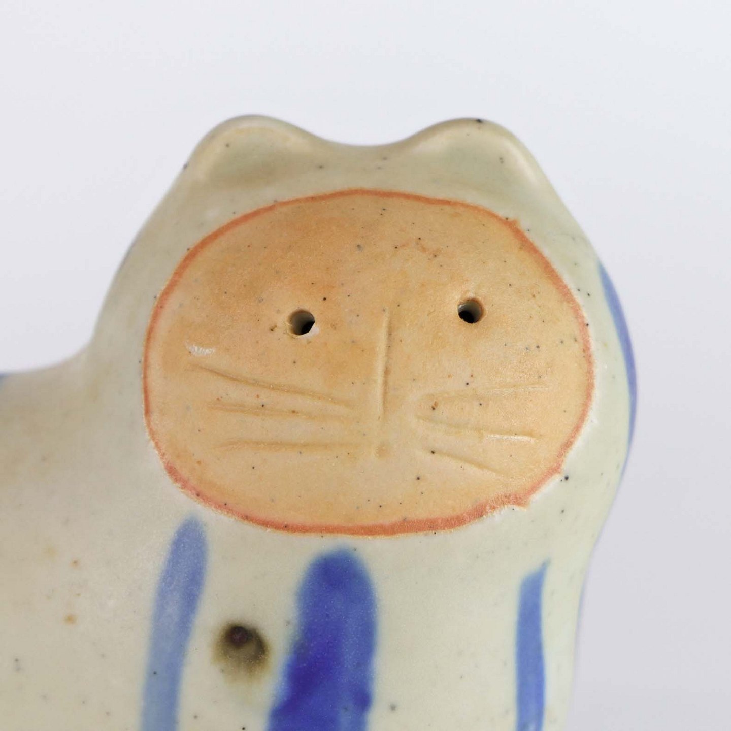 Sparebøsse i stentøj med motiv af blå og hvidstribet kat. Sparebøssen åbnes under bunden med lukning af sort gummi.